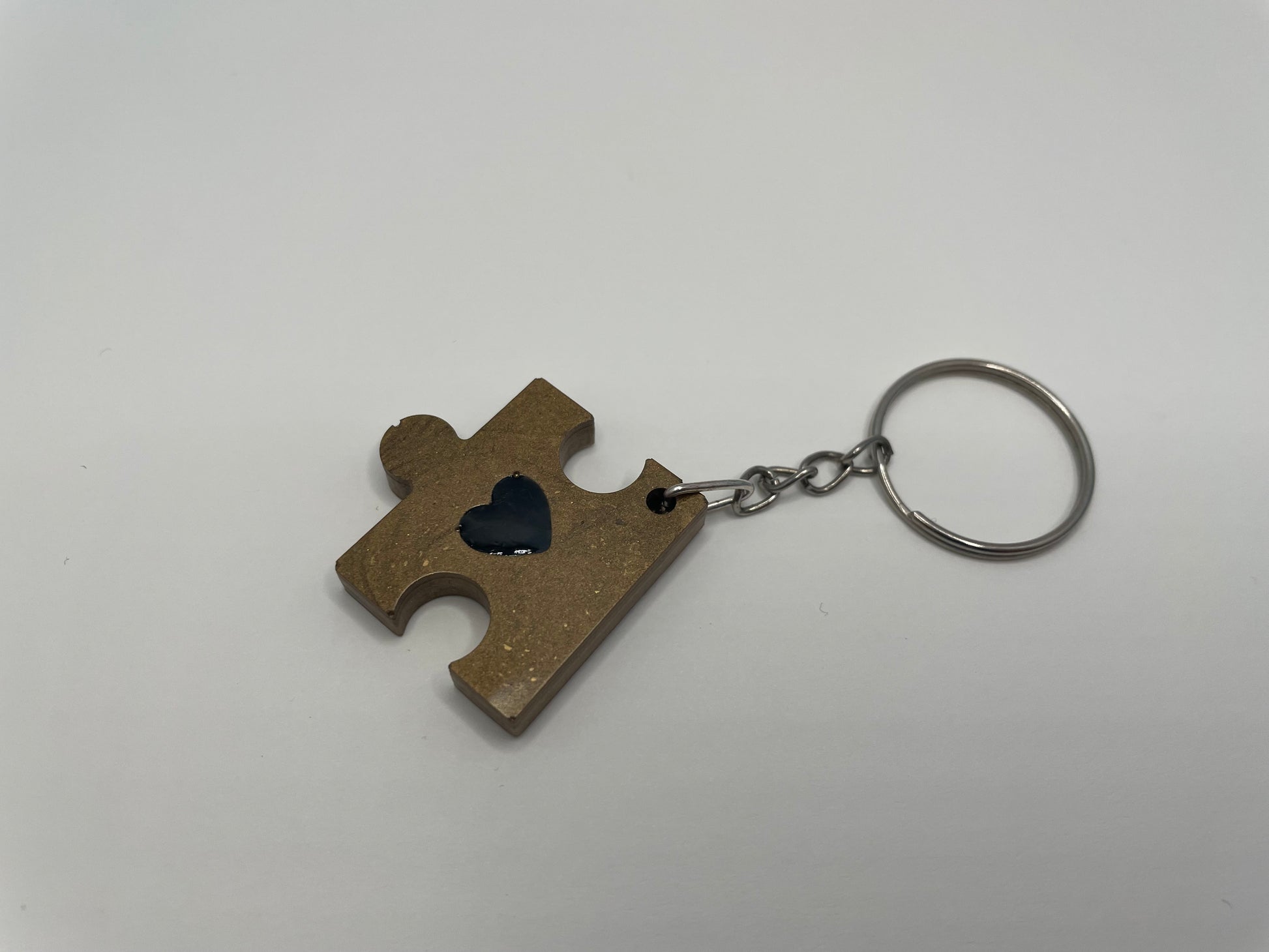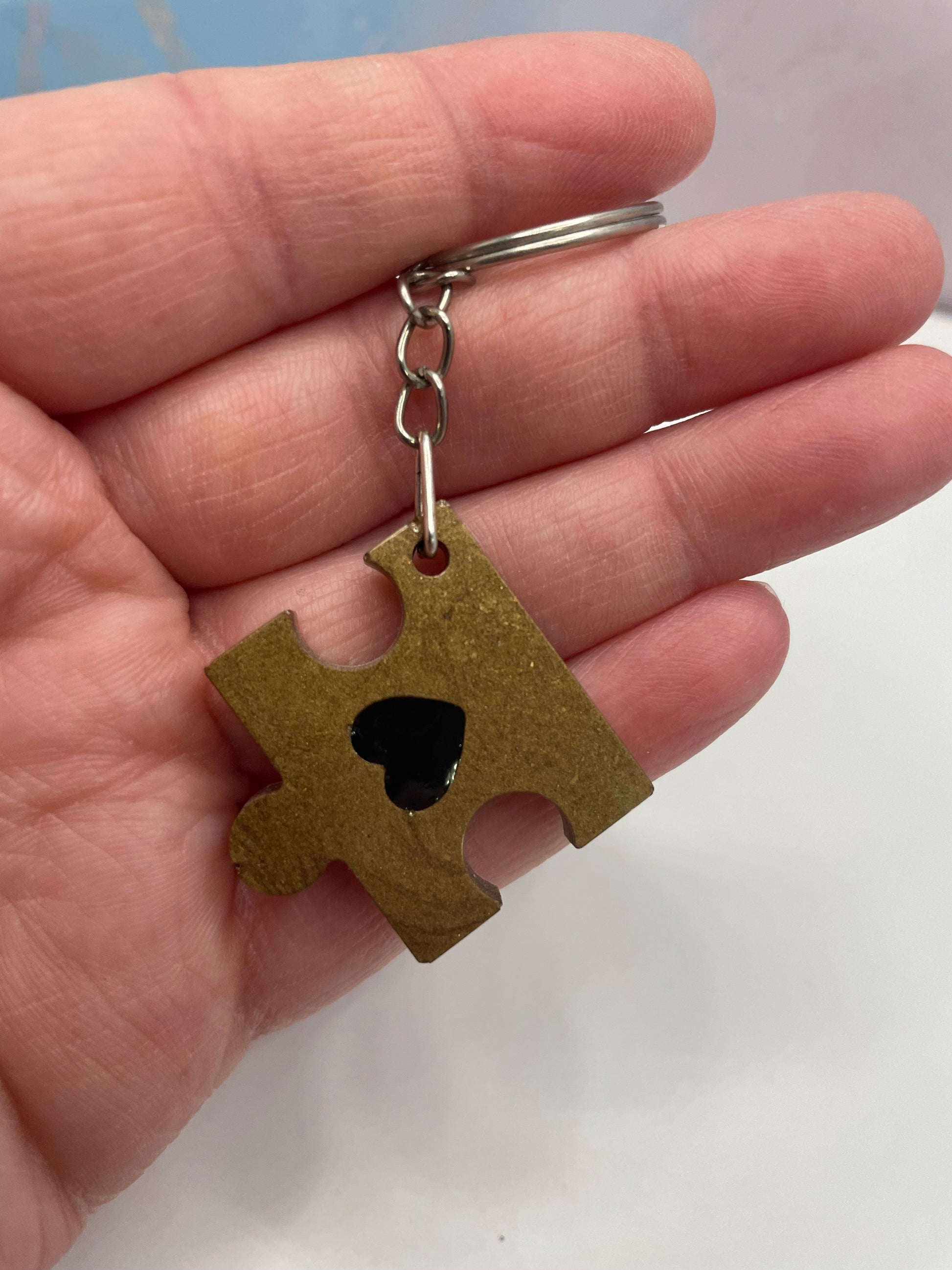 Ce porte-clés en forme casse tete présente une teinte bronze chaleureuse, rehaussée d’un cœur noir brillant. Réalisé à la main avec de la résine et de la poudre de mica, il offre une finition lisse avec un léger éclat subtil.