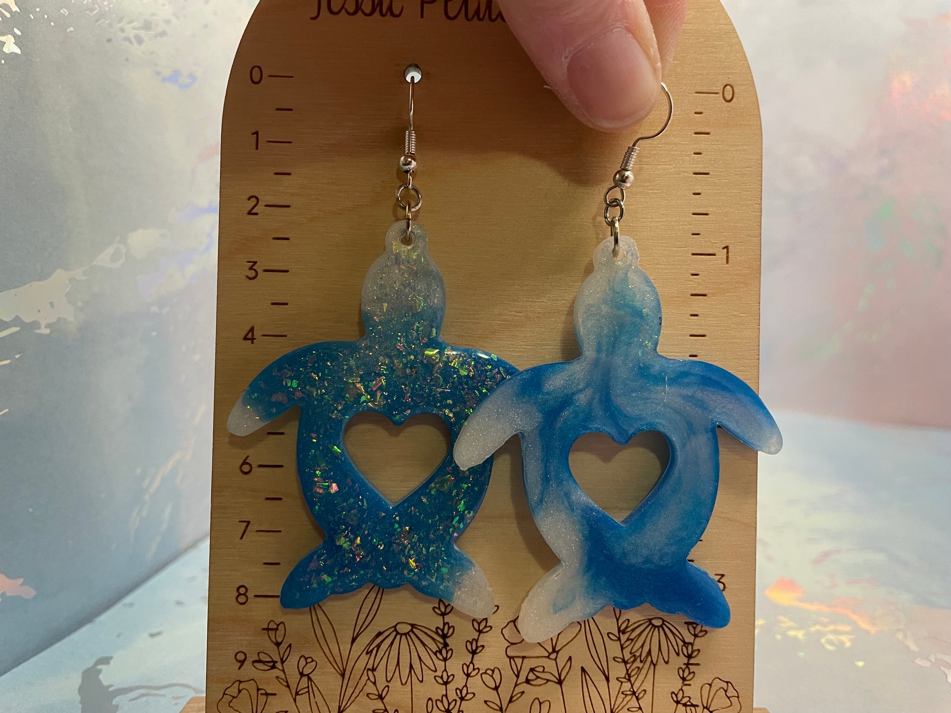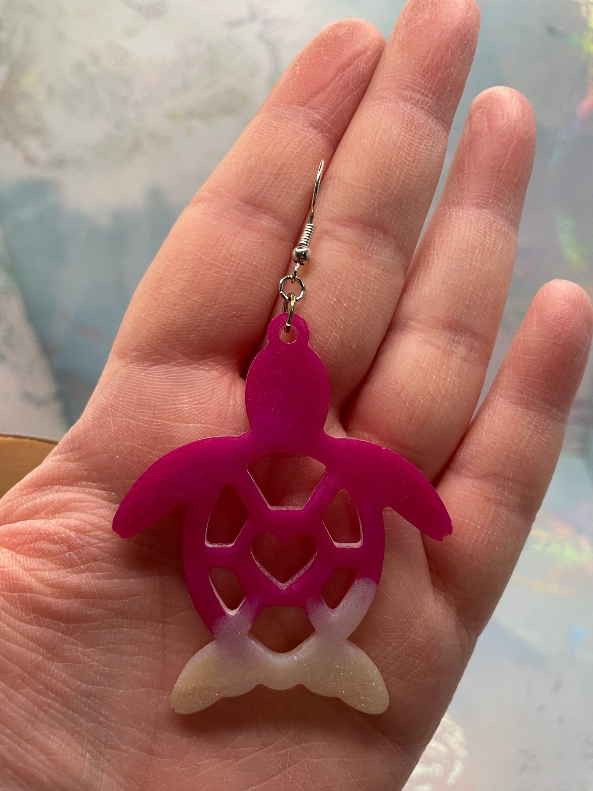 Inspirées par la silhouette douce et reconnaissable de la tortue, ces boucles d’oreilles audacieuses sont fabriquées à la main en résine et rehaussées de brillants obtenus grâce à la poudre de mica et à de subtils éléments scintillants. Chaque tortue présente un cœur ajouré en son centre, ajoutant une touche délicate et originale au design.