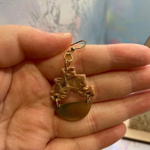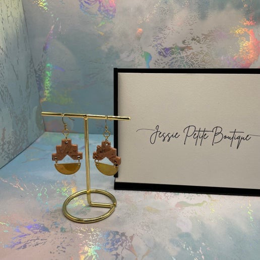 Ces boucles d'oreilles audacieuses et magnifiques arborent un design d'inspiration aztèque, réalisé en argile de couleur or rose, et rehaussé d'un demi-cercle métallique lisse pour un look géométrique saisissant. Elles pendent avec élégance, attirant l'attention par leur alliance unique d'esthétique ancienne et de modernité.