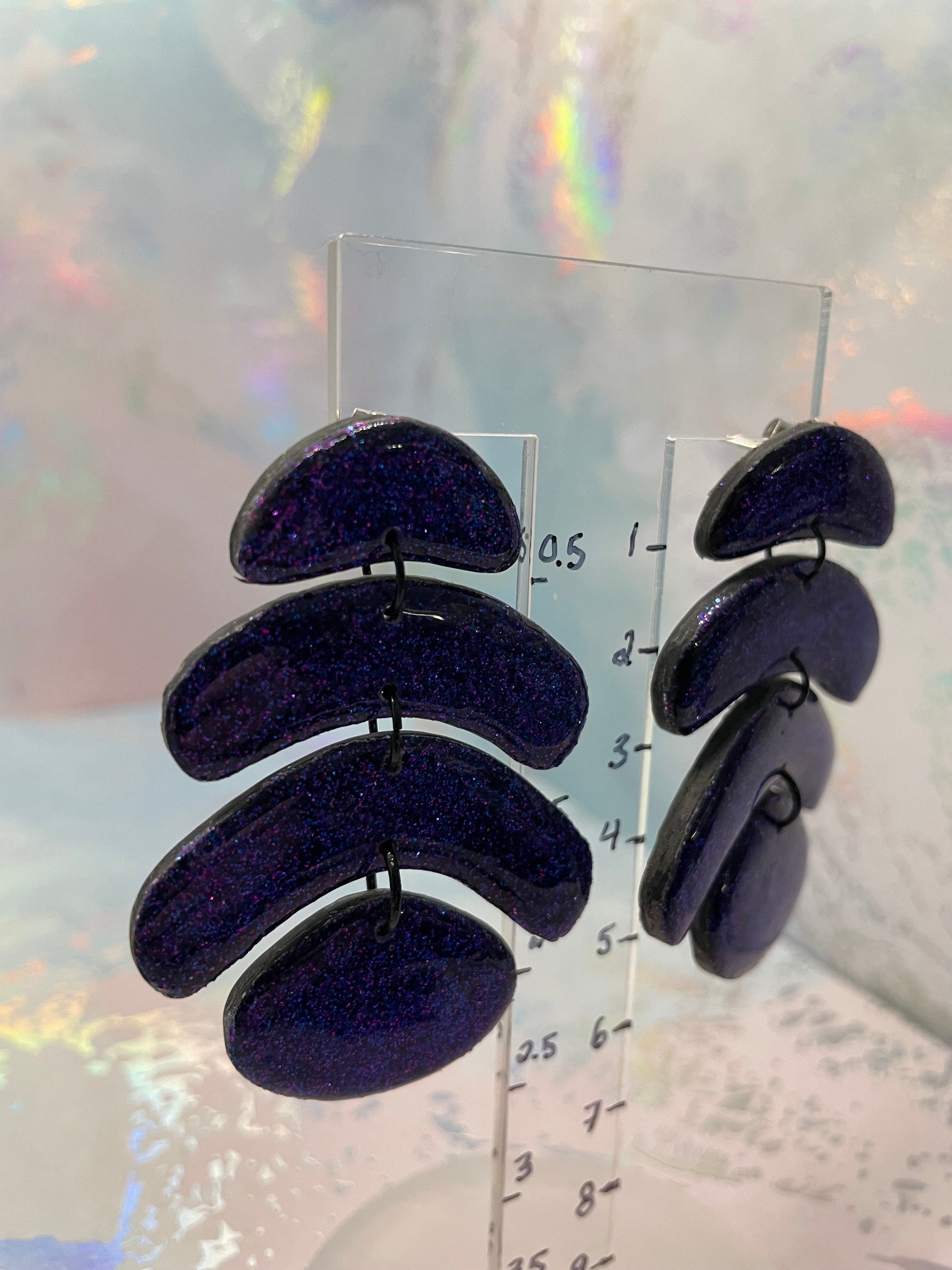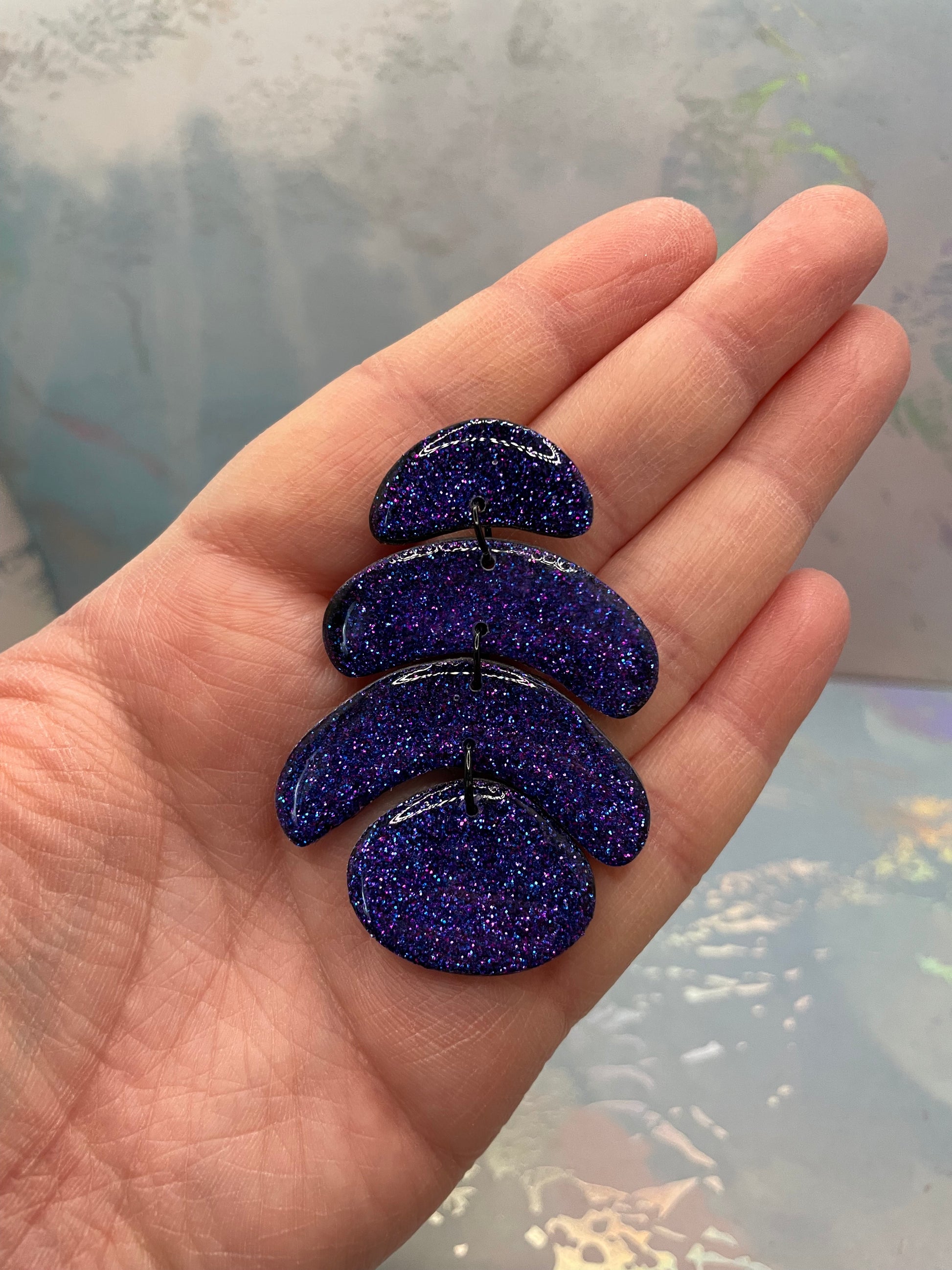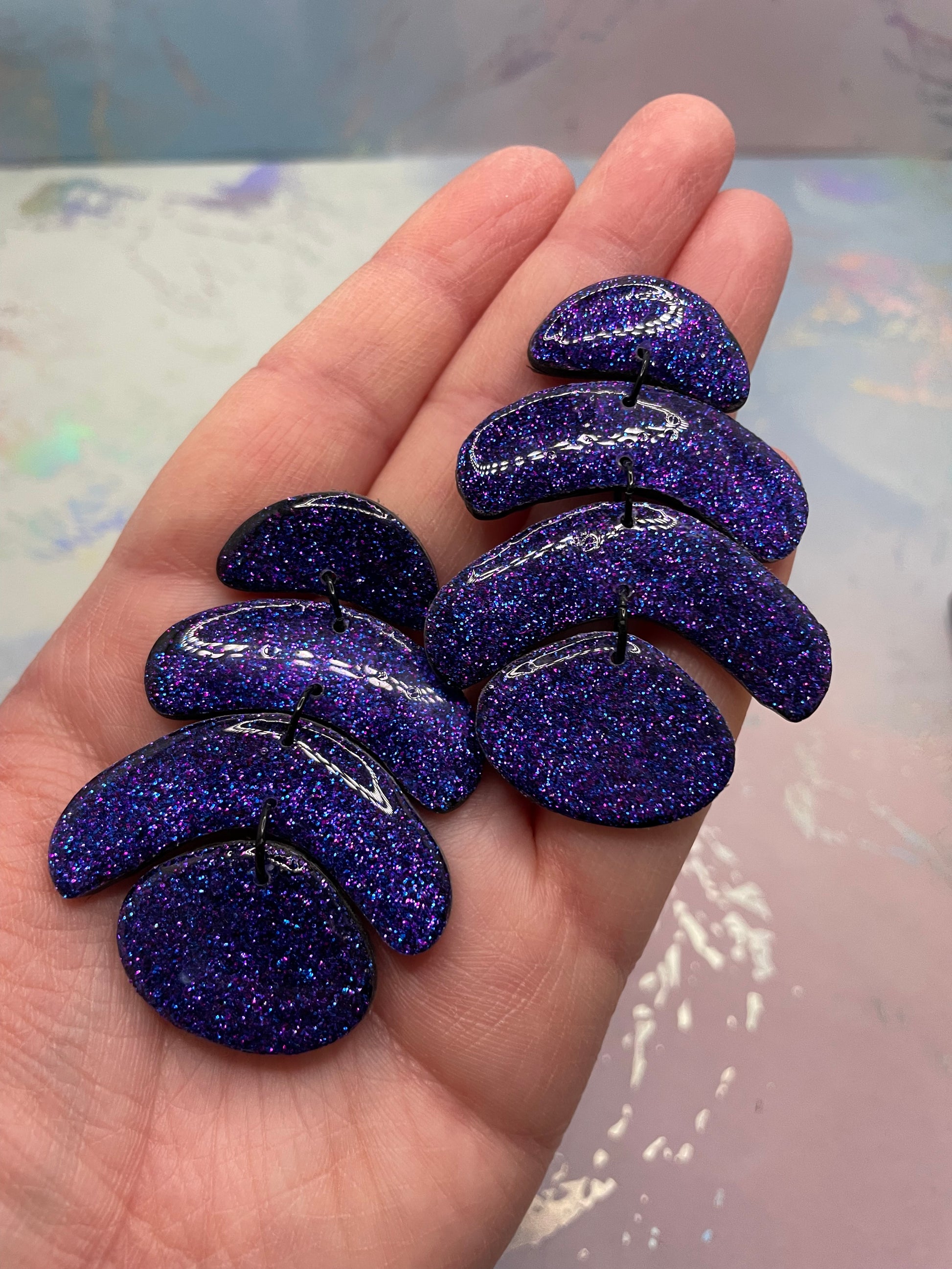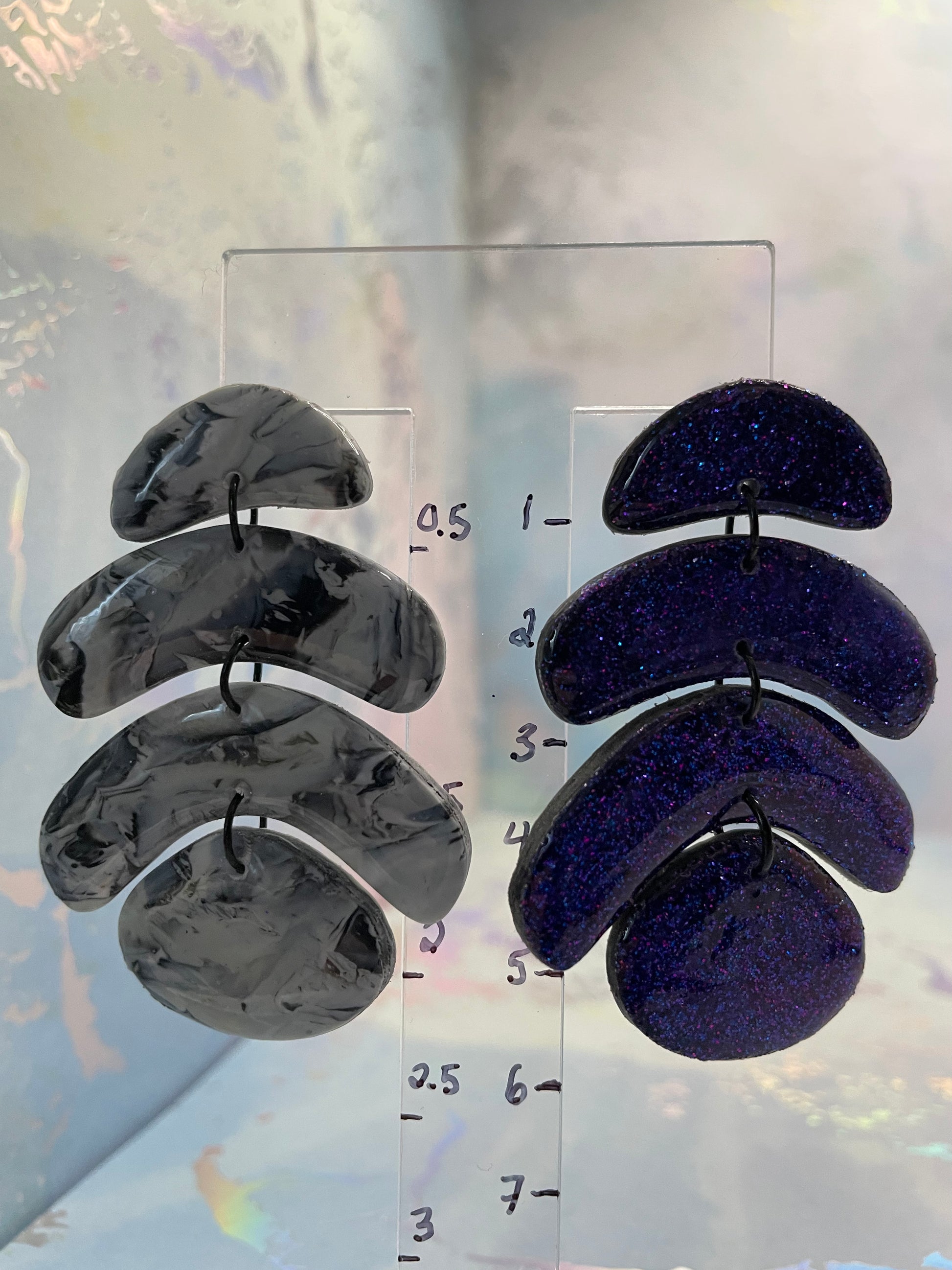 Ces boucles d’oreilles pendantes audacieuses présentent un design sculptural à formes superposées, fabriqué en argile polymère et recouvert d’une finition lisse en résine UV. Offertes en deux options distinctes, elles se déclinent en un mauve foncé aux brillants scintillants ou en un fini marbré gris et noir au style moderne et élégant. Leurs formes courbées et organiques créent un bel effet de mouvement tout en restant agréables à porter.