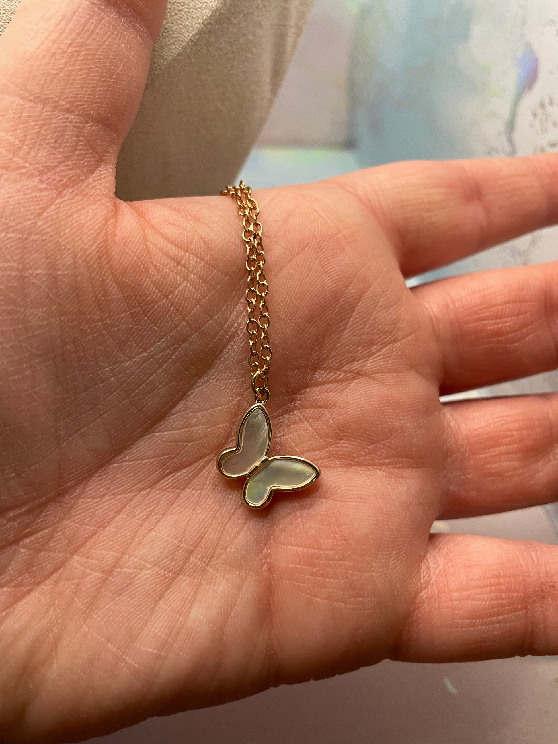 Délicat et féminin, ce collier papillon présente un pendentif en coquillage aux reflets doux, encadré d’une élégante finition dorée. Le léger éclat naturel du coquillage capte la lumière avec subtilité, offrant une allure raffinée et intemporelle.