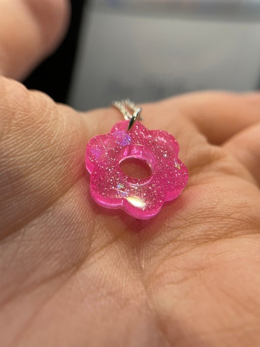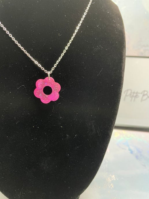 Ajoutez une touche d'élégance et de charme à votre collection de bijoux avec ce petit collier à fleurs roses scintillantes. Ce pendentif en forme de fleur, réalisé en résine, encre à alcool, paillettes et feuille d'aluminium, scintille magnifiquement dans des tons roses scintillants. Accompagné d'une chaîne en argent de 55 cm avec rallonge, ce collier sans nickel offre polyvalence et confort.