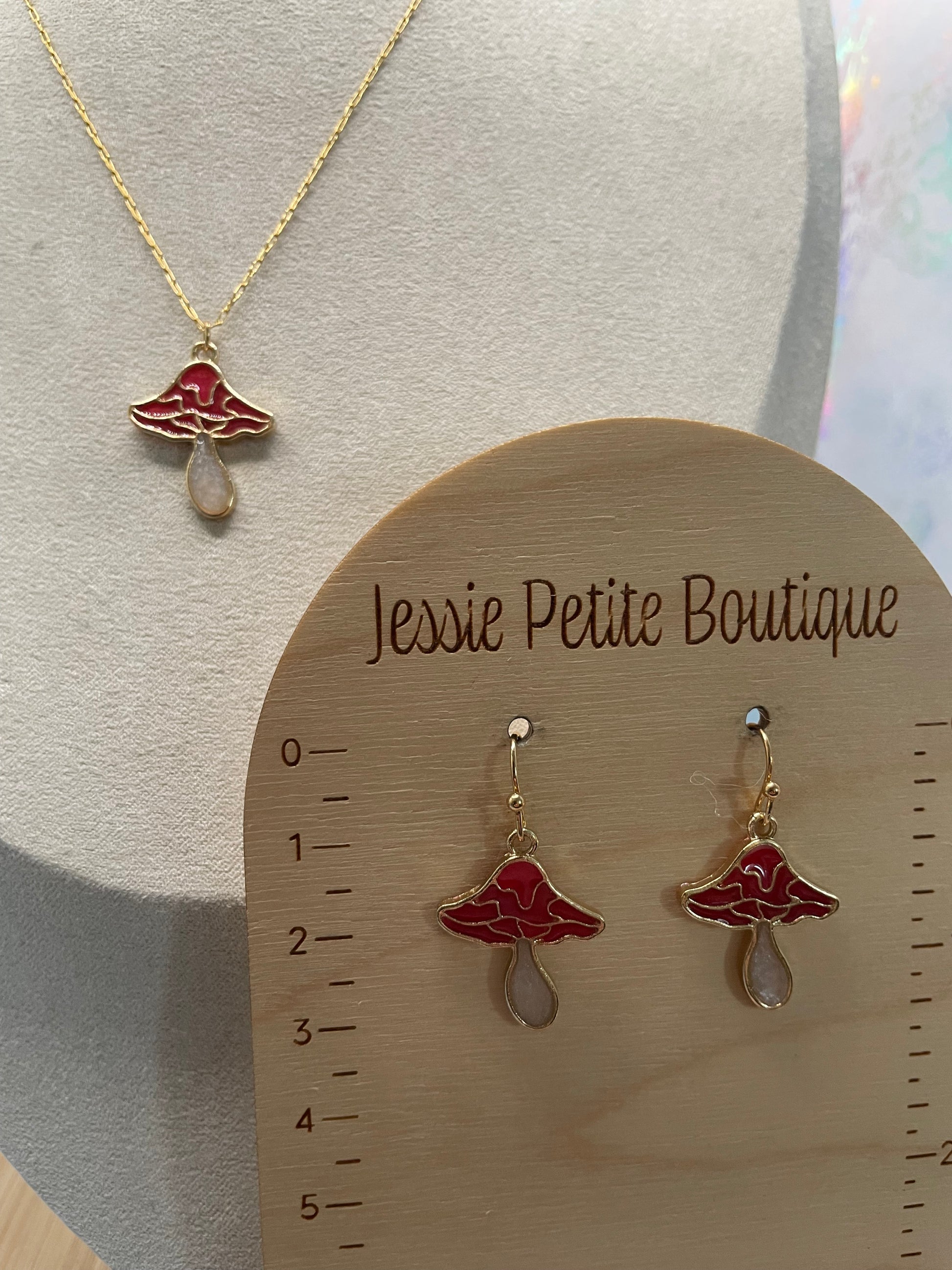 Cet ensemble délicat met en valeur un joli motif de champignon rouge au design doux et organique. Le pendentif et les boucles d’oreilles assorties présentent un léger effet scintillant, mariant des tons dorés, rouges et blancs pour un rendu à la fois ludique et raffiné.