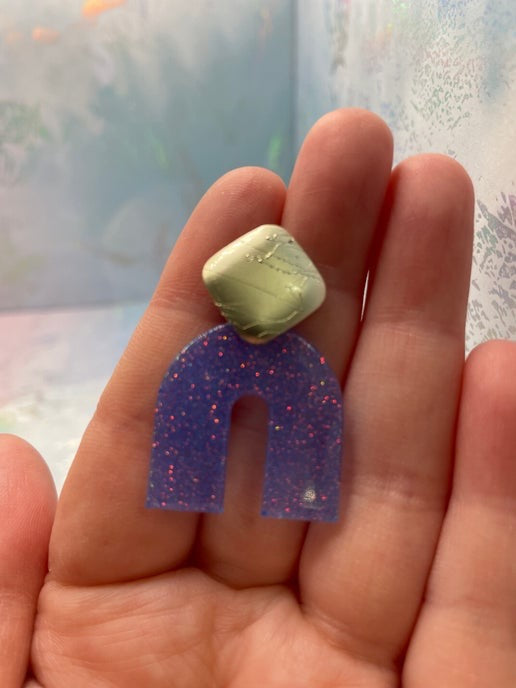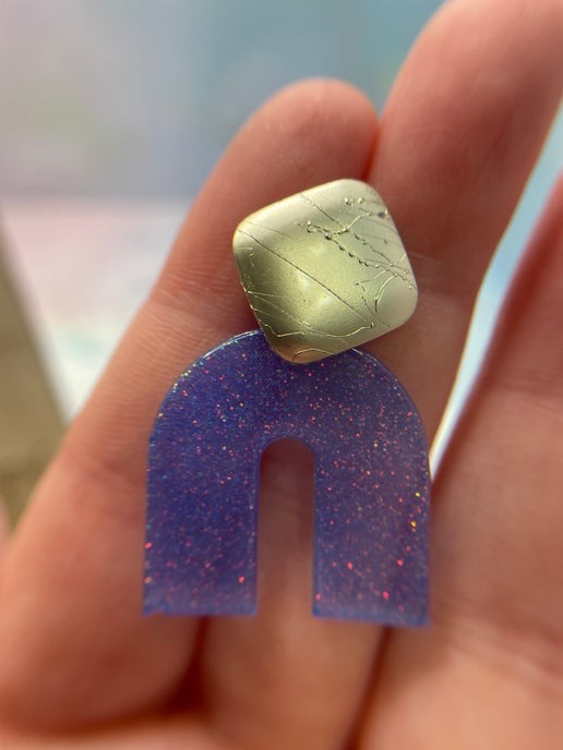 Ajoutez une touche d'élégance éclatante à votre collection avec nos boucles d'oreilles arche brillante. Ces boucles d'oreilles arborent une forme d'arche vibrante ornée de paillettes bleues et violettes qui captent magnifiquement la lumière, créant un éclat envoûtant.