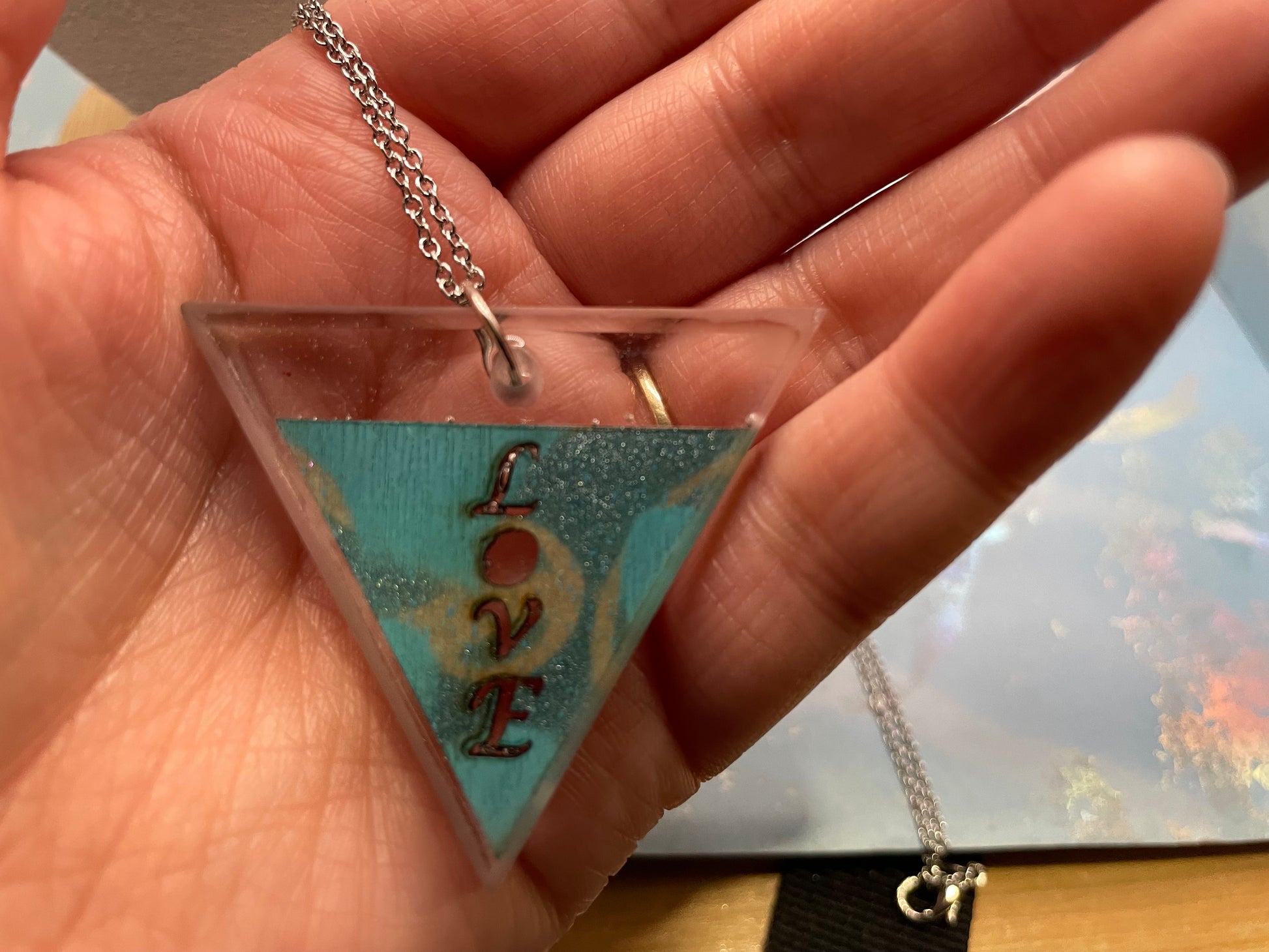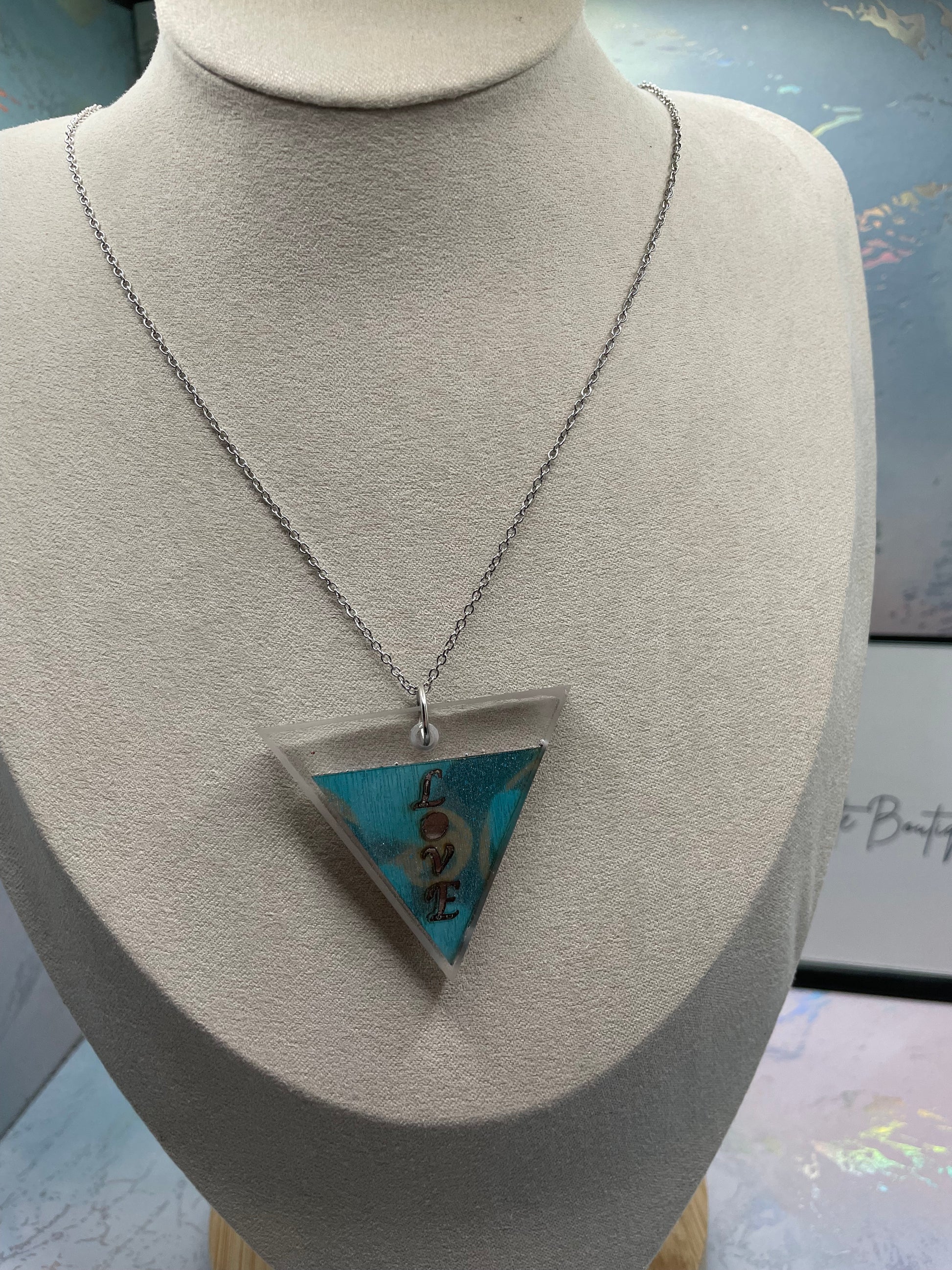 Célébrez l'amour et la créativité avec ce superbe collier à pendentif triangulaire. Ce pendentif présente un design en résine transparente, rehaussé d'une pièce centrale en bois gravée du mot « LOVE ». L'association de couleurs claires, scintillantes et vibrantes crée une pièce unique et accrocheuse. Ce pendentif est élégamment suspendu à une chaîne en argent sans nickel de 27 pouces(68 cm) avec un fermoir mousqueton sécurisé.