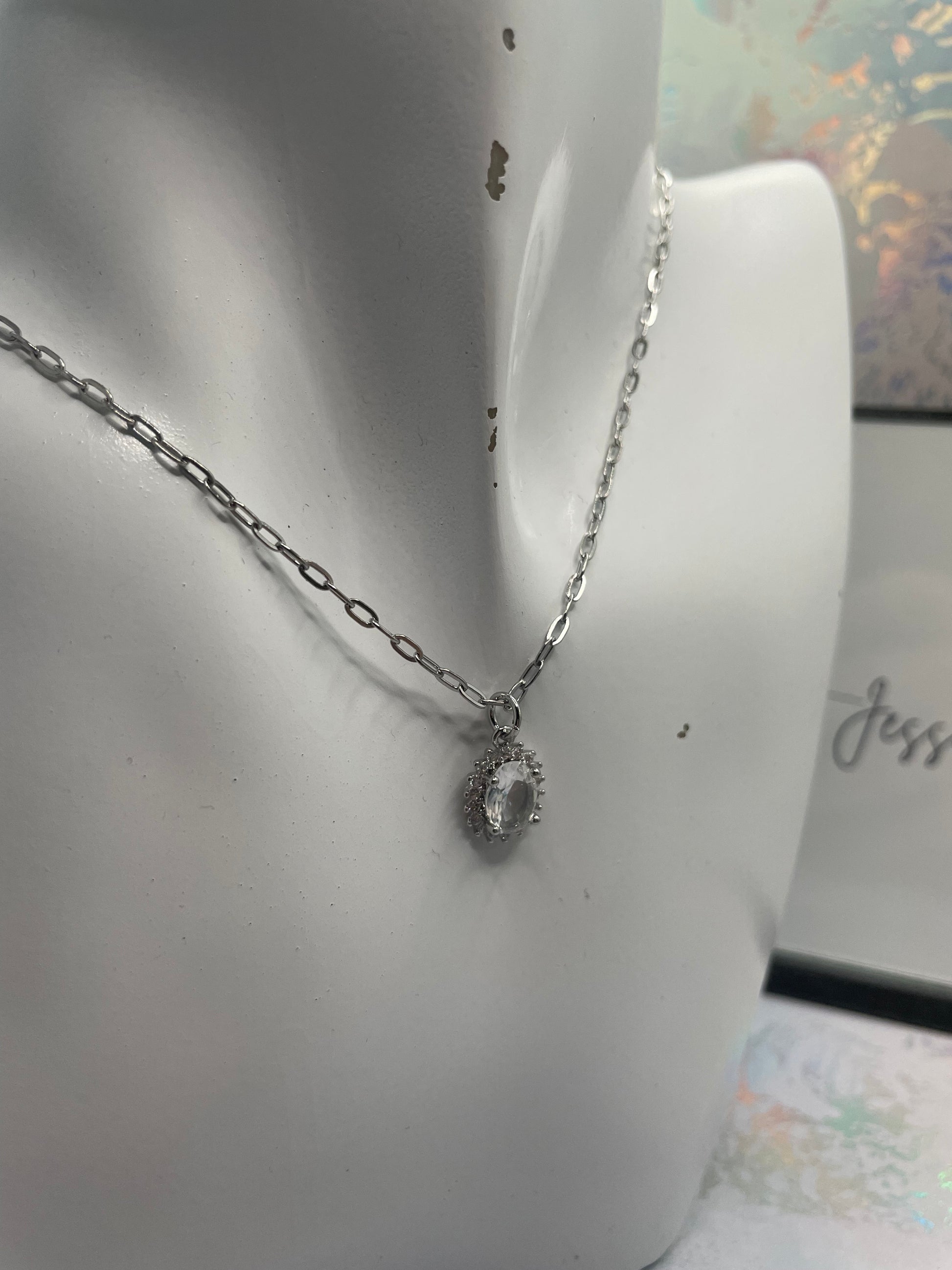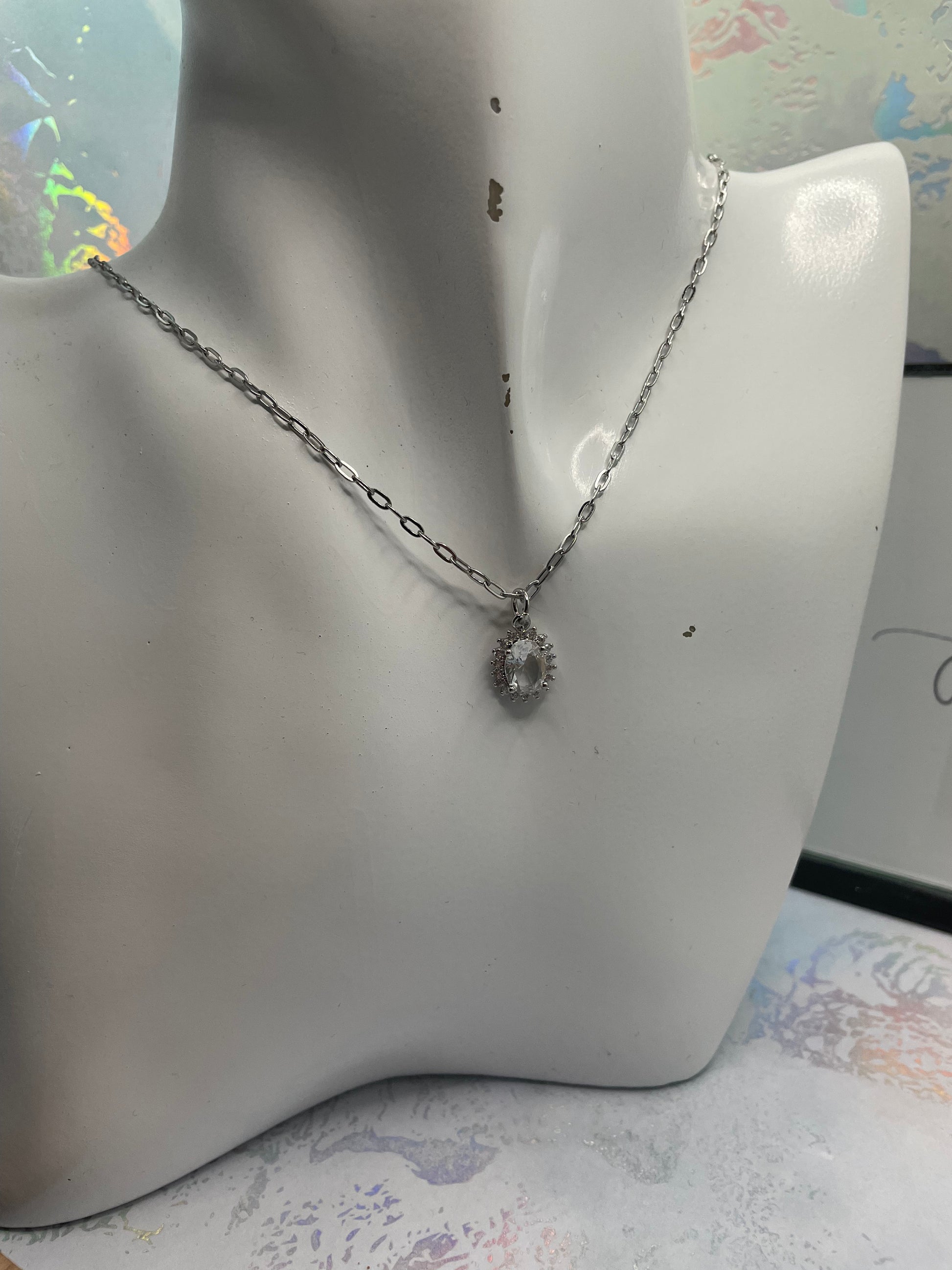 Ajoutez de l'élégance à votre look avec cet ensemble collier et boucles d'oreilles ovale de zircone cubique, conçu pour scintiller et captiver. Cet ensemble comprend un pendentif magnifiquement conçu et des boucles d'oreilles assorties, chacune ornée de zircone cubique entouré de détails en argent raffinés. Le pendentif ovale, mesurant 1 cm de largeur et 1,4 cm de hauteur, est monté sur une chaîne de 20 pouces (50 cm) avec une finition argentée, tout en restant sans nickel et confortable.