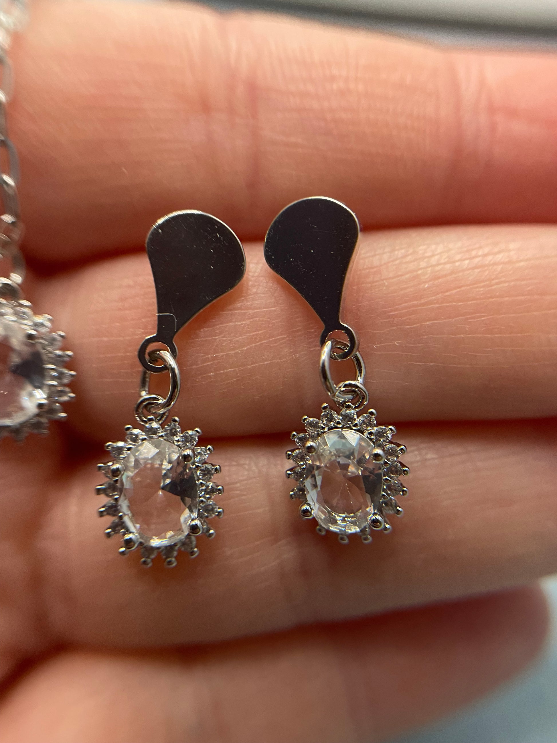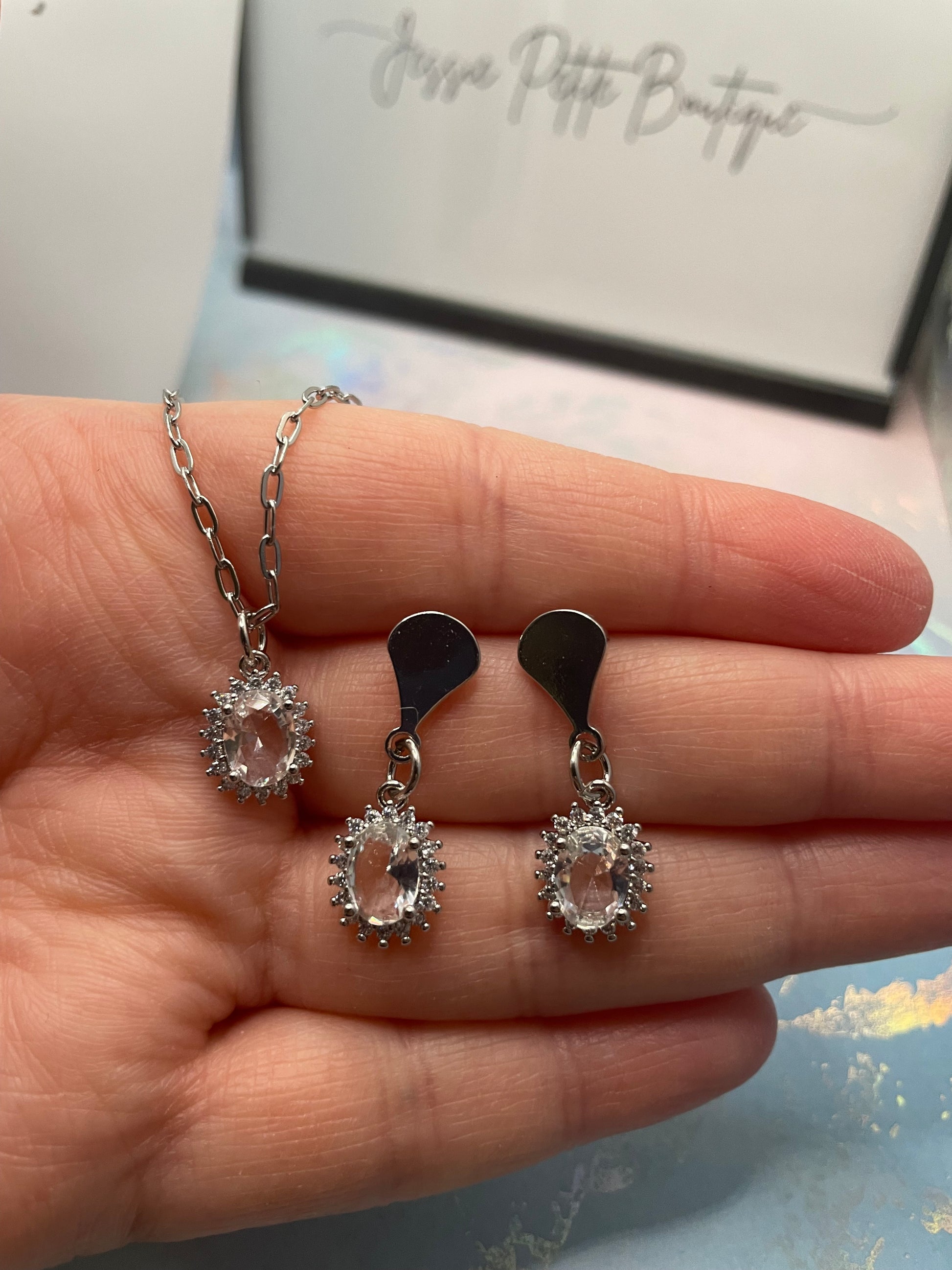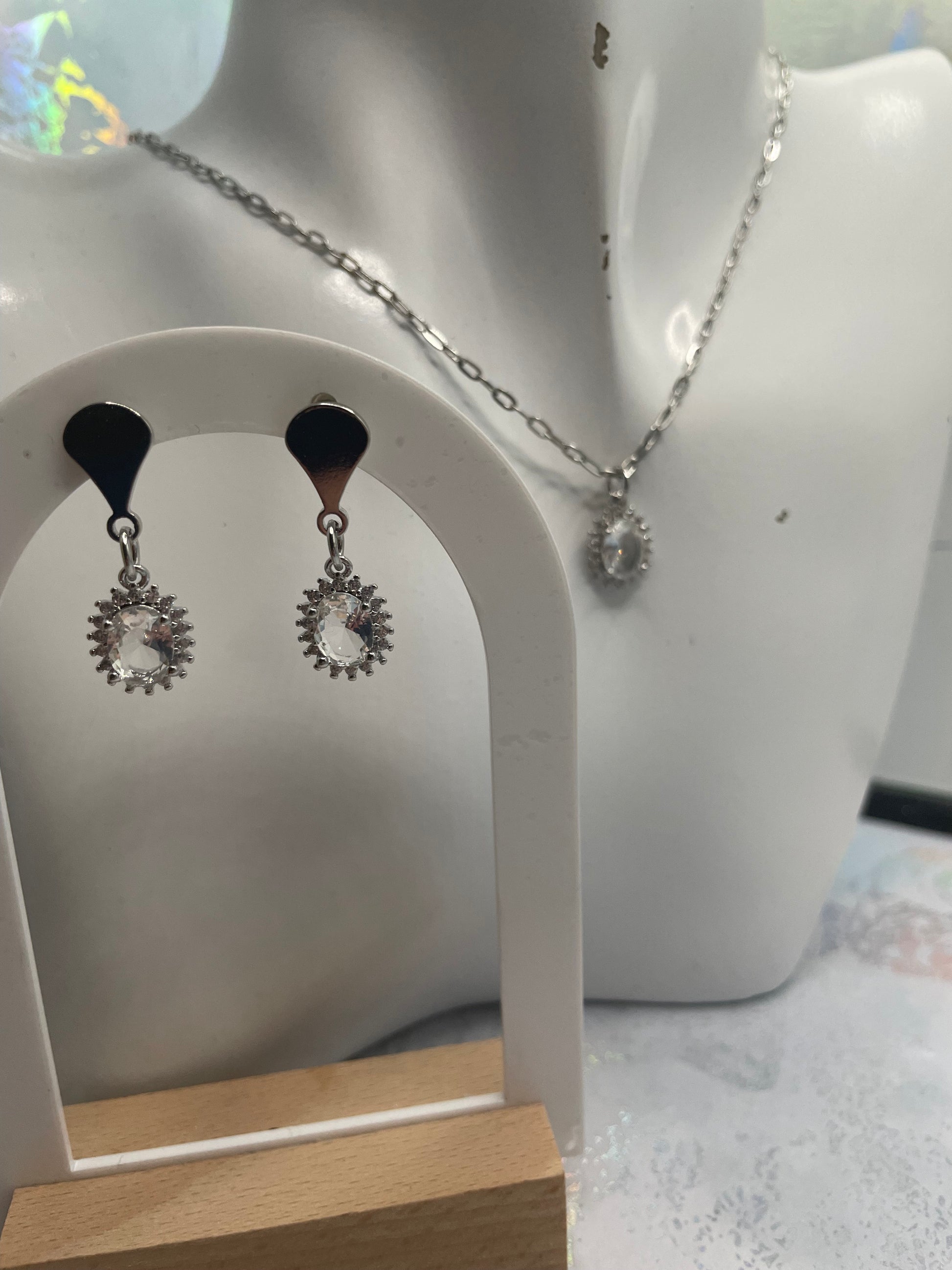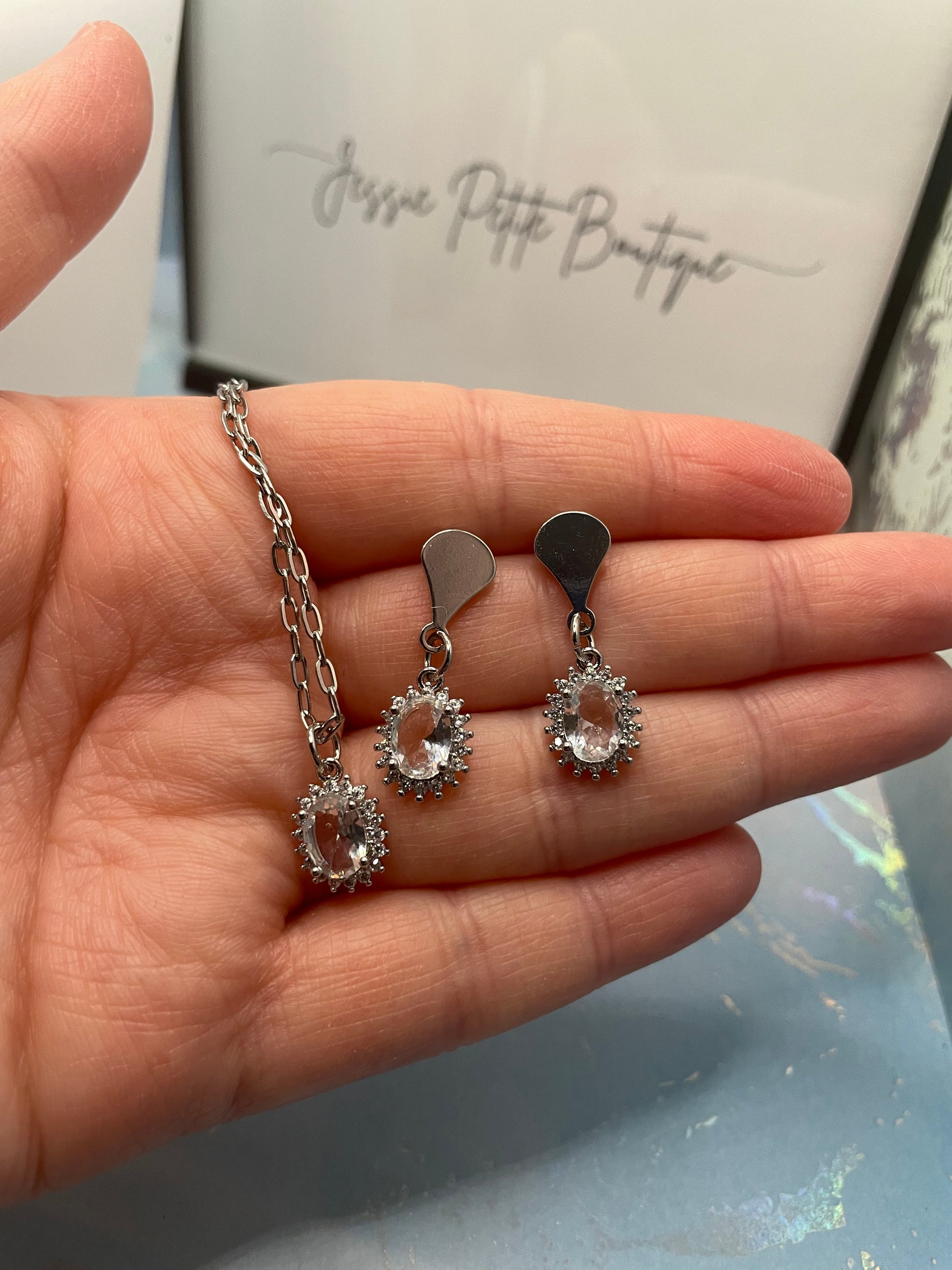 Le design scintillant de cette parure en fait un accessoire polyvalent, parfait pour ajouter une touche d'éclat à toutes vos tenues, des plus décontractées aux plus habillées. Le pendentif ovale classique du collier s'associe avec élégance des boucles d'oreilles, à la longueur confortable et à la brillance subtile. Cadeau idéal pour les grandes occasions ou complément raffiné de votre collection de bijoux, cette parure deviendra assurément un incontournable.