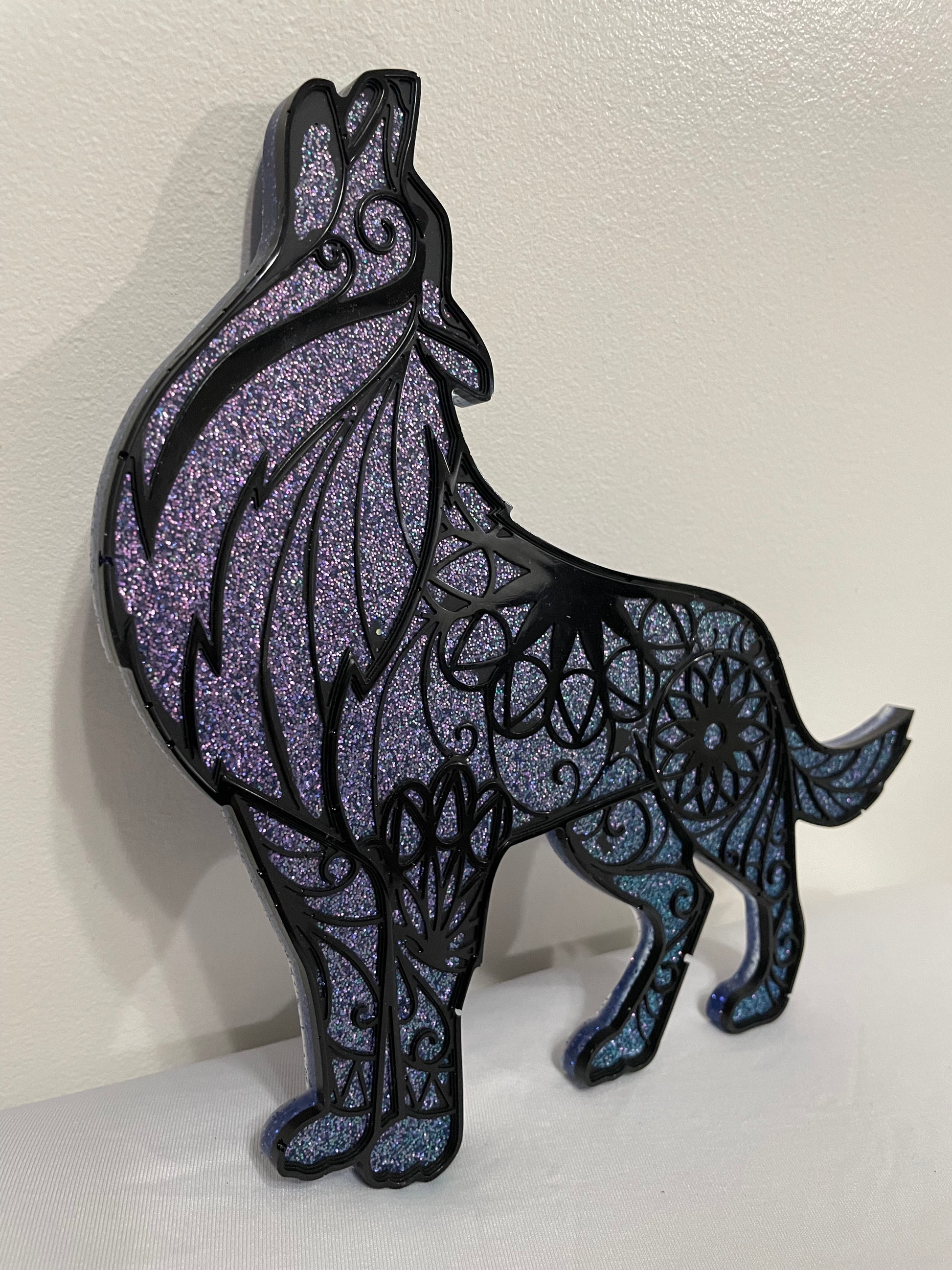Chaque pièce représente un loup majestueux hurlant, orné de motifs artistiques noirs finement travaillés qui contrastent magnifiquement avec le fond scintillant.