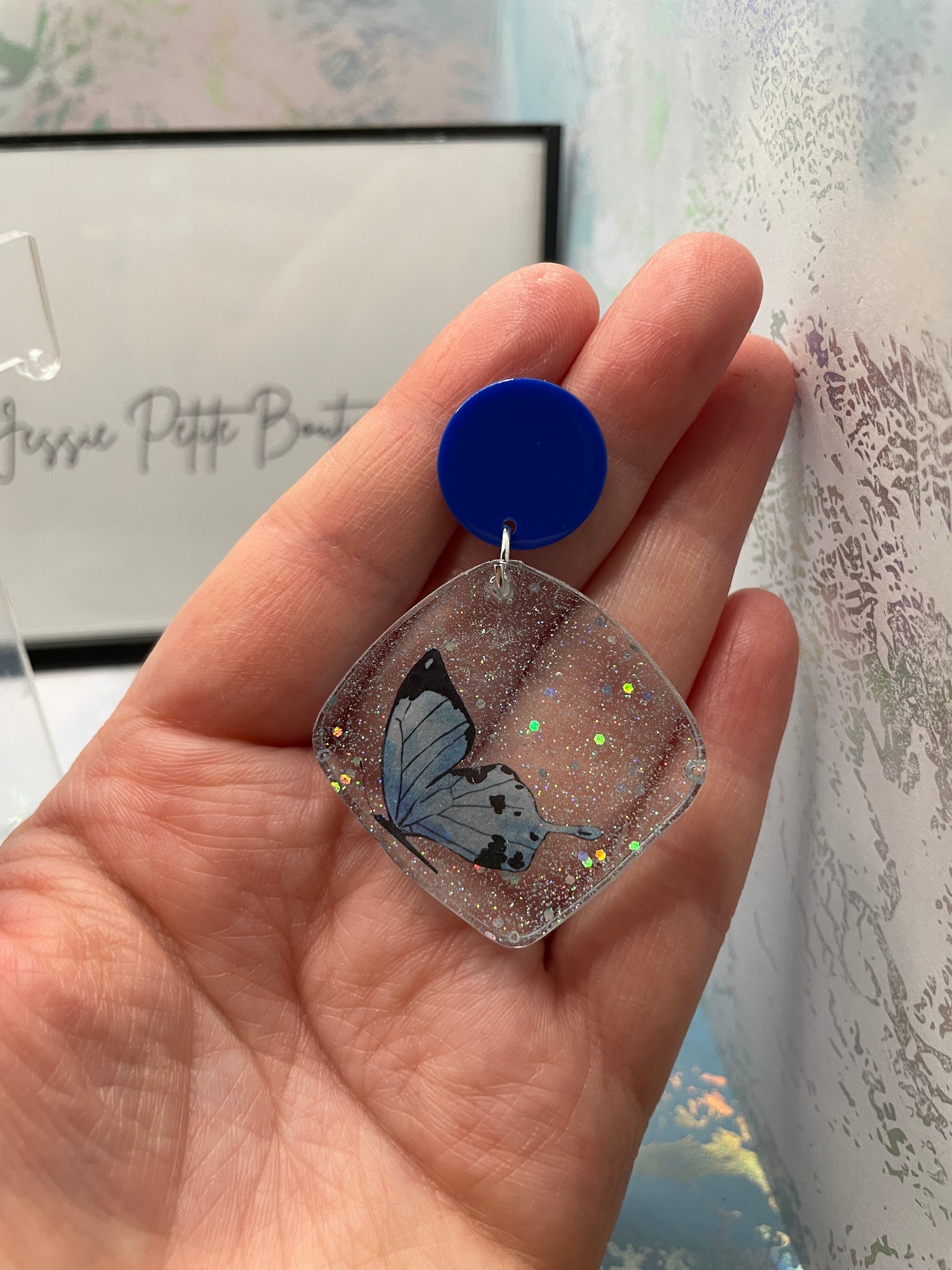 Ces boucles d'oreilles enchanteresses arborent un design en forme de losange, rempli de paillettes bleues et orné d'un délicat papillon bleu , associé à un clou en acétate acrylique bleu audacieux. Parfaites pour un look affirmé.