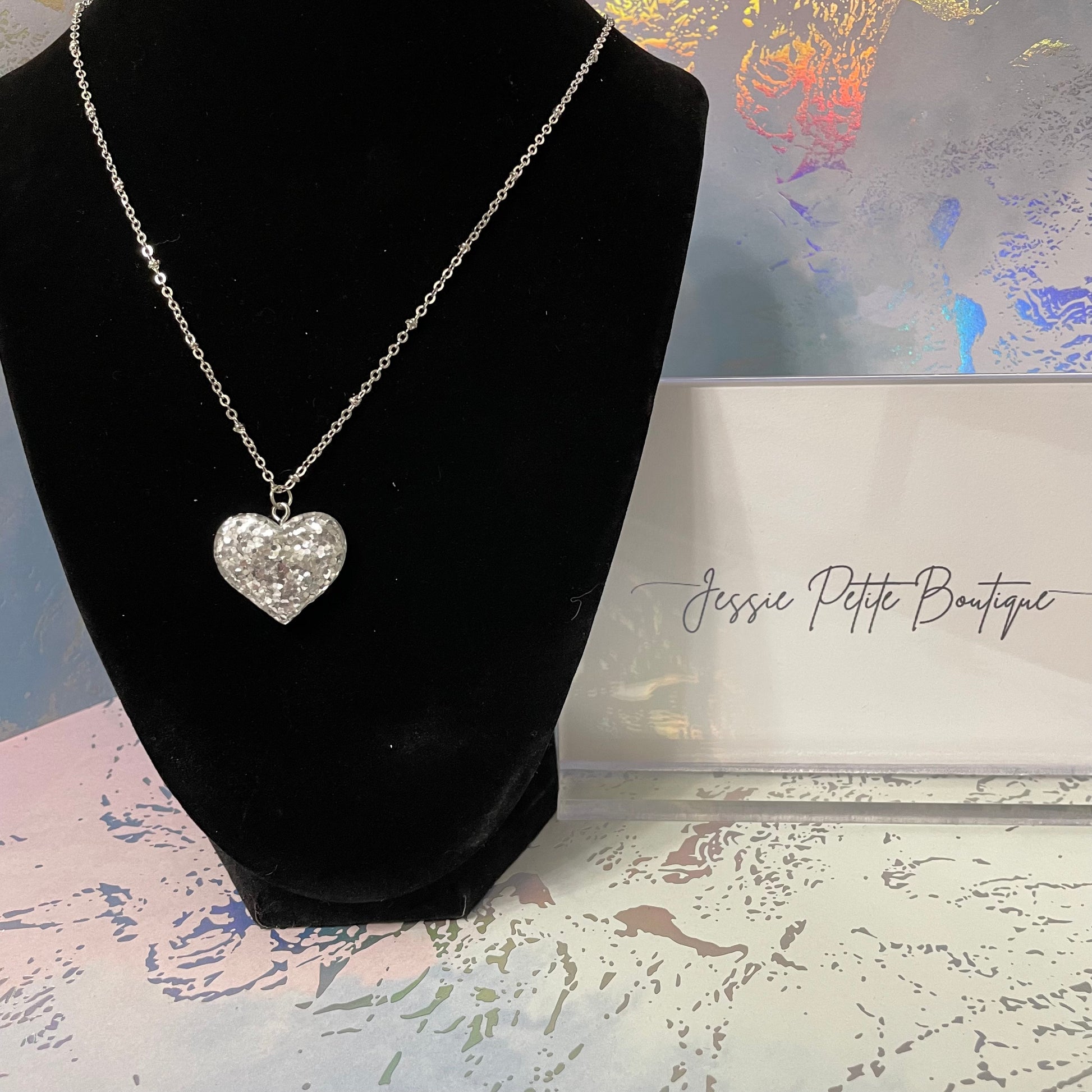 Brillez d'élégance et de style avec ce collier cœur en résine argentée scintillante. Ce collier est orné d'un magnifique pendentif en forme de cœur, orné d'une superbe finition argentée scintillante qui capte la lumière sous tous les angles. Suspendu à une chaîne en argent de 18 pouces (45 cm), ce collier léger et résistant vous assure un confort optimal tout au long de la journée. Son fermoir mousqueton sécurisé facilite son port et son ajustement. Idéal pour ajouter une touche subtile et glamour à toutes vos tenues.