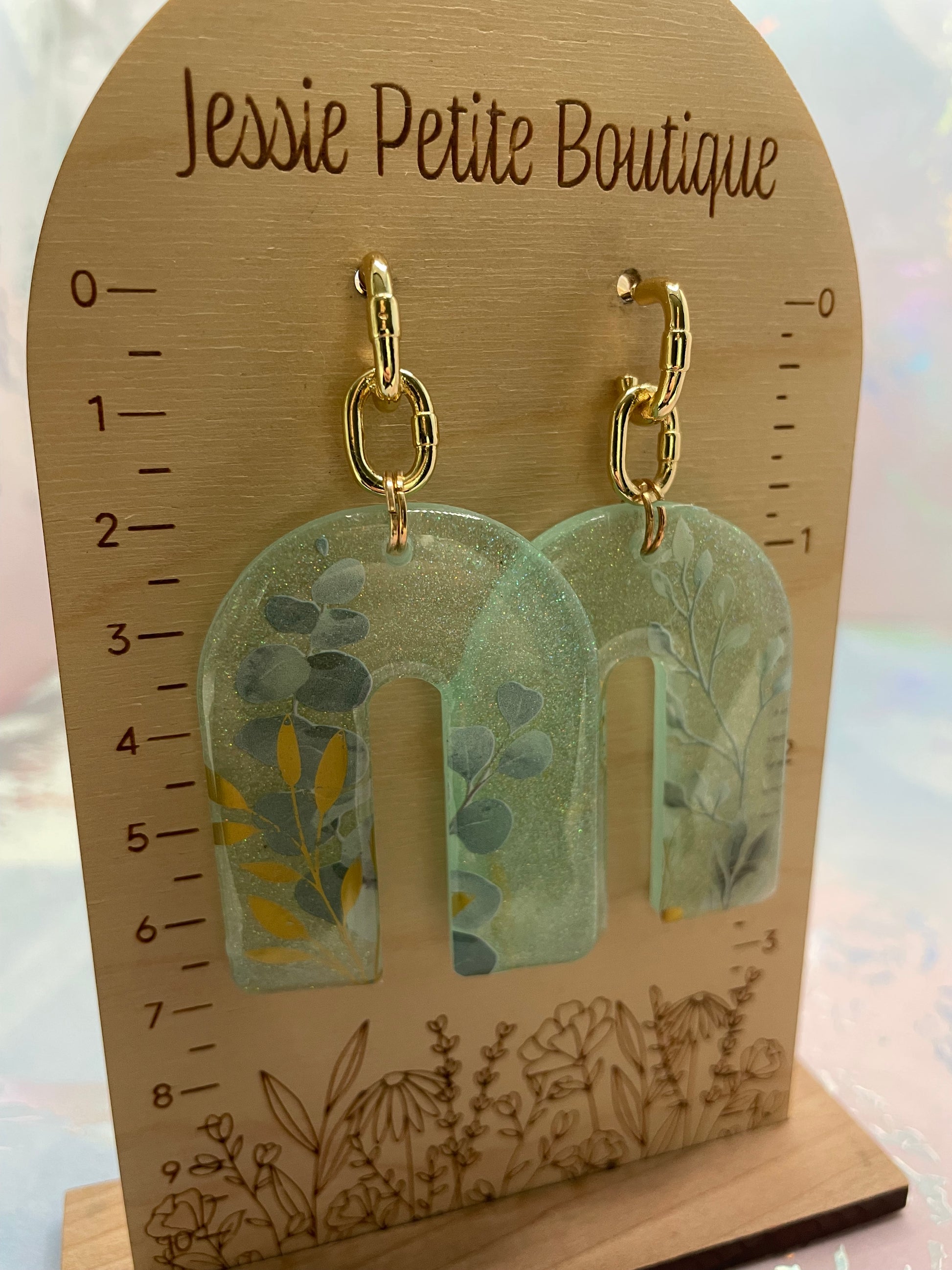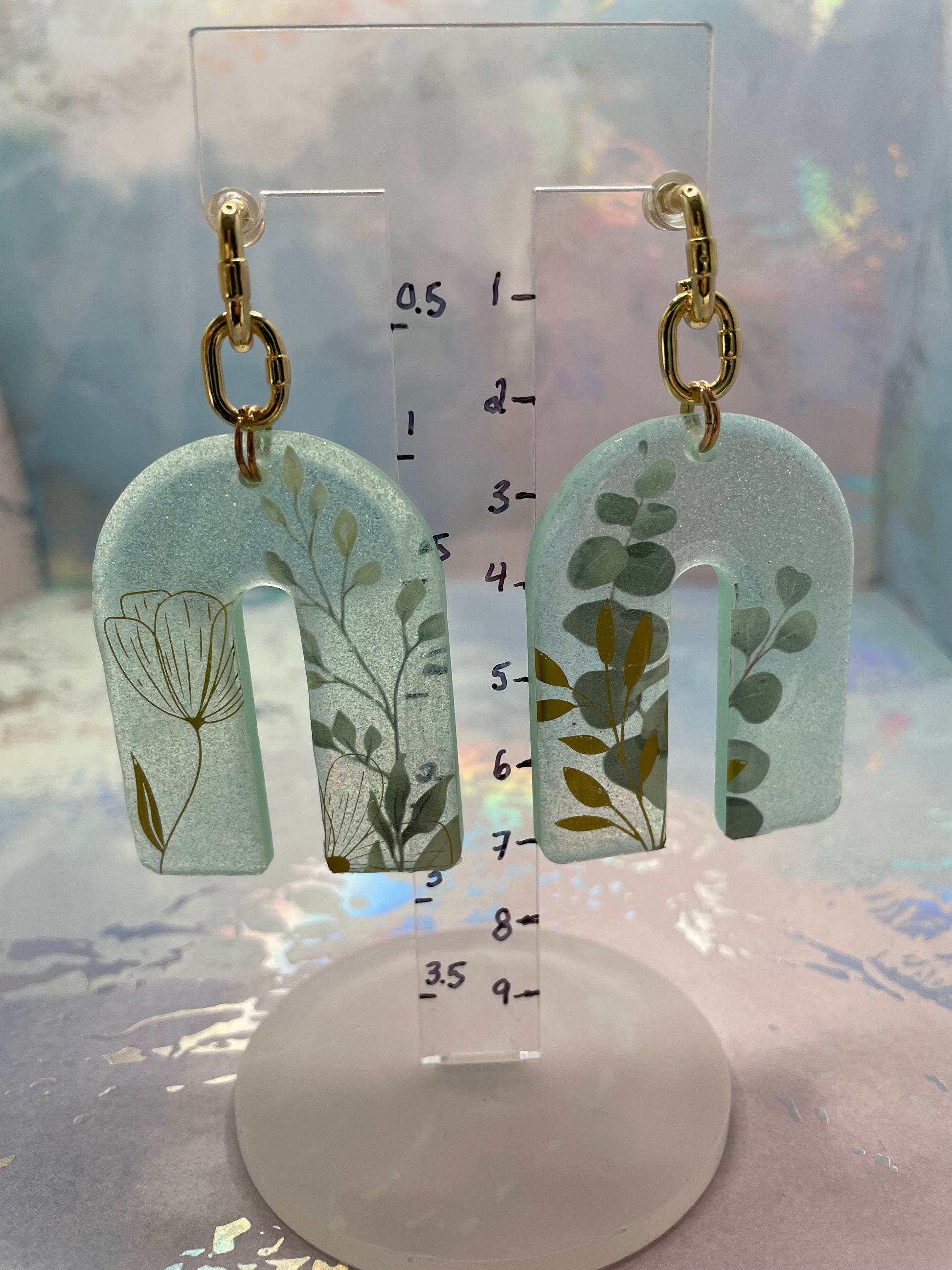 Ces boucles d’oreilles audacieuses présentent une silhouette arche moderne, réalisée en résine translucide avec une finition sarcelle brillante et de délicats motifs botaniques. Les nuances douces de menthe, rehaussées d’accents dorés, créent un effet frais et lumineux, tandis que le jeu de matières apporte profondeur et mouvement. Malgré leur format, elles demeurent confortables à porter.