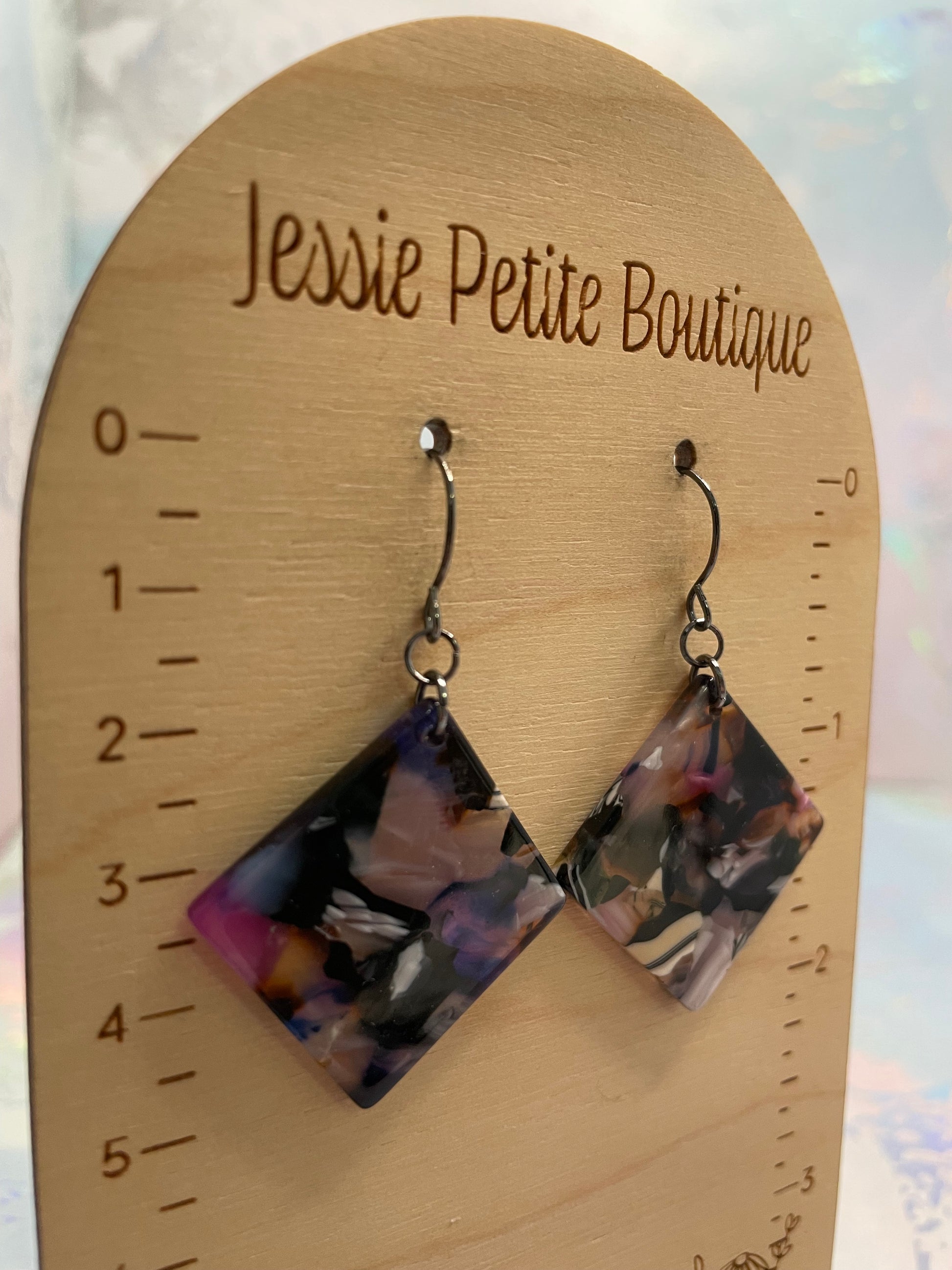 Ces boucles d’oreilles pendantes carrées présentent un motif abstrait audacieux mêlant le noir profond à des nuances de mauve, rose poudré, ambre chaleureux et ivoire délicat. Chaque pièce possède un marbrage unique, rendant chaque paire véritablement unique.
