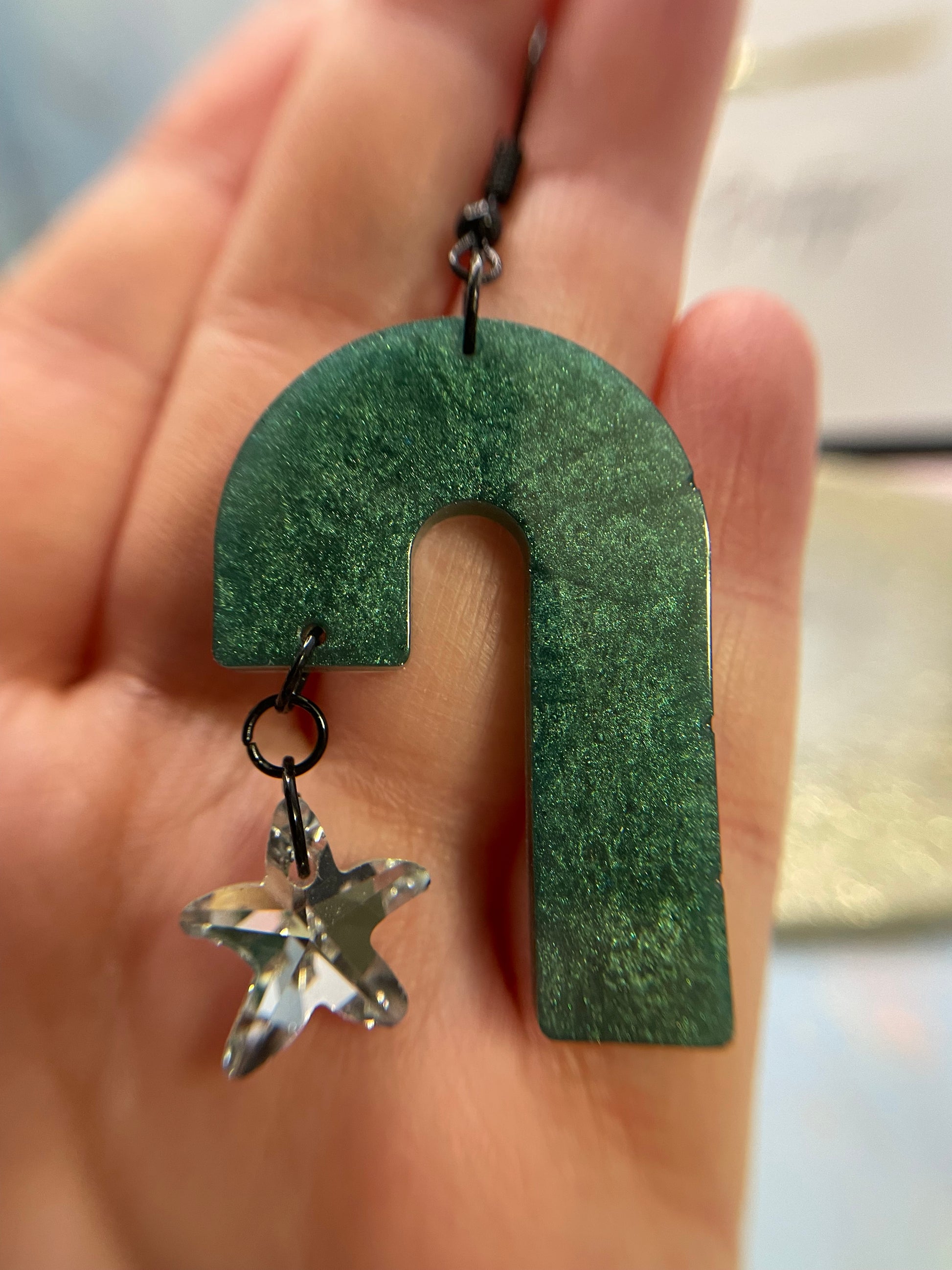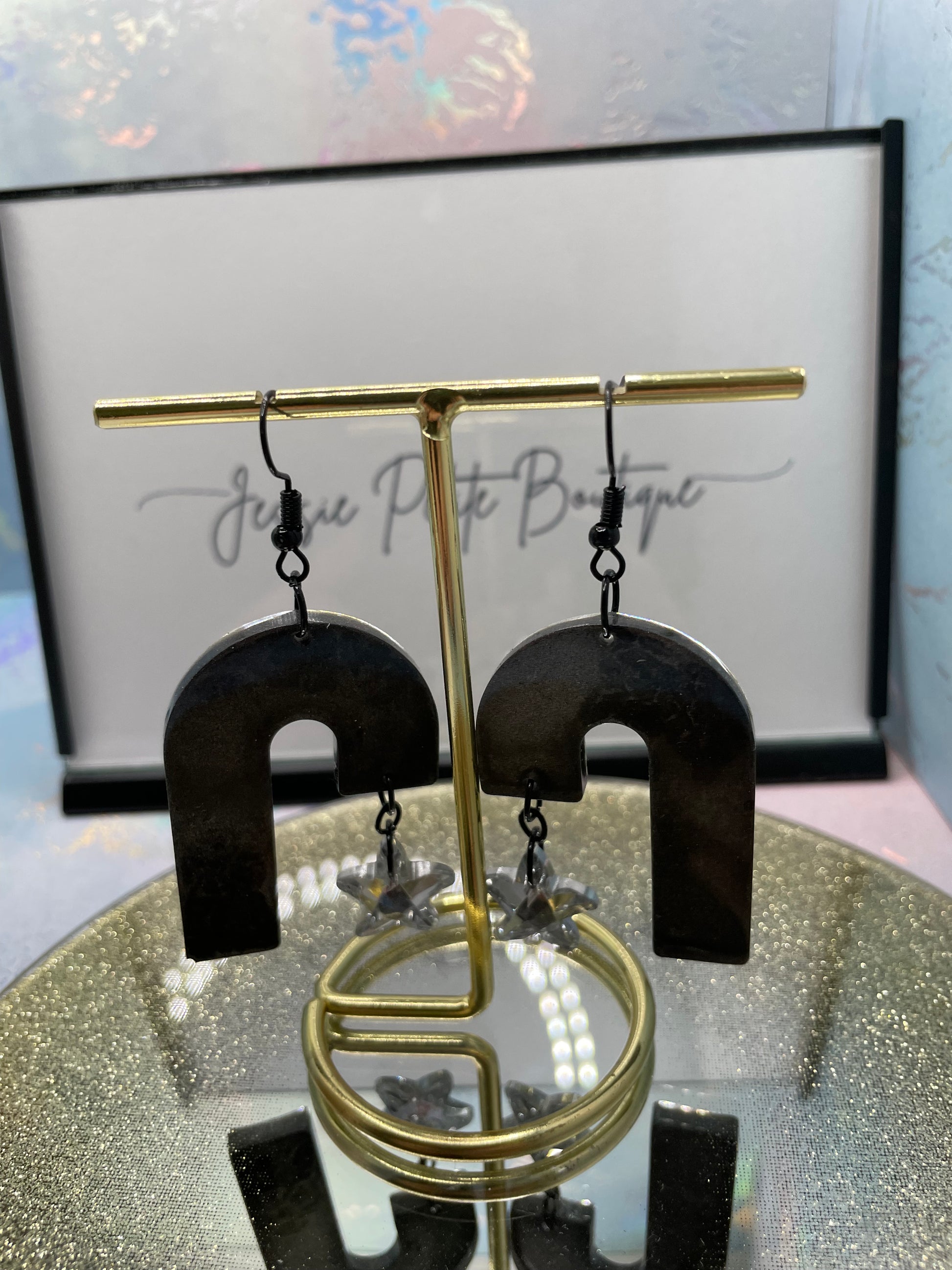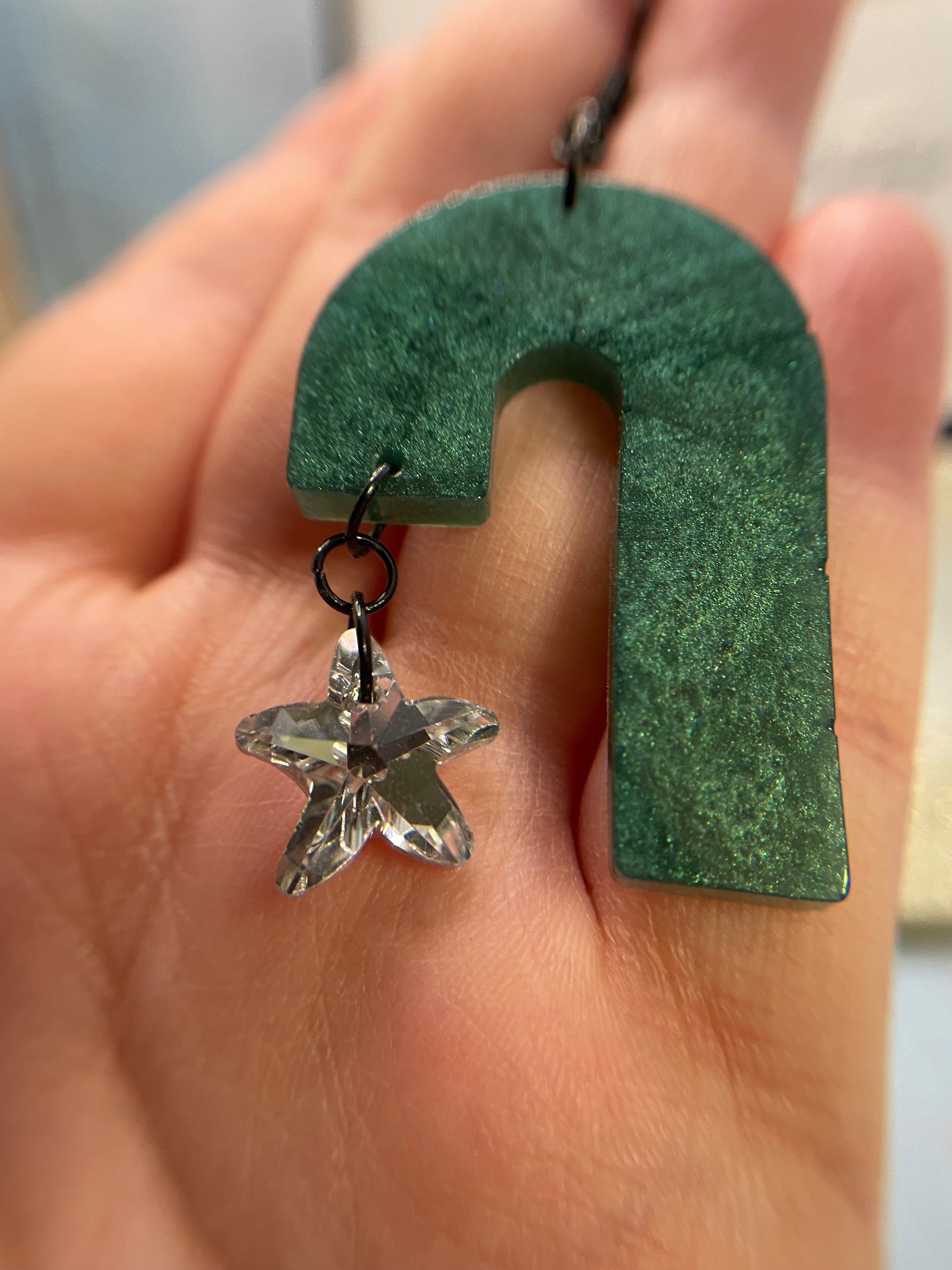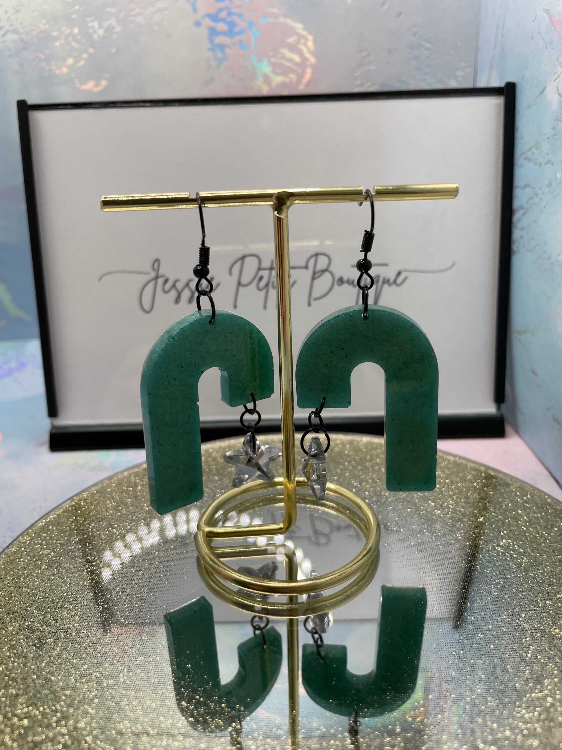 Ces boucles d'oreilles uniques présentent un design en forme de J avec une étoile en acrylique , ajoutant une touche de fantaisie à toutes vos tenues. Fabriquées en résine, poudre de mica et acrylique , elles sont disponibles en deux superbes couleurs : vert ou noir .