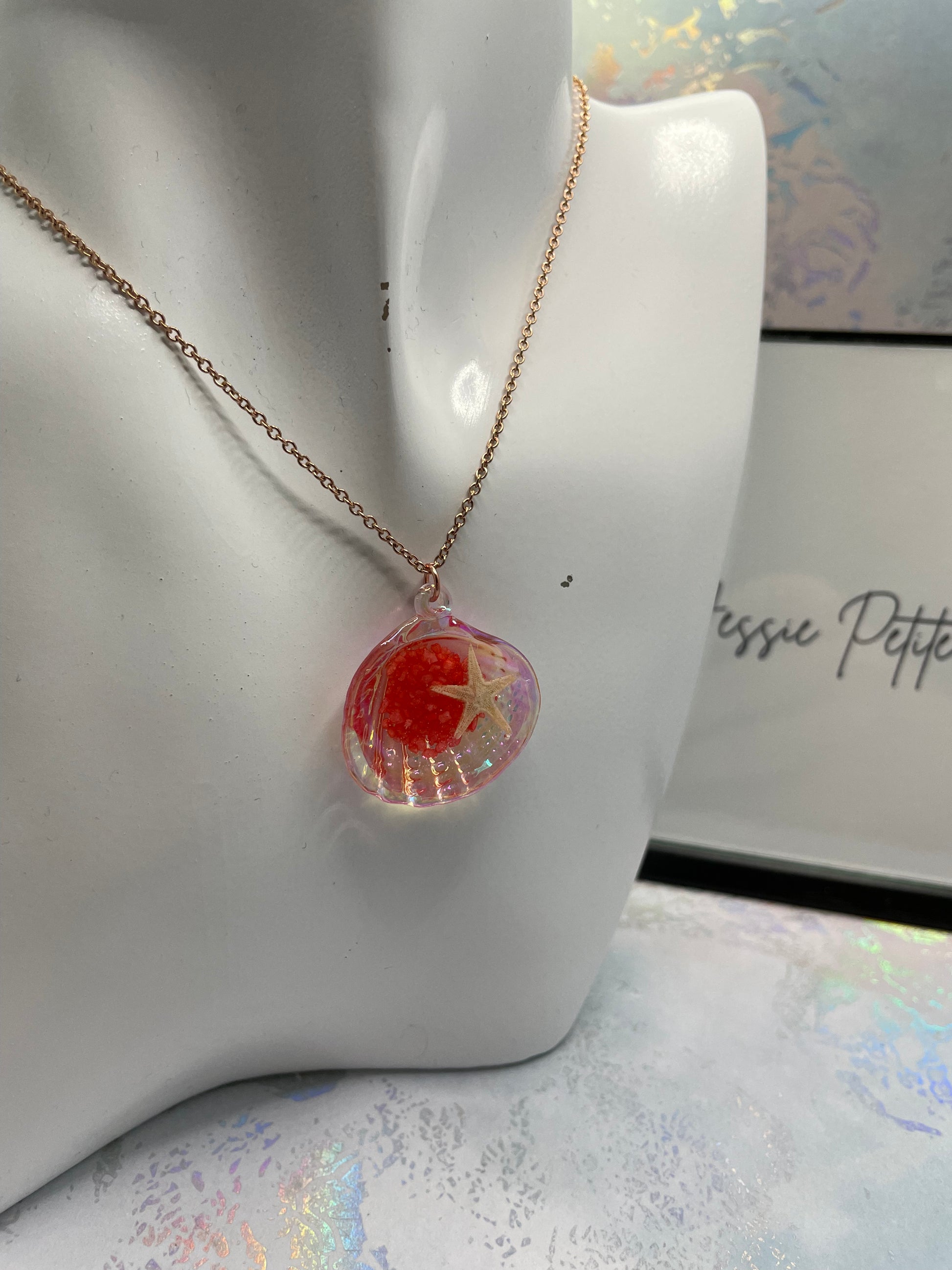 - Couleur : La belle chaîne en or rose complète les tons naturels de la coque en acrylique, avec une étoile de mer délicate et de riches teintes de sable rouge.