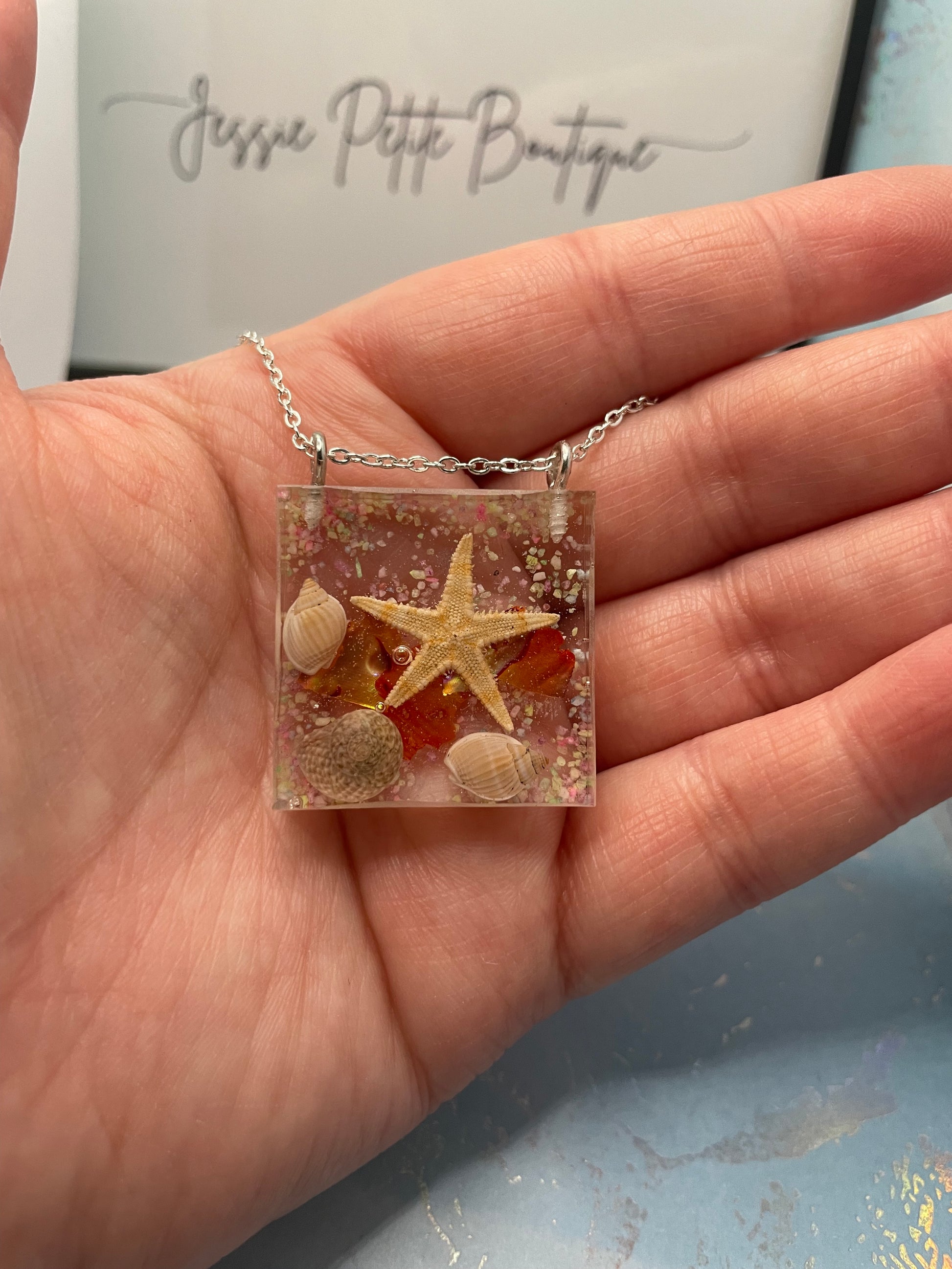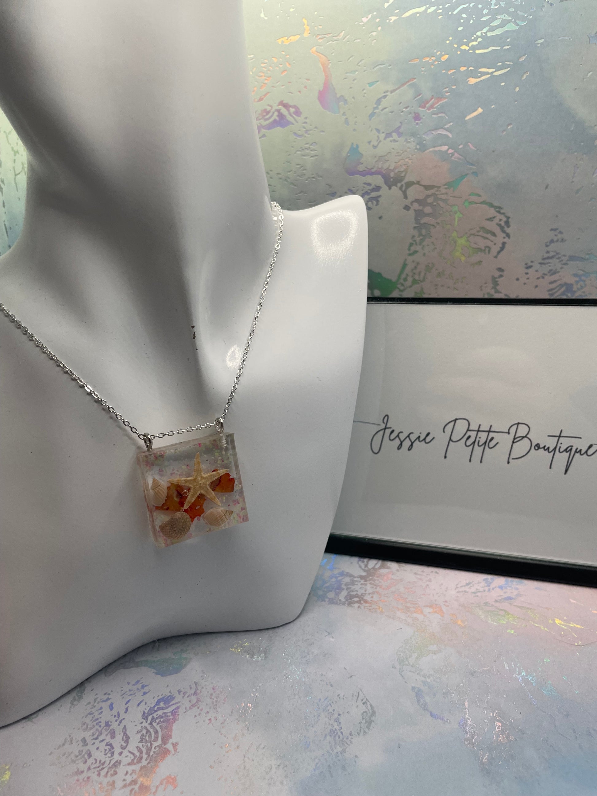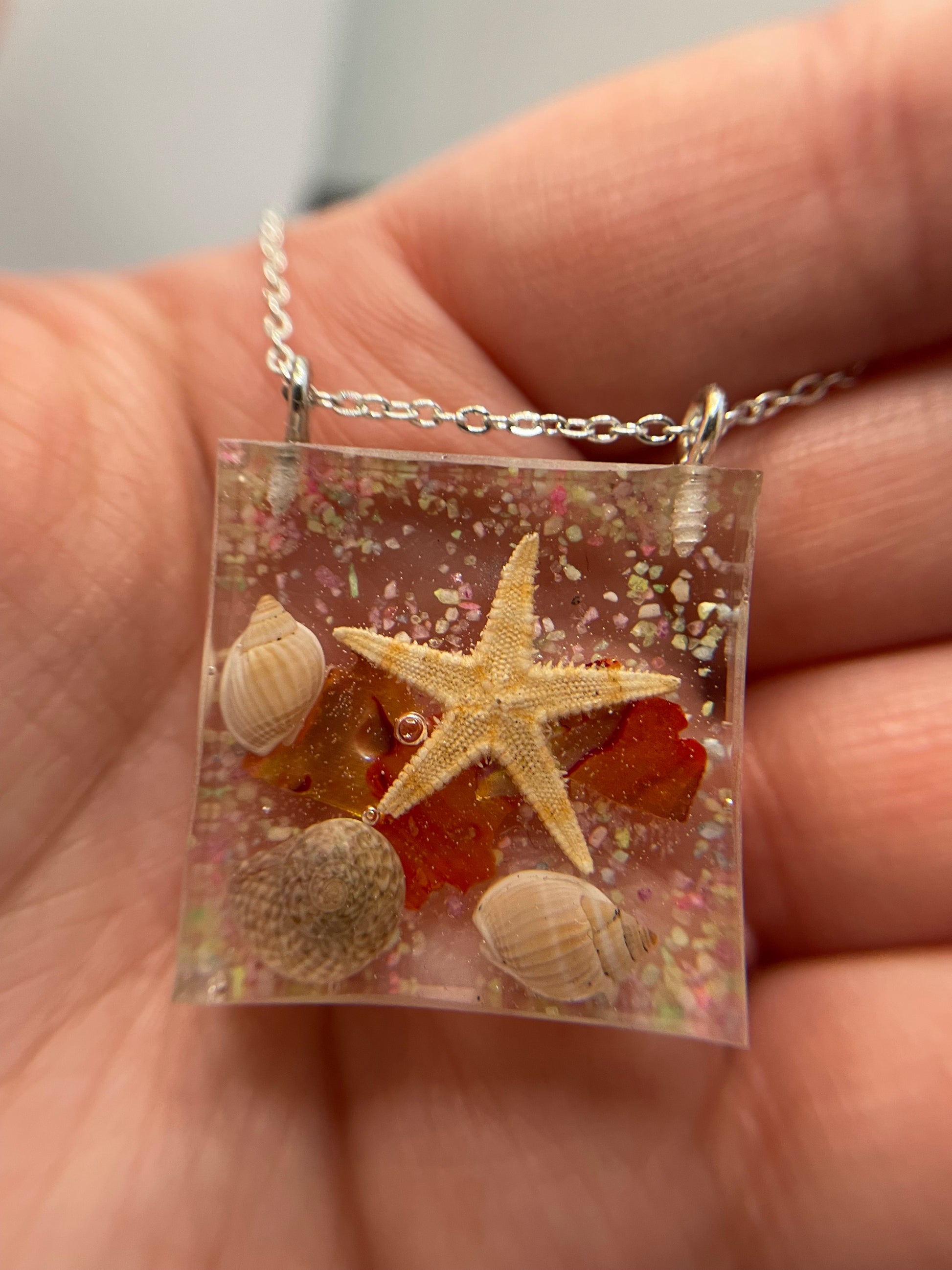 Admirez la beauté de l'océan avec ce superbe collier étoile de mer carré. Ce pendentif présente un design captivant avec une base en résine transparente encadrant une étoile de mer , des coquillages et du sable orange , apportant une touche de charme côtier à votre tenue.