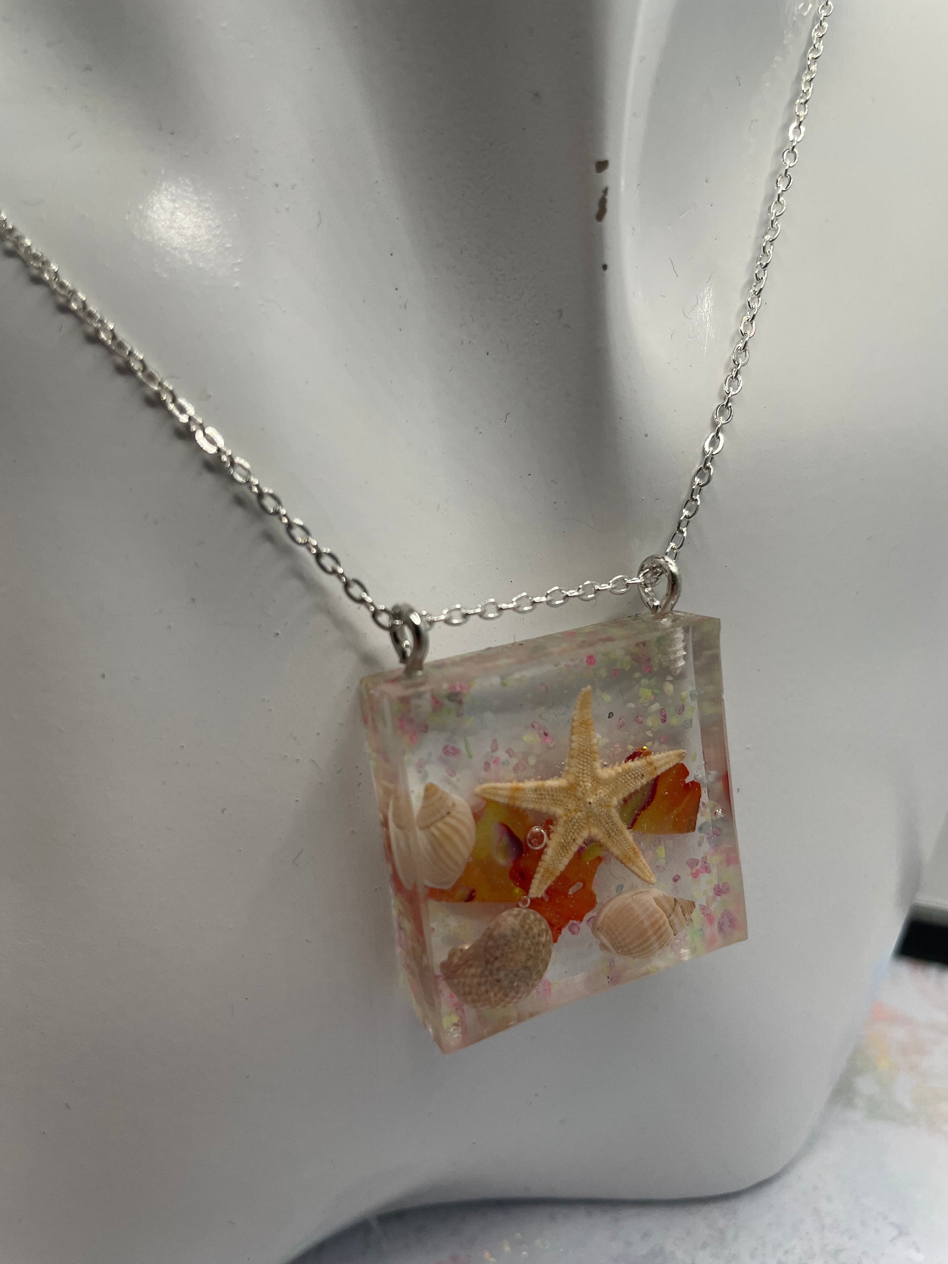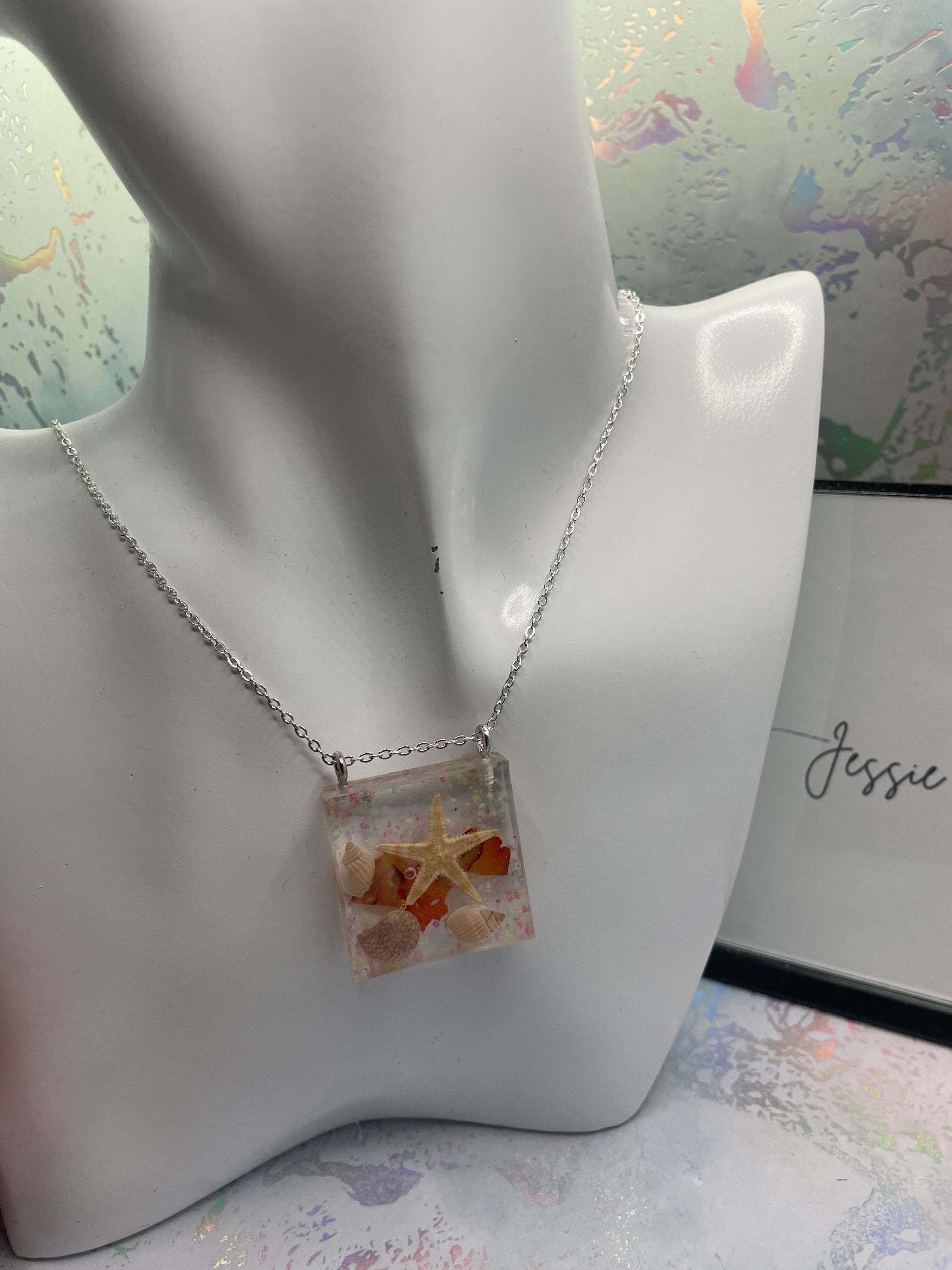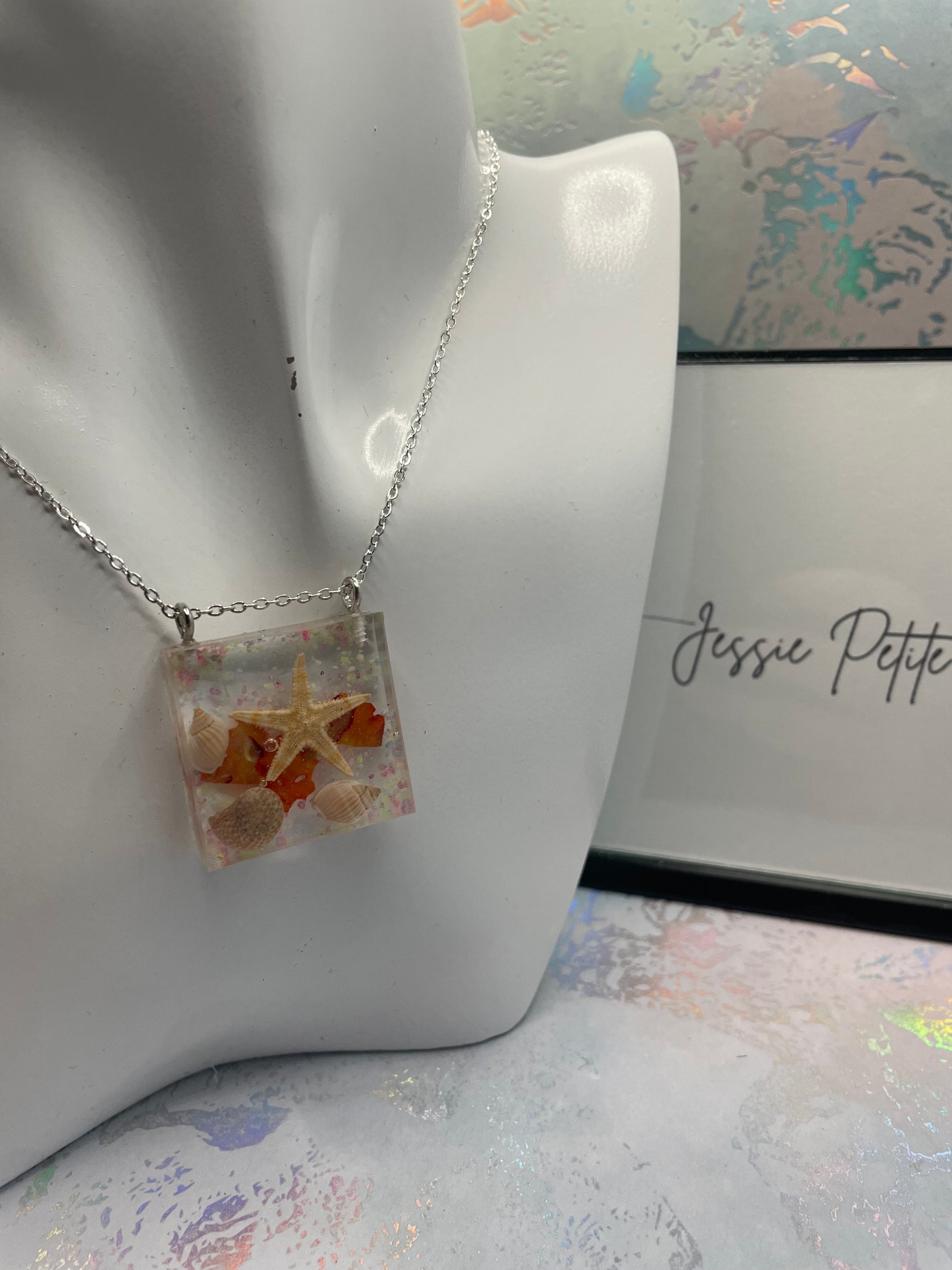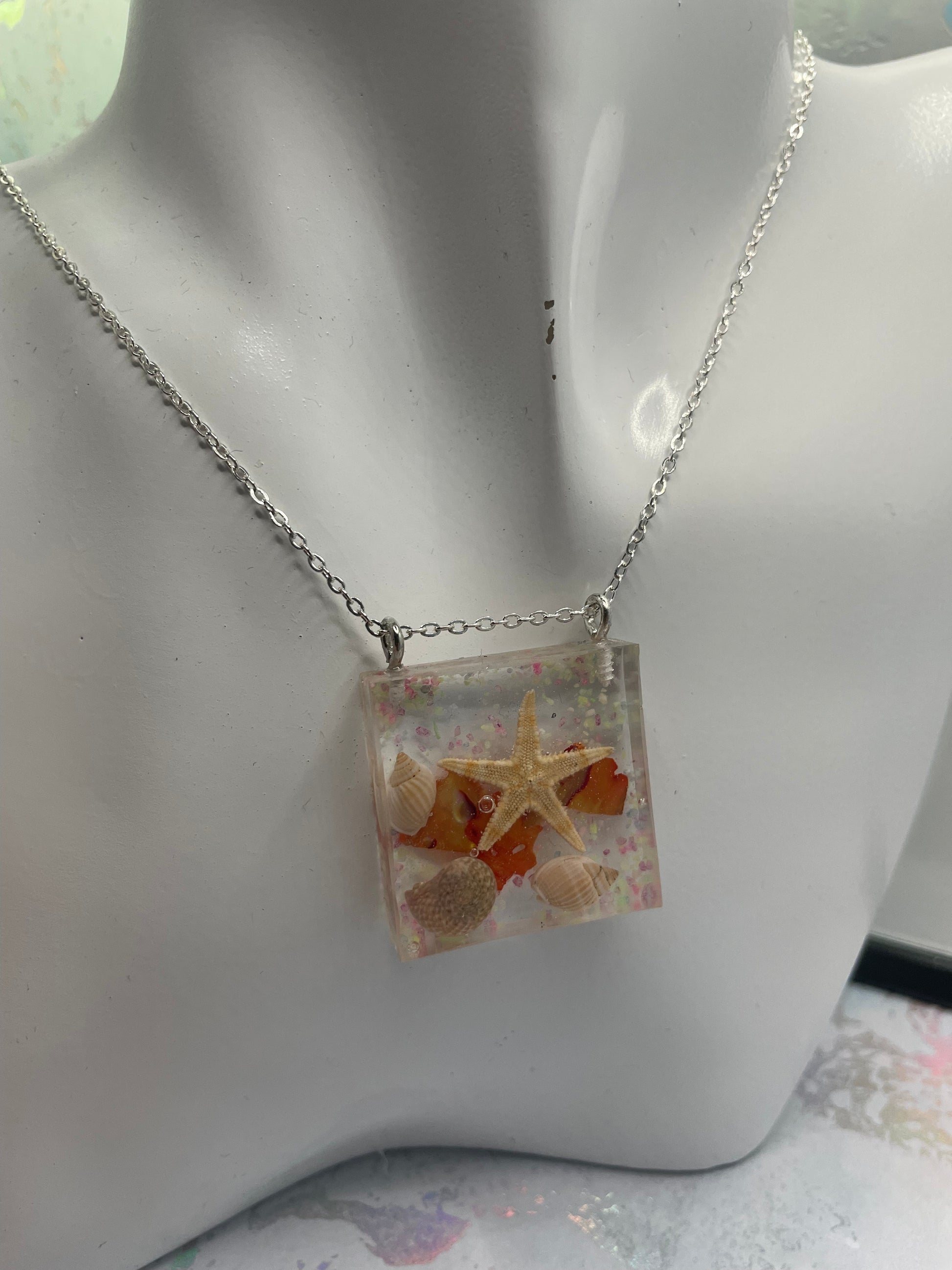 Admirez la beauté de l'océan avec ce superbe collier étoile de mer carré. Ce pendentif présente un design captivant avec une base en résine transparente encadrant une étoile de mer , des coquillages et du sable orange , apportant une touche de charme côtier à votre tenue.