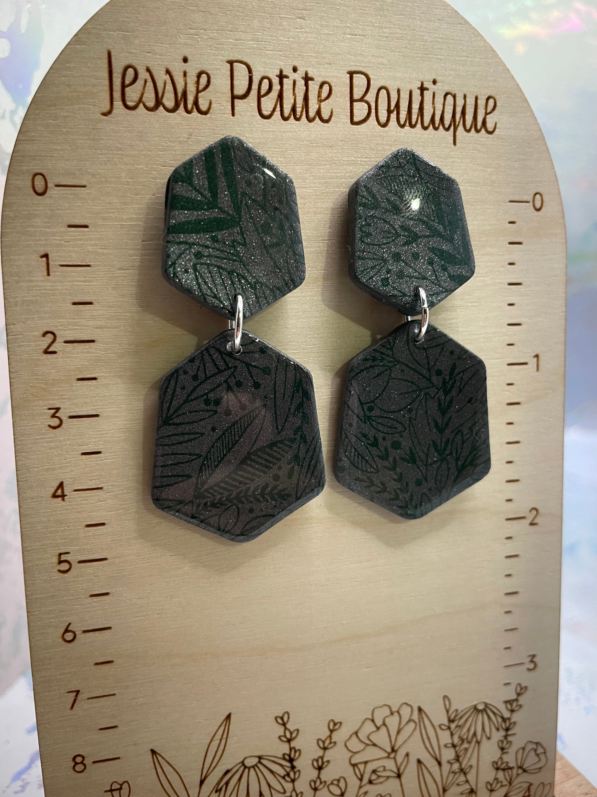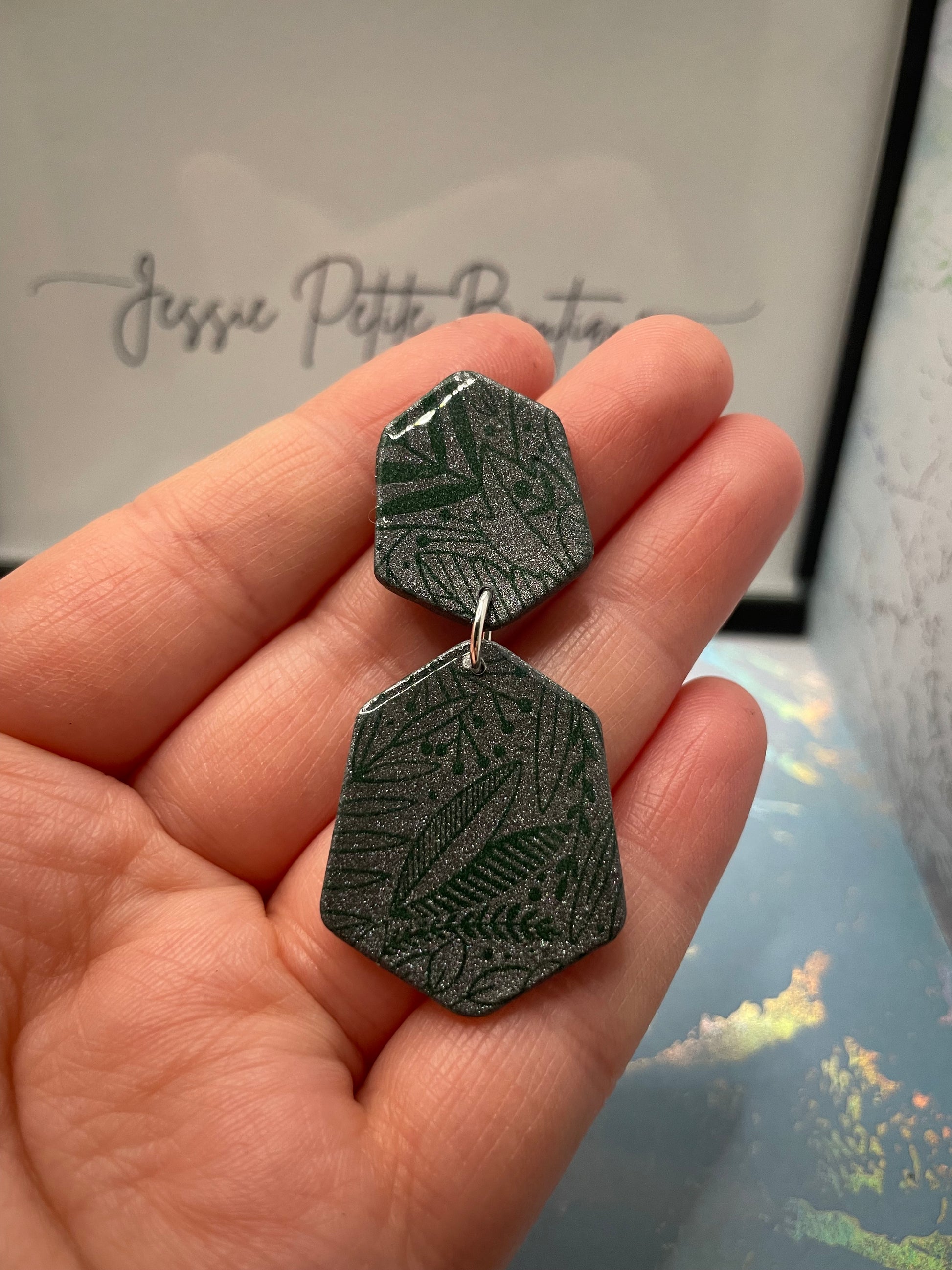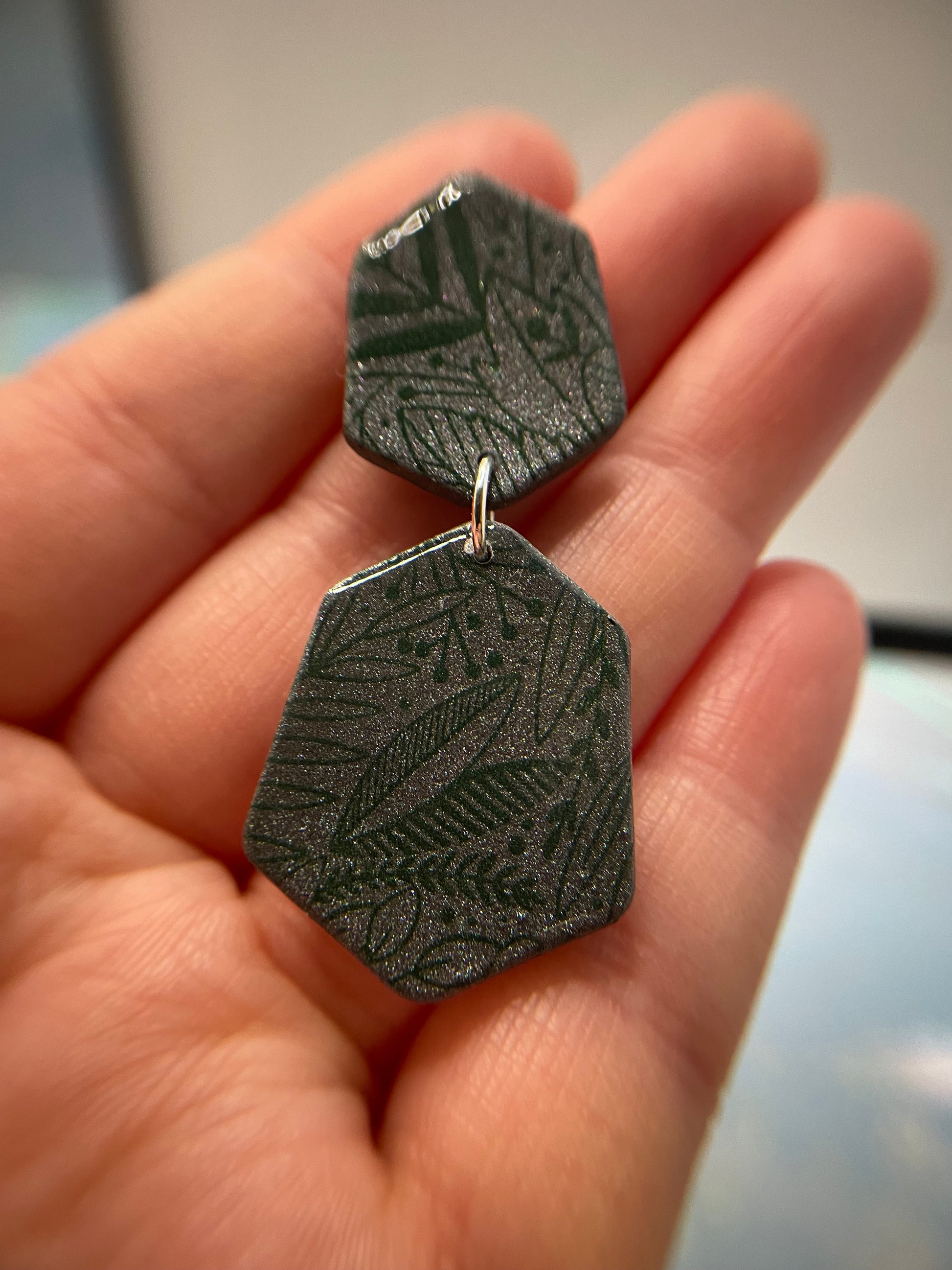 Taylor présentent une forme hexagonale arrondie unique, ornée d'un élégant motif de feuillage vert sur une base en argile grise, créant un look naturel et élégant. Leur design multicouche associe argile polymère et détails peints à la main, le tout recouvert d'une finition en résine pour une durabilité et une brillance accrues. Malgré leur taille imposante, ces boucles d'oreilles sont légères et sans nickel, idéales pour les oreilles sensibles. Parfaites pour apporter une touche naturelle à toutes vos tenues, elles apportent une touche moderne et naturelle qui s'harmonise aussi bien avec les looks décontractés que chic.