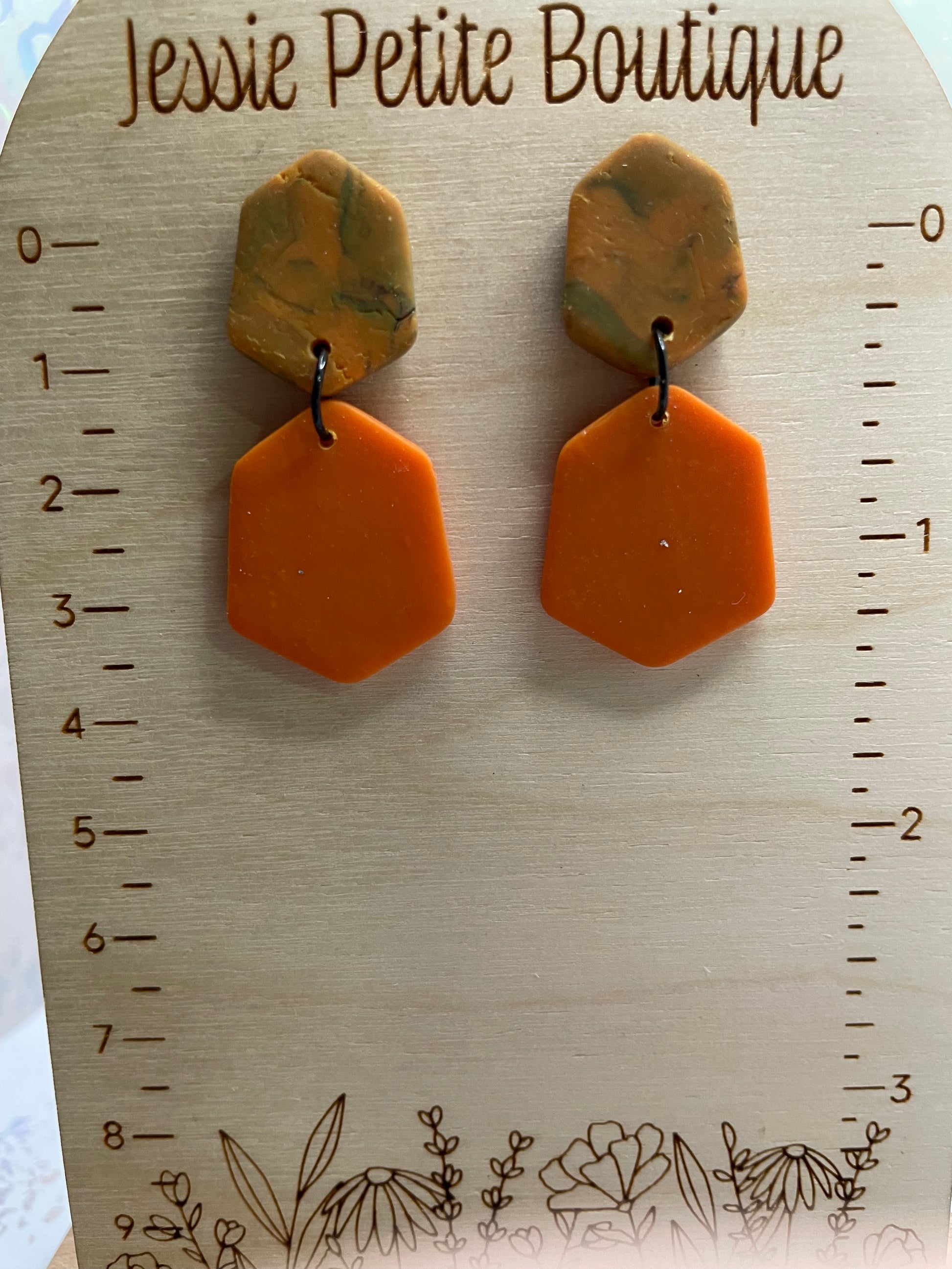 Rehaussez votre style avec Taylor en argile marbrée orange. Dotées d'une forme hexagonale arrondie, ces boucles d'oreilles sont fabriquées en argile polymère et arborent un superbe motif orange et marbré. L'effet marbré crée un look artisanal unique, parfait pour ajouter une touche de chaleur et d'élégance à votre tenue.
