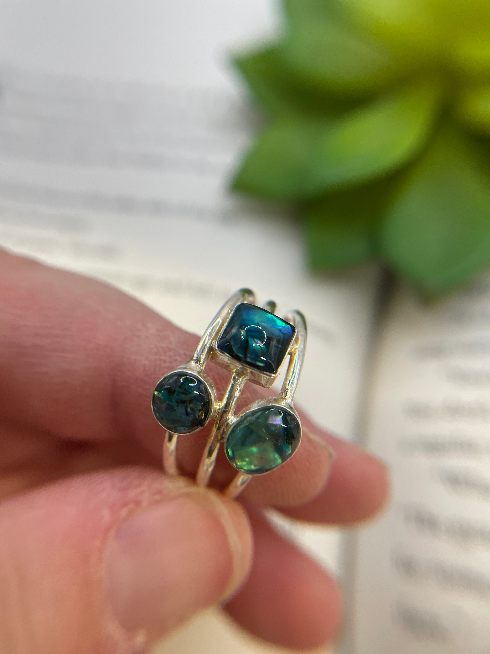 Superbe bague artisanale en argent sterling 925, ornée de trois cabochons aux formes variées — carré, ovale et rond — incrustés de coquillage bleu dans la résine. Ses reflets bleus et verts évoquent les couleurs changeantes de l’océan.