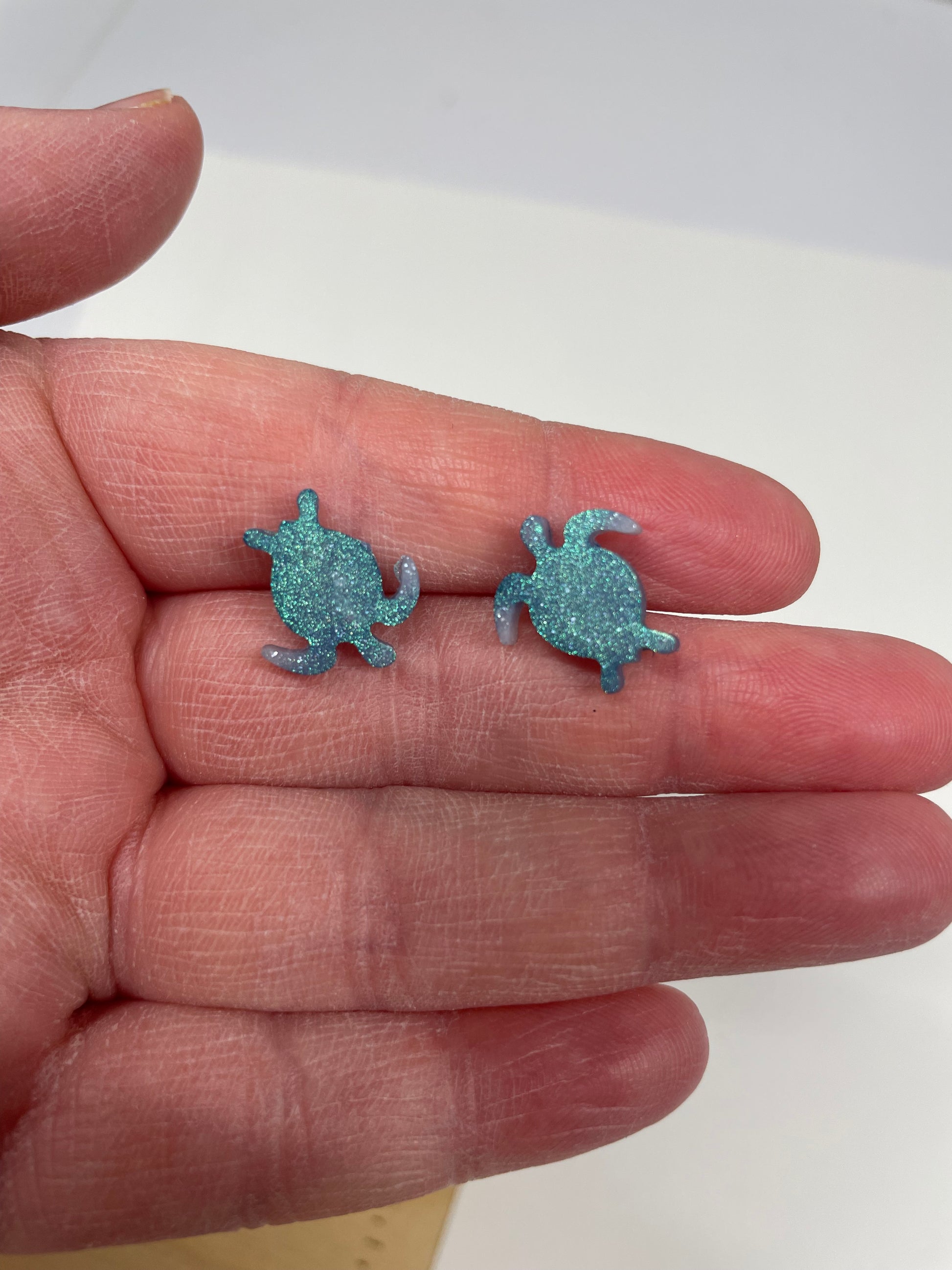 Apportez une touche marine à votre style avec ces boutons d’oreille tortue bleue faits à la main. Réalisés en résine avec de la poudre de mica, ils offrent un éclat délicat et une finition lisse et brillante. Légers et confortables, ils sont montés sur des tiges sans nickel, idéales pour les oreilles sensibles — parfaits pour un usage quotidien ou comme cadeau original.