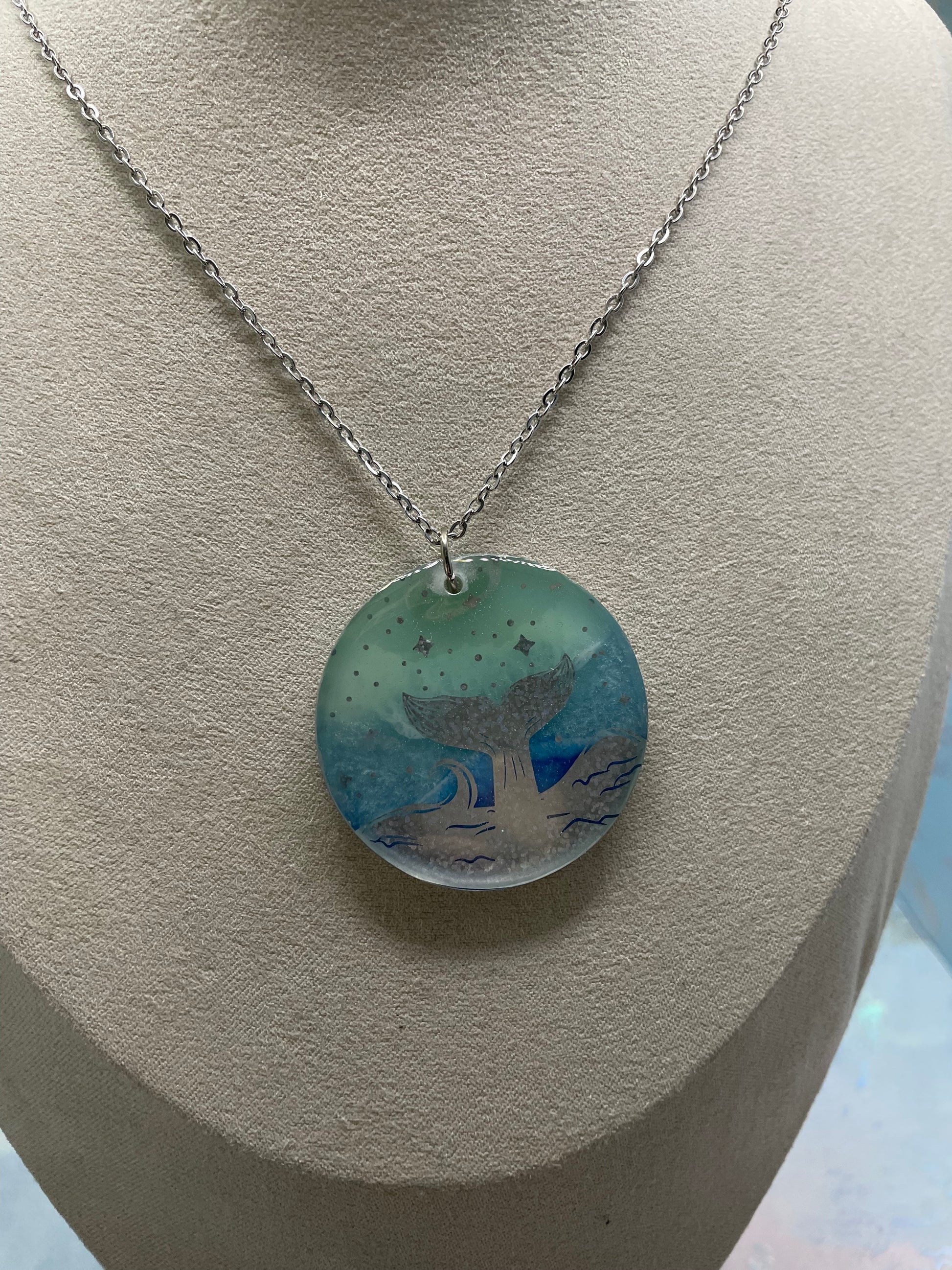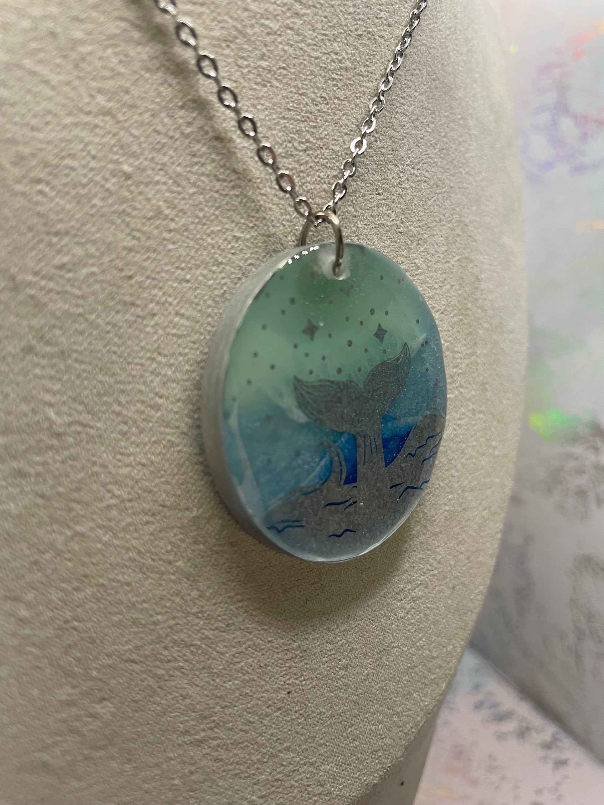 Ce collier artisanal présente un pendentif rond en résine mettant en valeur une queue de baleine argentée holographique sur un fond bleu ombré. Les couches de couleurs créent un effet fluide et inspiré de l’océan, avec de délicats reflets lumineux qui apportent profondeur et caractère.