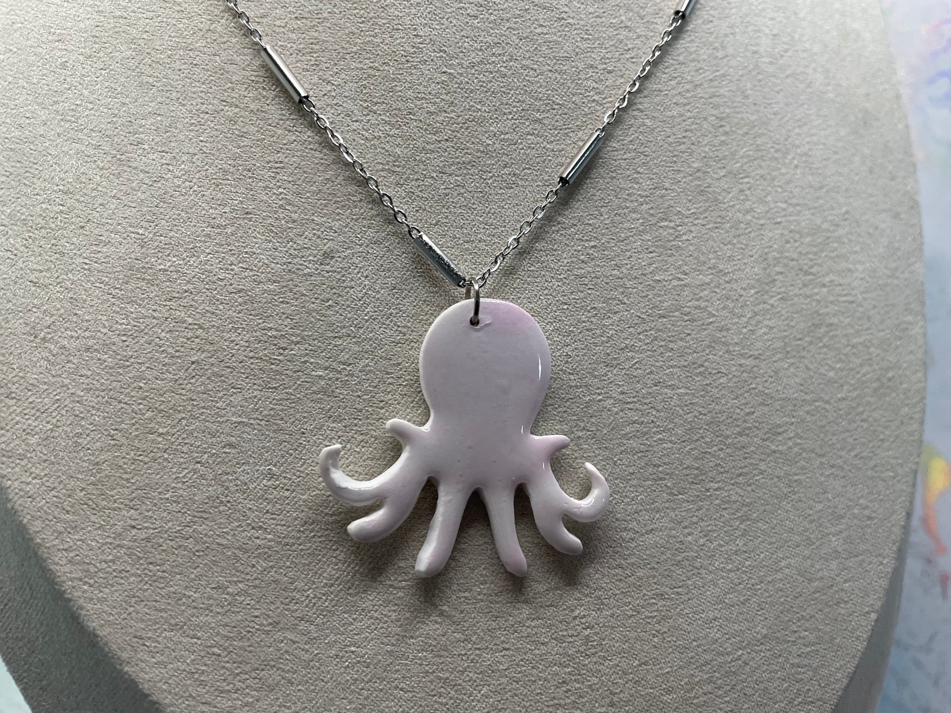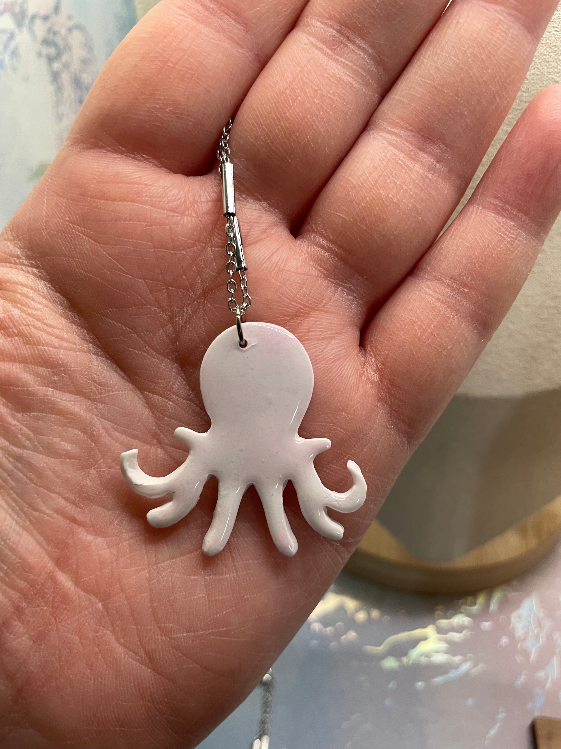 Ce pendentif en forme de pieuvre, ludique et accrocheur, allie créativité et savoir-faire. Arborant une douce palette de blanc et de rose, il offre un style à la fois ludique et élégant d'inspiration marine, parfait pour ajouter une touche de fantaisie à toutes vos tenues. Réalisé en pâte polymère et résine, le pendentif est rehaussé d'encre à alcool pour créer des nuances délicates qui sublimeront toutes vos tenues.