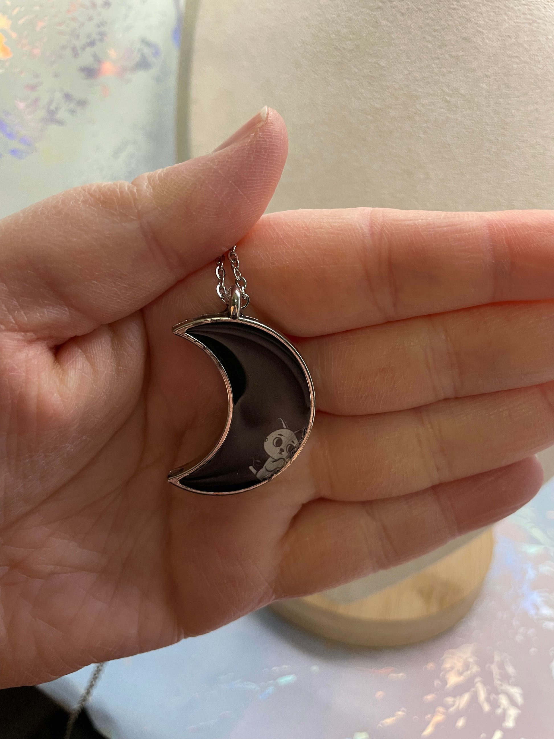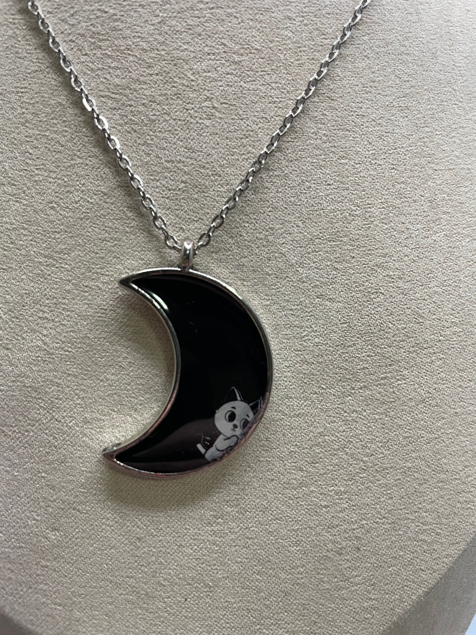 Ce collier en forme de lune présente un fond noir profond rehaussé d’une délicate illustration de chat blanc niché dans la courbe de la lune. Le tout est encadré d’un serti argenté lisse, offrant un contraste élégant entre le noir brillant et les détails clairs. Une pièce à la fois ludique et raffinée, parfaite pour les amoureux des chats et des créations au style nocturne.