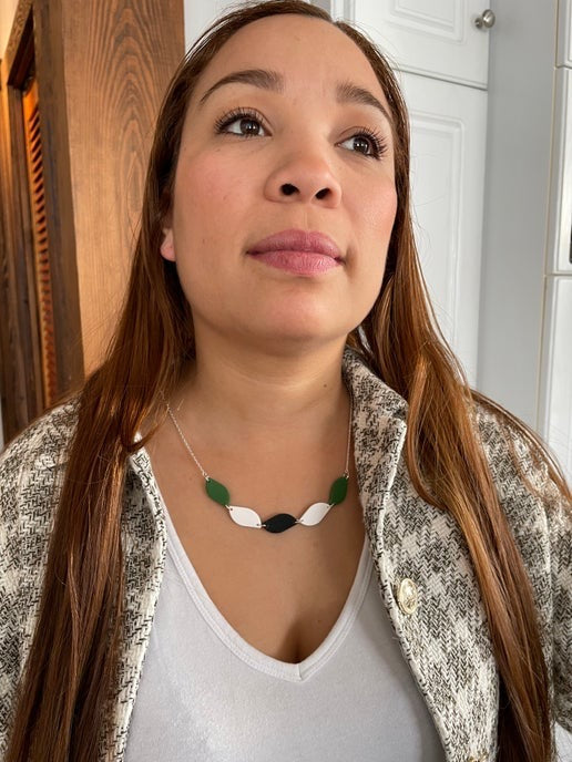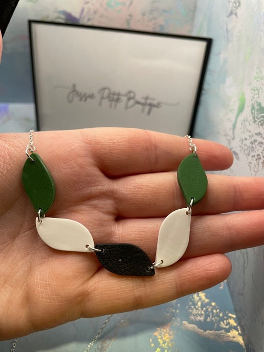 Cet élégant collier en pâte polymère à motifs de vagues blanches, vertes et noires présente un design moderne et minimaliste. Ses formes ondulées créent une douce fluidité sur le décolleté, un choix idéal pour un look chic et simple. Monté sur une chaîne en argent sans nickel de 55 cm avec extension , ce collier est léger et facile à porter grâce à son fermoir mousqueton .