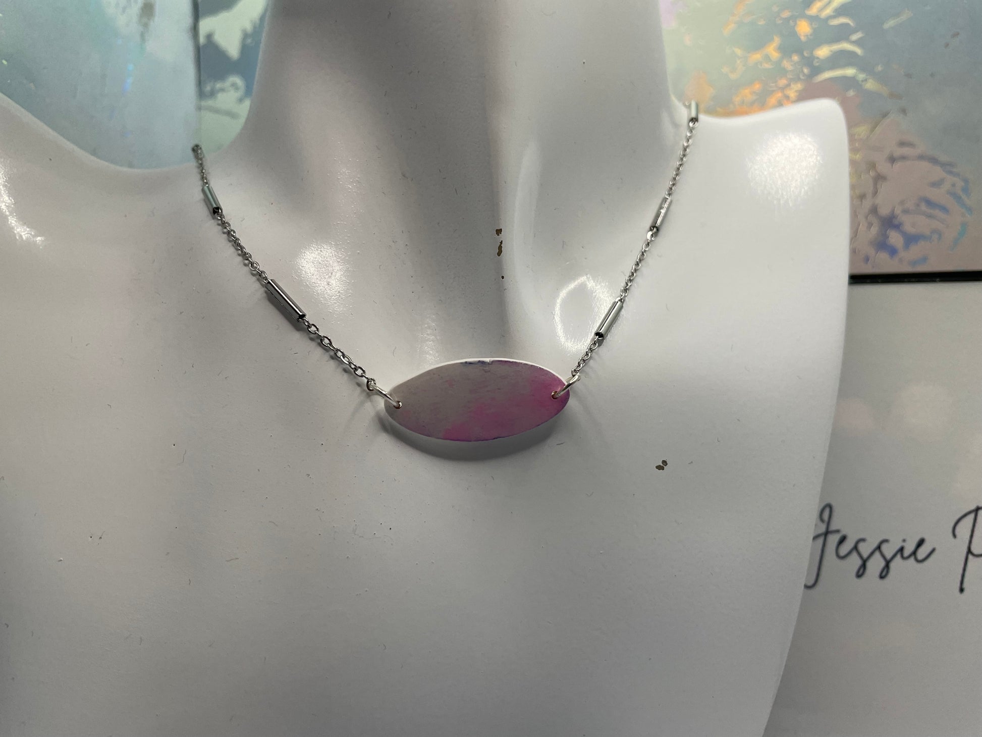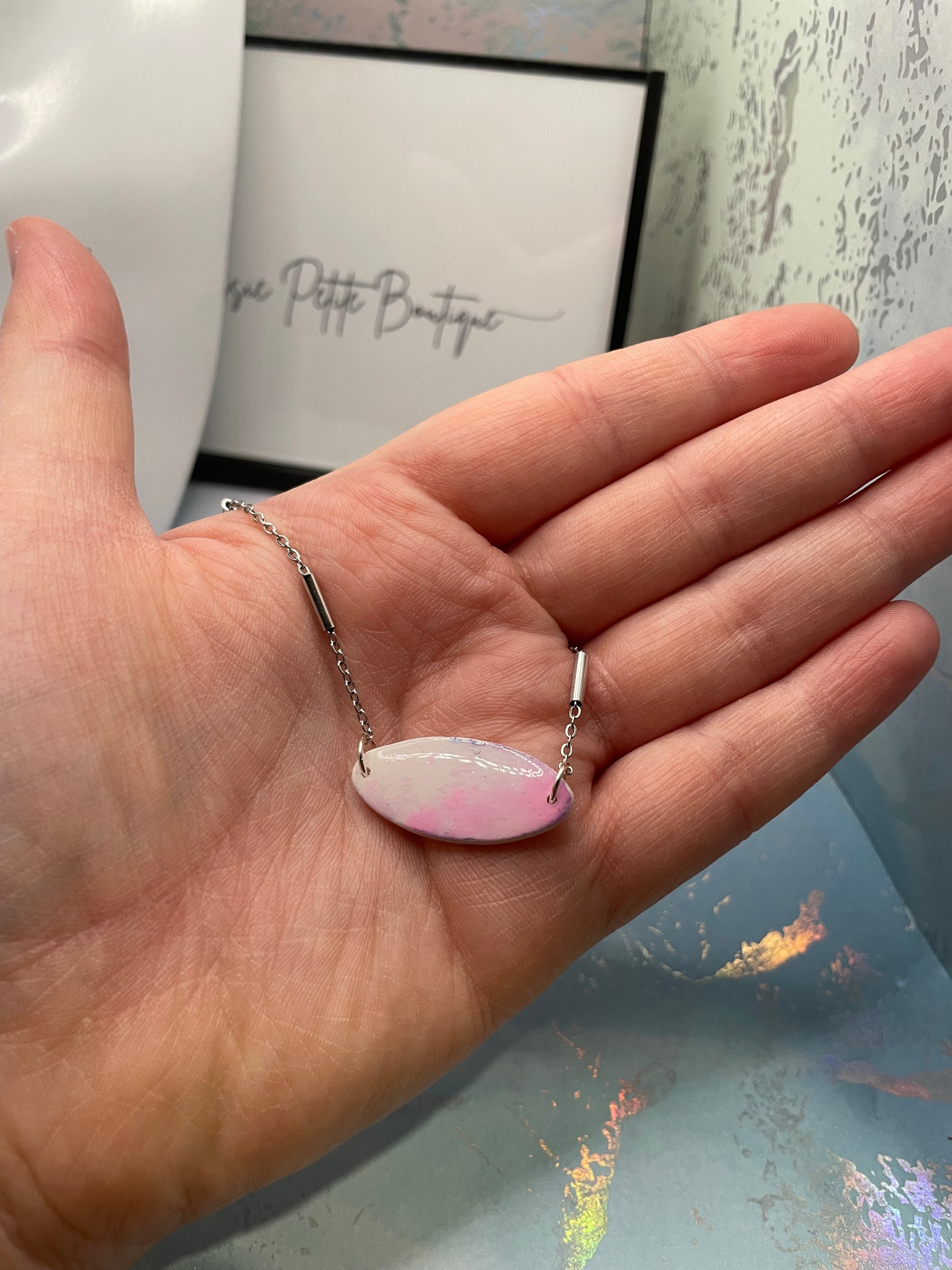 Ce charmant collier présente un élégant pendentif ovale orné de perles tubulaires, présentant un mélange de tons rose doux et blancs avec une finition lisse et brillante.