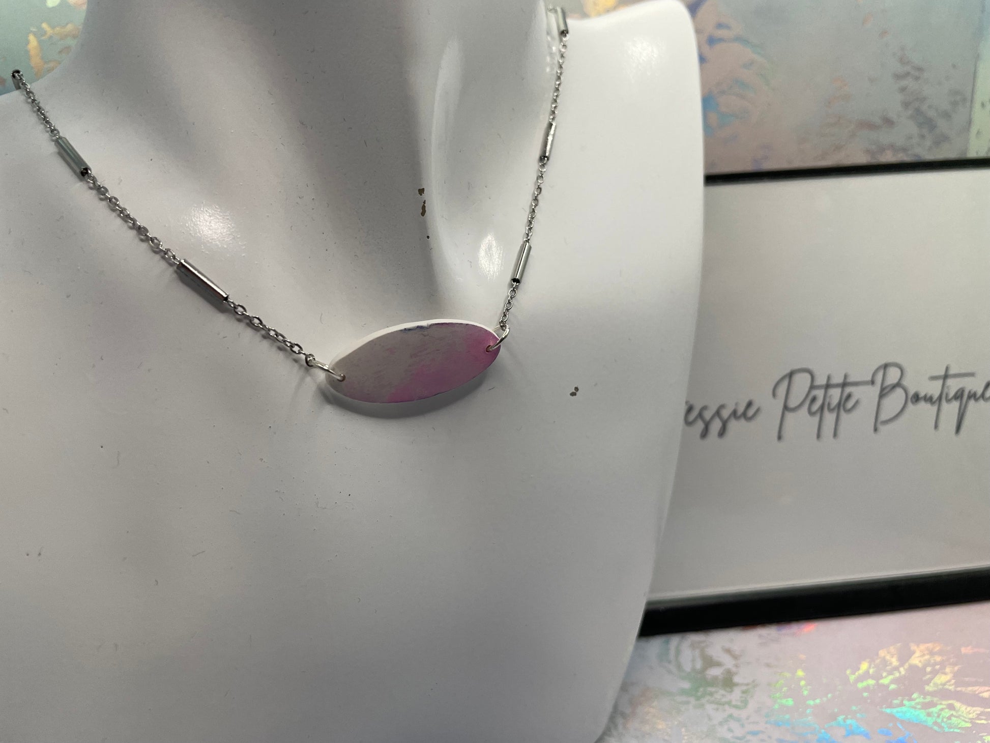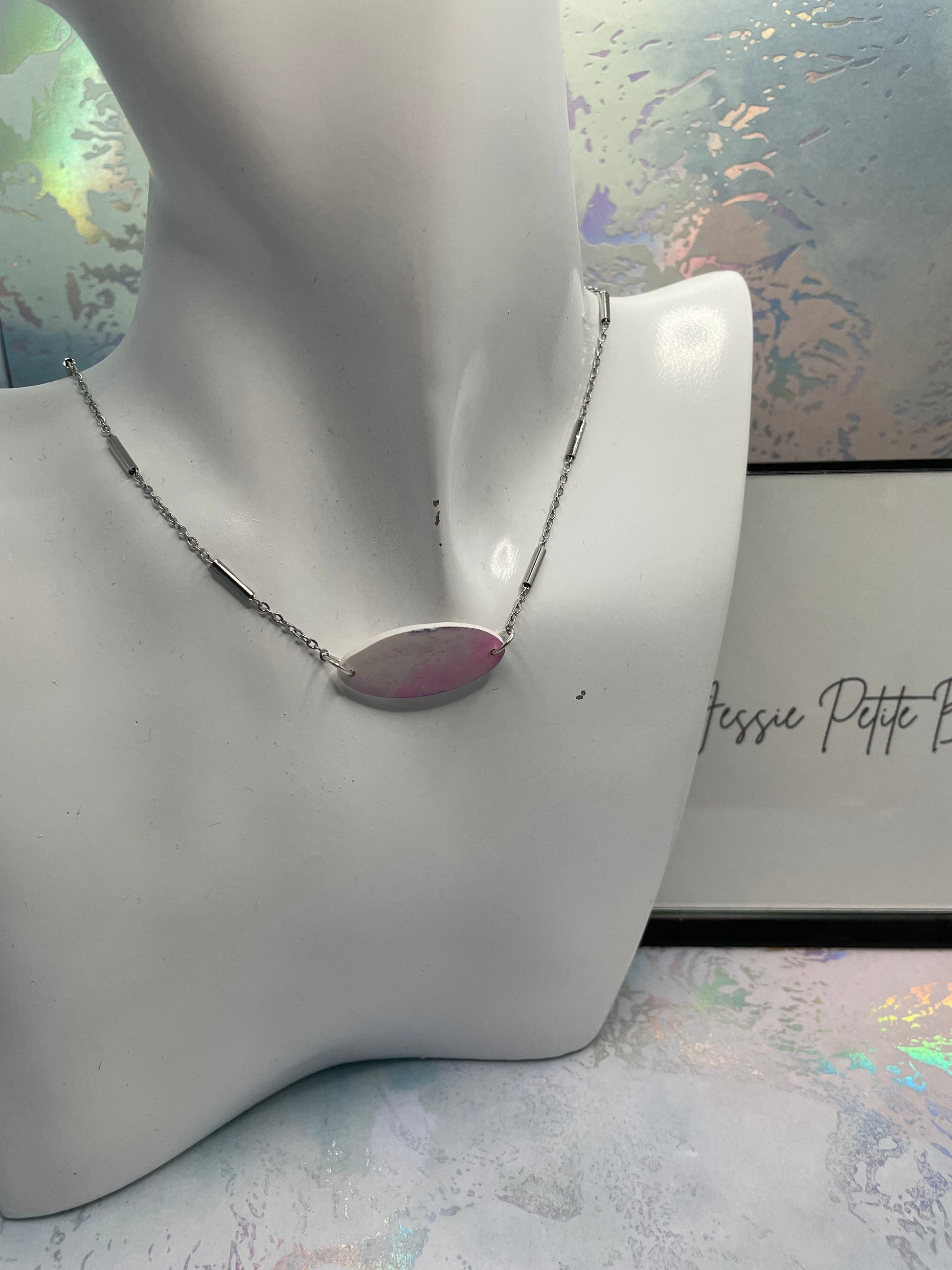 Pendentif argile ovale blanc/rose 18'' Acier Inoxydable+Sans Nickel