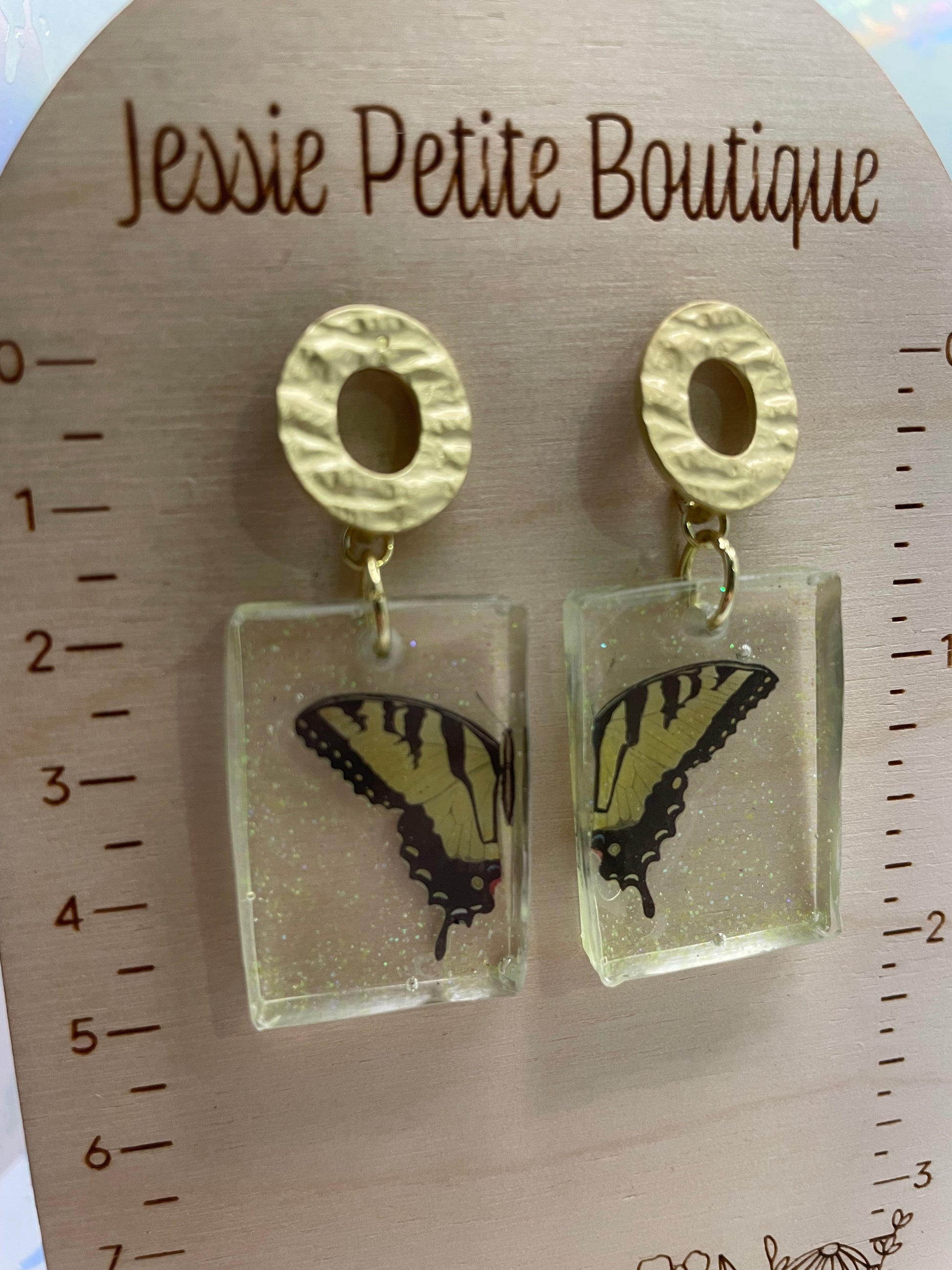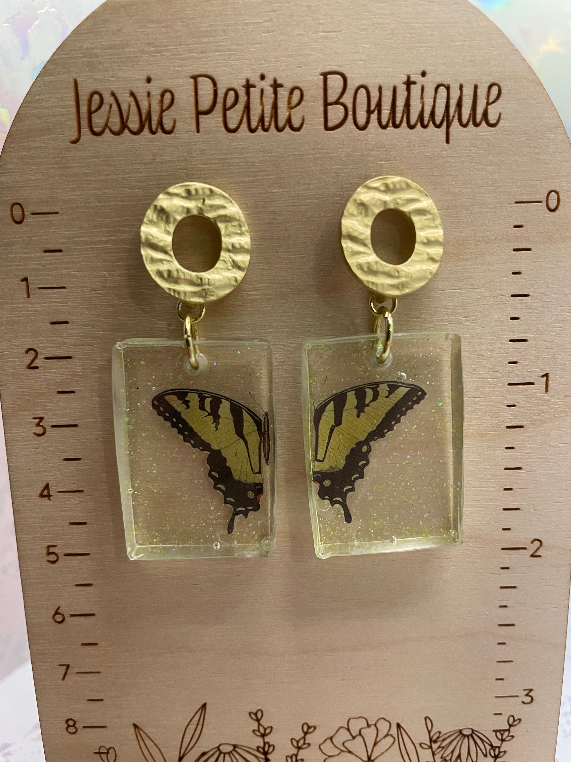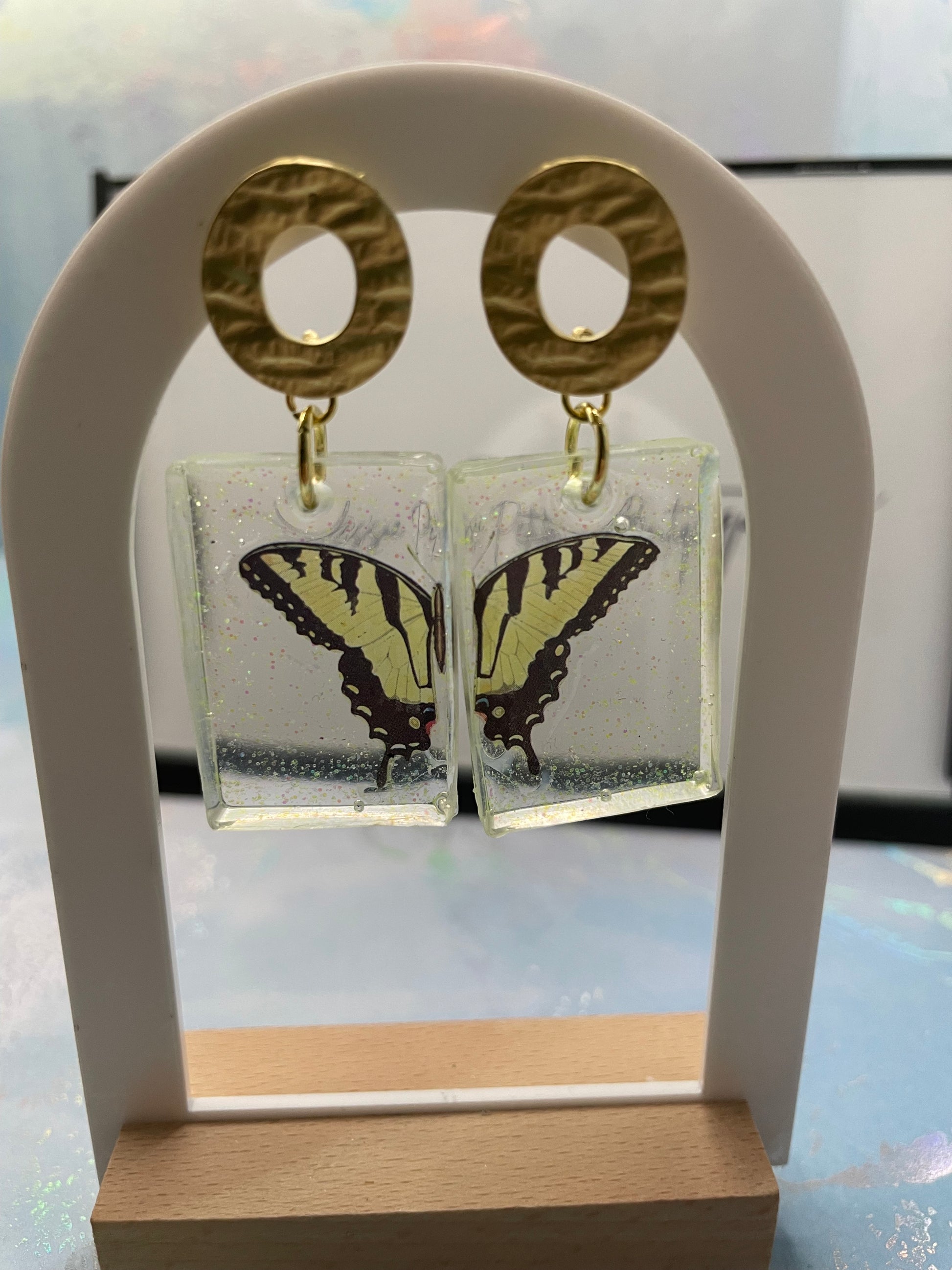 Boucles d'oreilles rectangle papillon jaunes et noires scintillantes