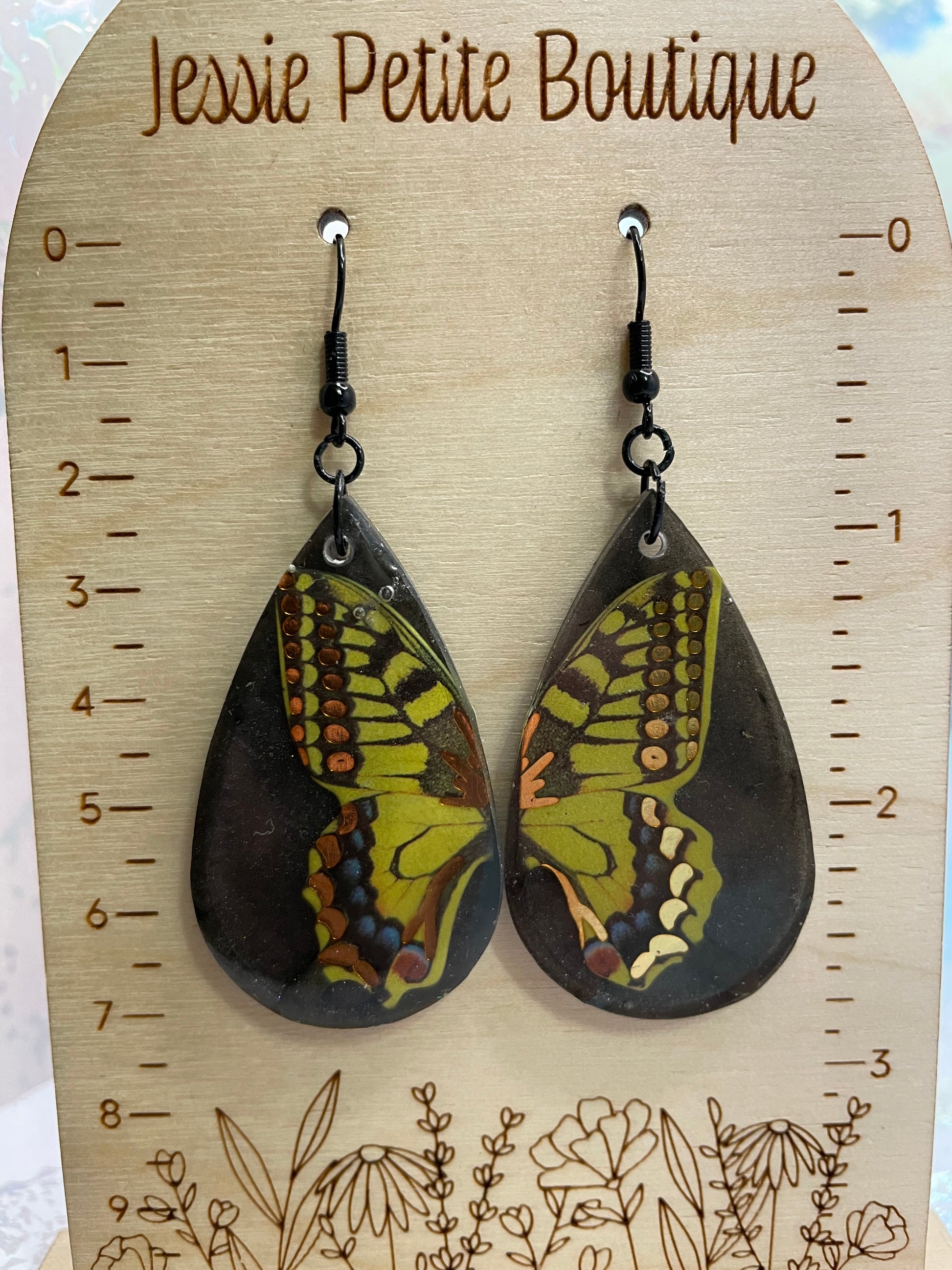 Ces boucles d'oreilles en forme de goutte, au design saisissant, arborent un fond noir audacieux orné d'un délicat papillon jaune, créé à partir de résine et de poudre de mica. Leur design léger et leur élégant fermoir à crochet en font un accessoire idéal pour ajouter une touche de fantaisie à toutes vos tenues.