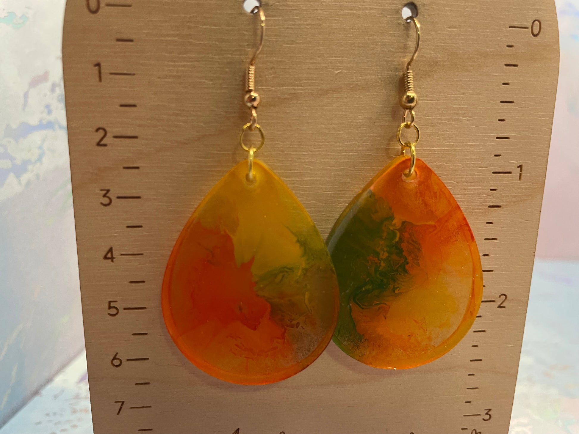 Boucles d’oreilles goutte en résine jaune, orange et vert