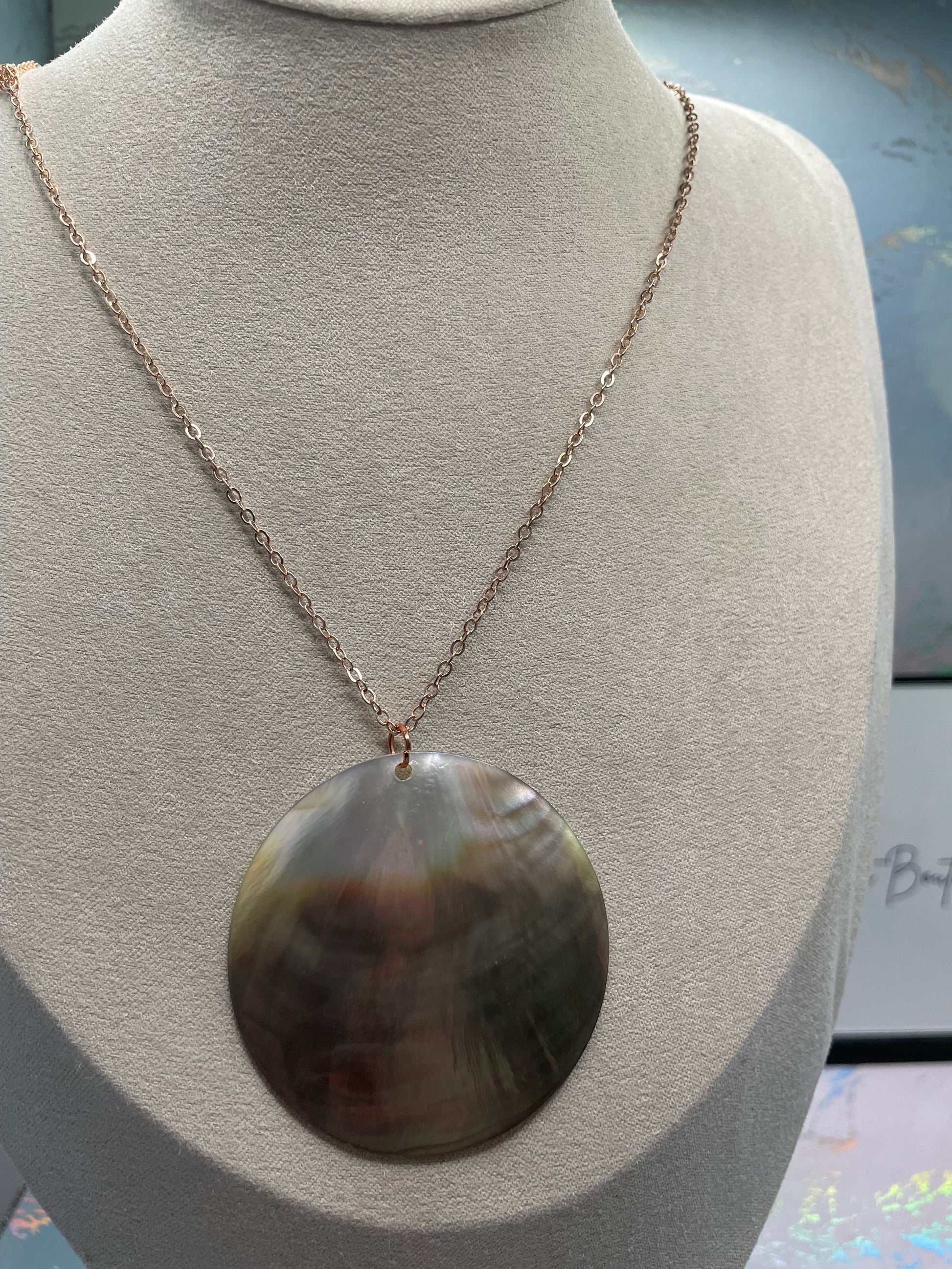 This elegant dark shell necklace is a bold statement piece, perfect for adding a touch of natural beauty to your style. The pendant features a round dark shell design, measuring 5 cm in both width and height, and is suspended from a 20-inch rose gold chain, making it a versatile accessory for various outfits.