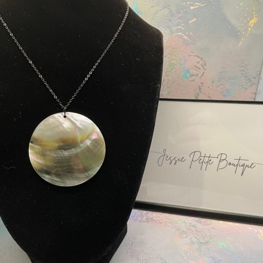 This elegant dark shell necklace is a bold statement piece, perfect for adding a touch of natural beauty to your style. The pendant features a round dark shell design, measuring 5 cm in both width and height, and is suspended from a 25-inch black chain, making it a versatile accessory for various outfits.