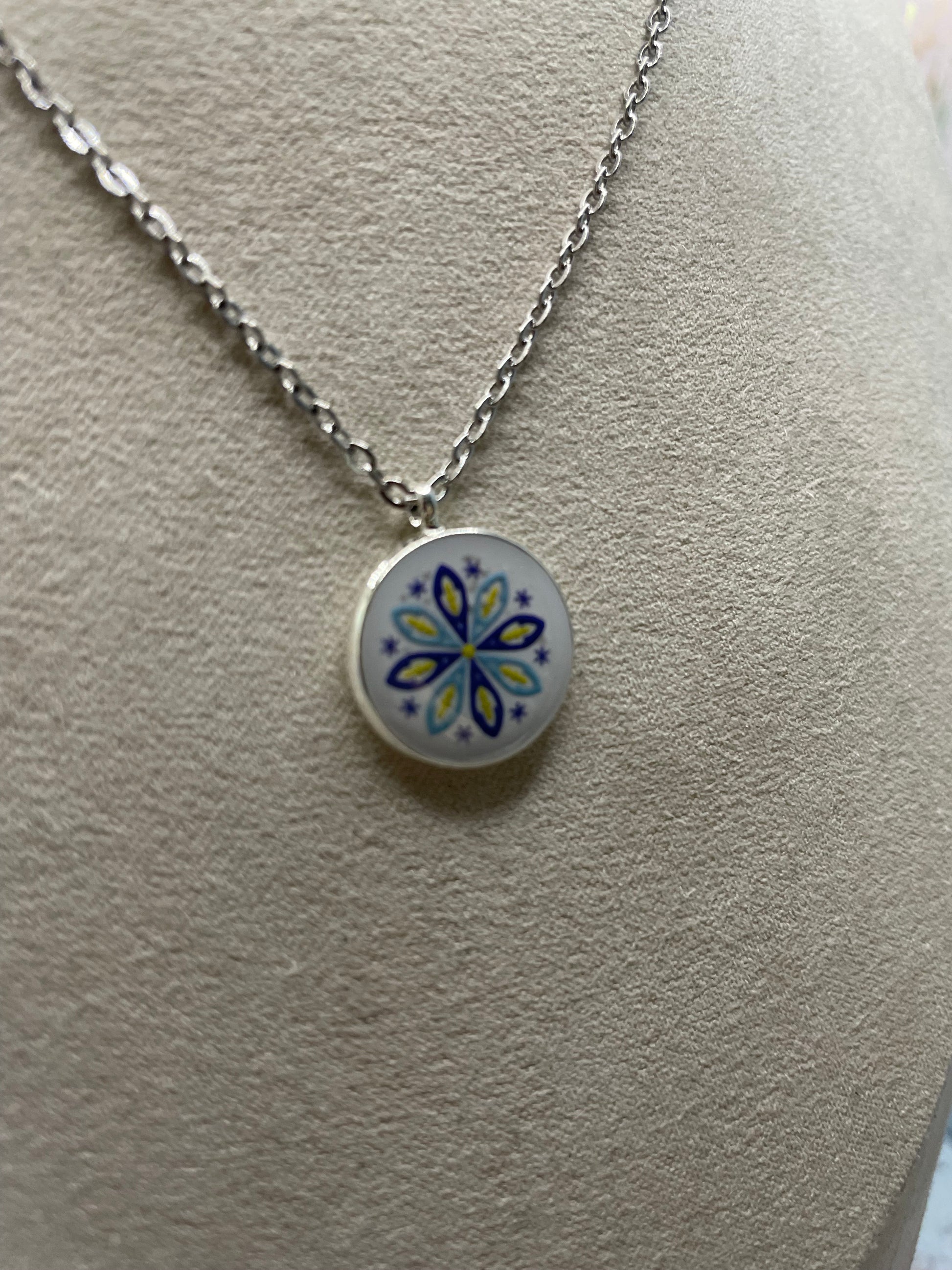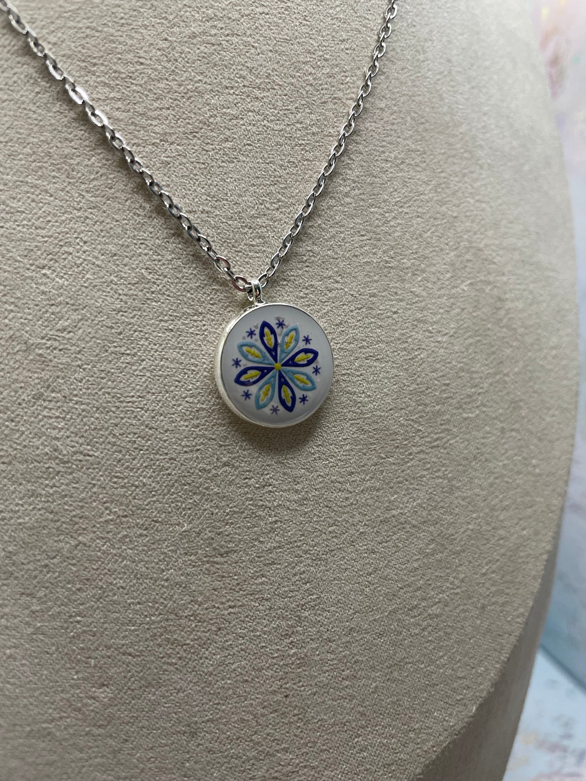 This delicate round pendant necklace features a charming geometric floral motif, carefully set under a smooth resin dome. The soft contrast between the detailed design and the clean silver-toned bezel creates a refined, timeless look that’s easy to wear every day or layer with other necklaces.