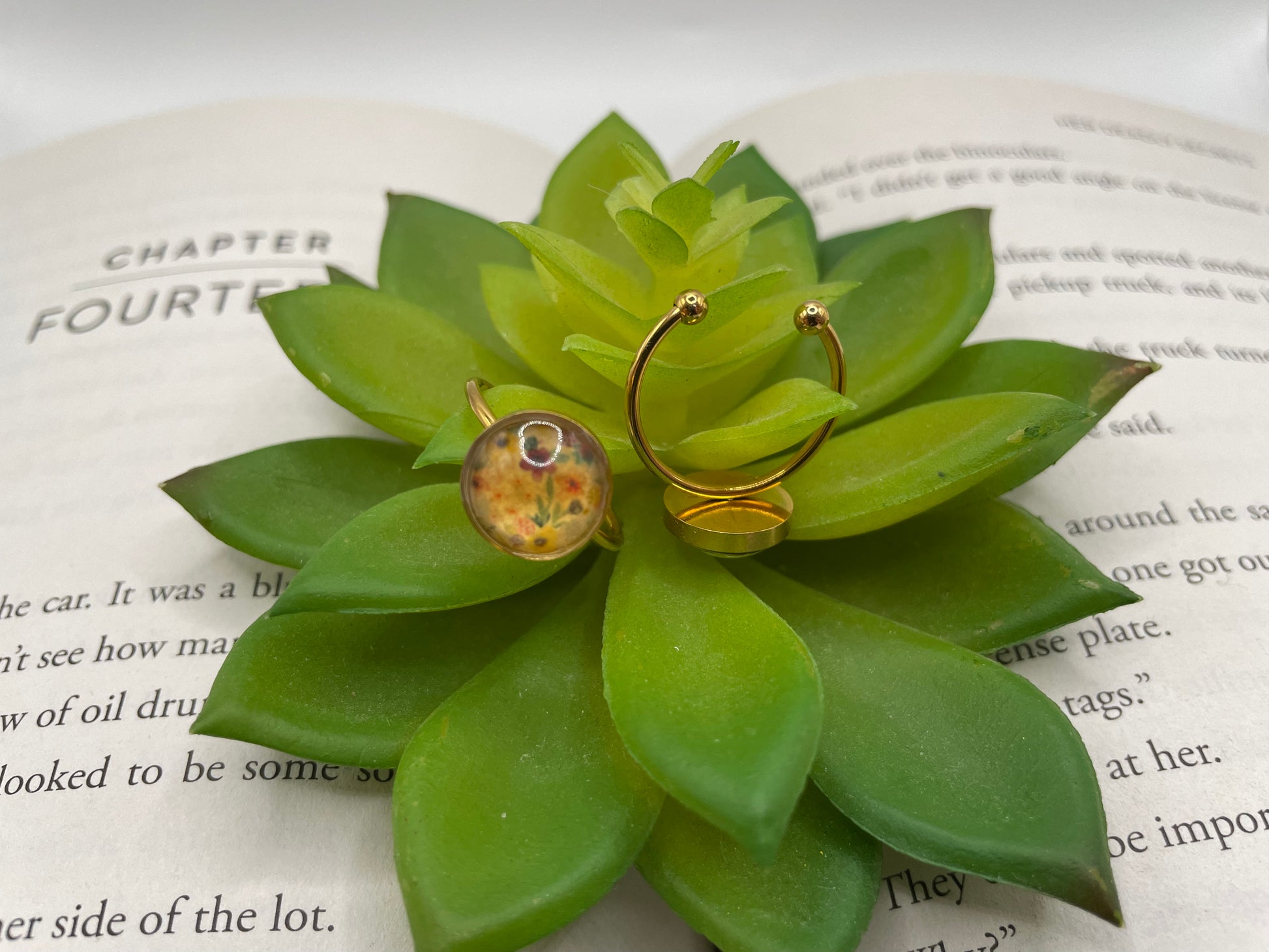 Adjustable Gold Floral Rings – Stainless Steel & Glass Cabochon