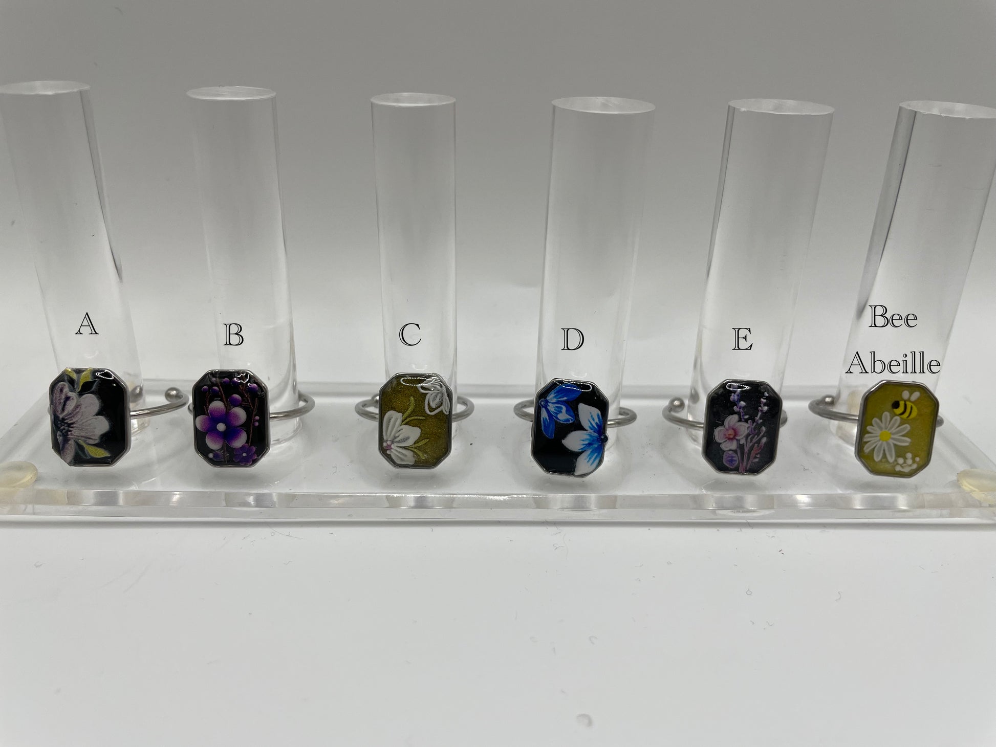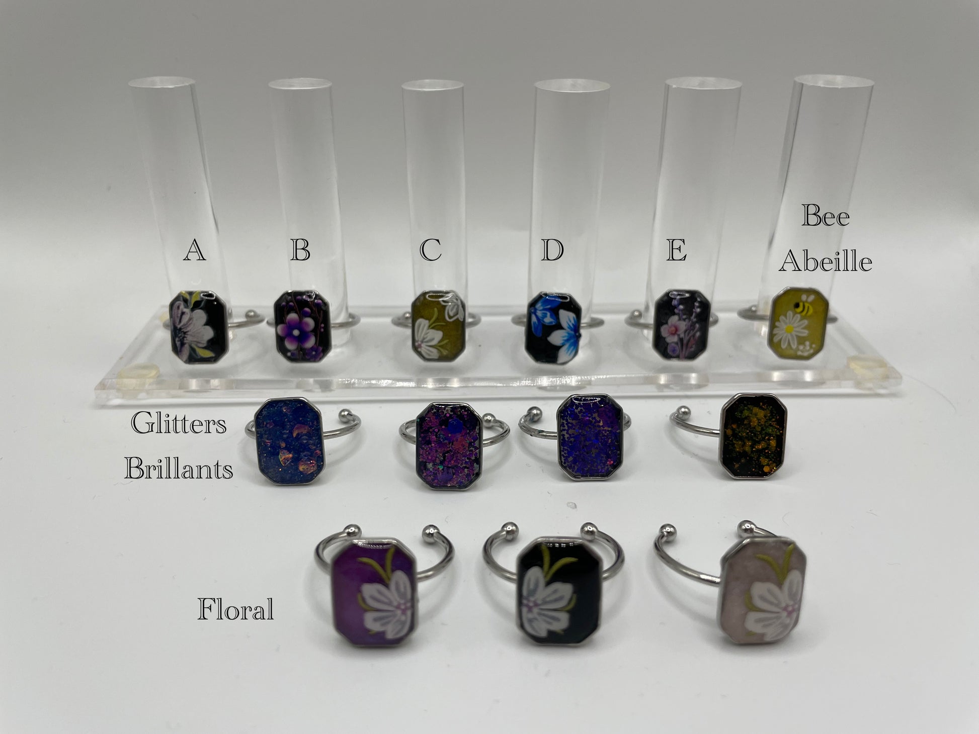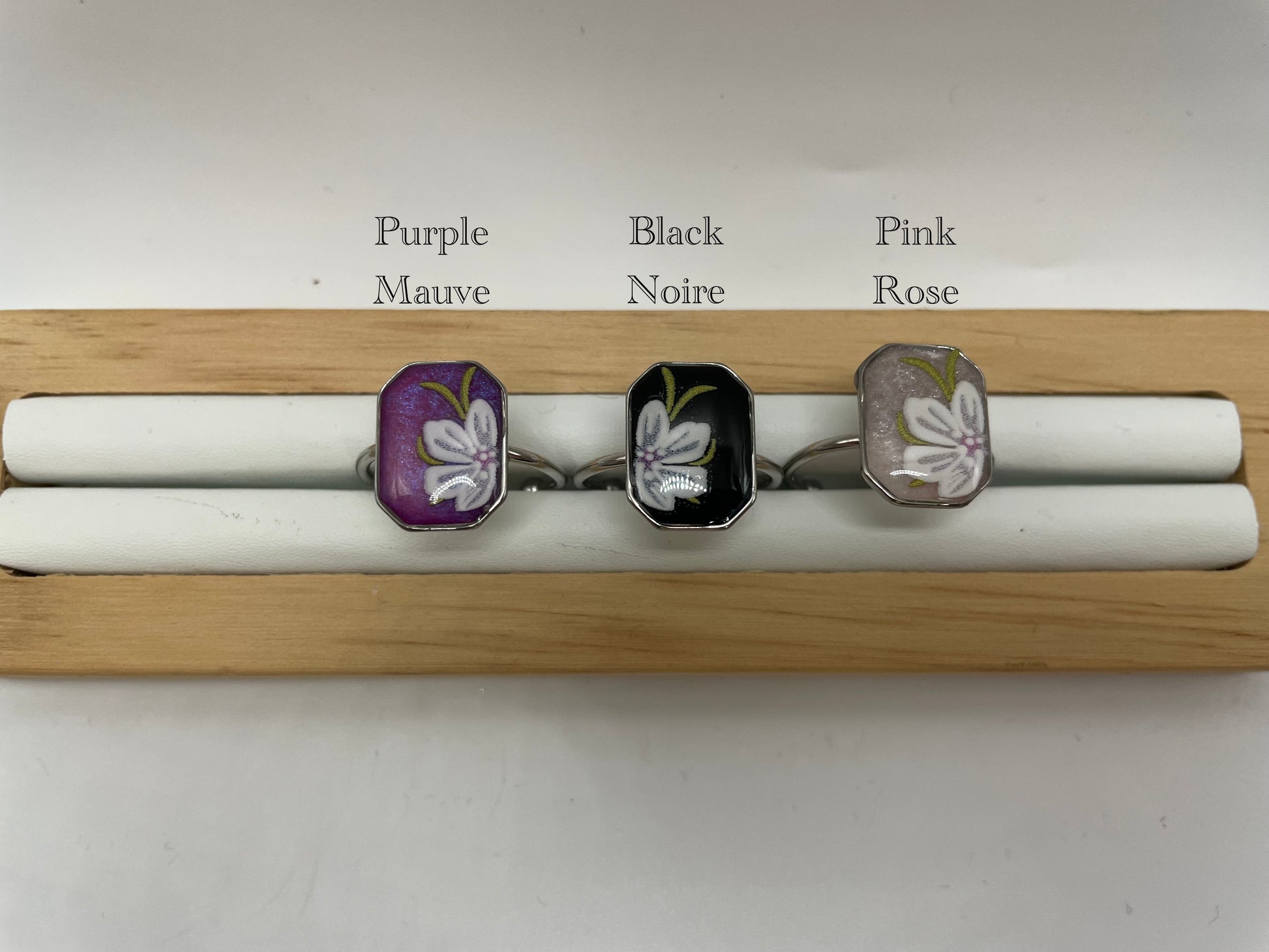 Available in a variety of floral and shimmer options, each ring adds a graceful and timeless charm to your look. Lightweight and comfortable, perfect for everyday wear or as a thoughtful gift.