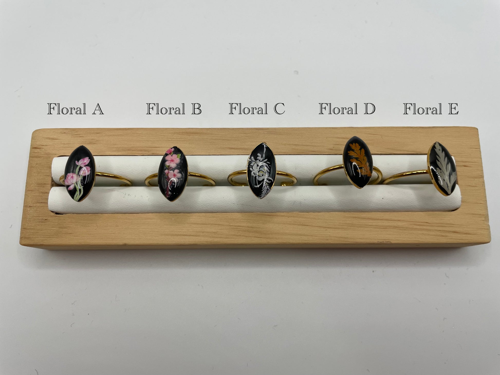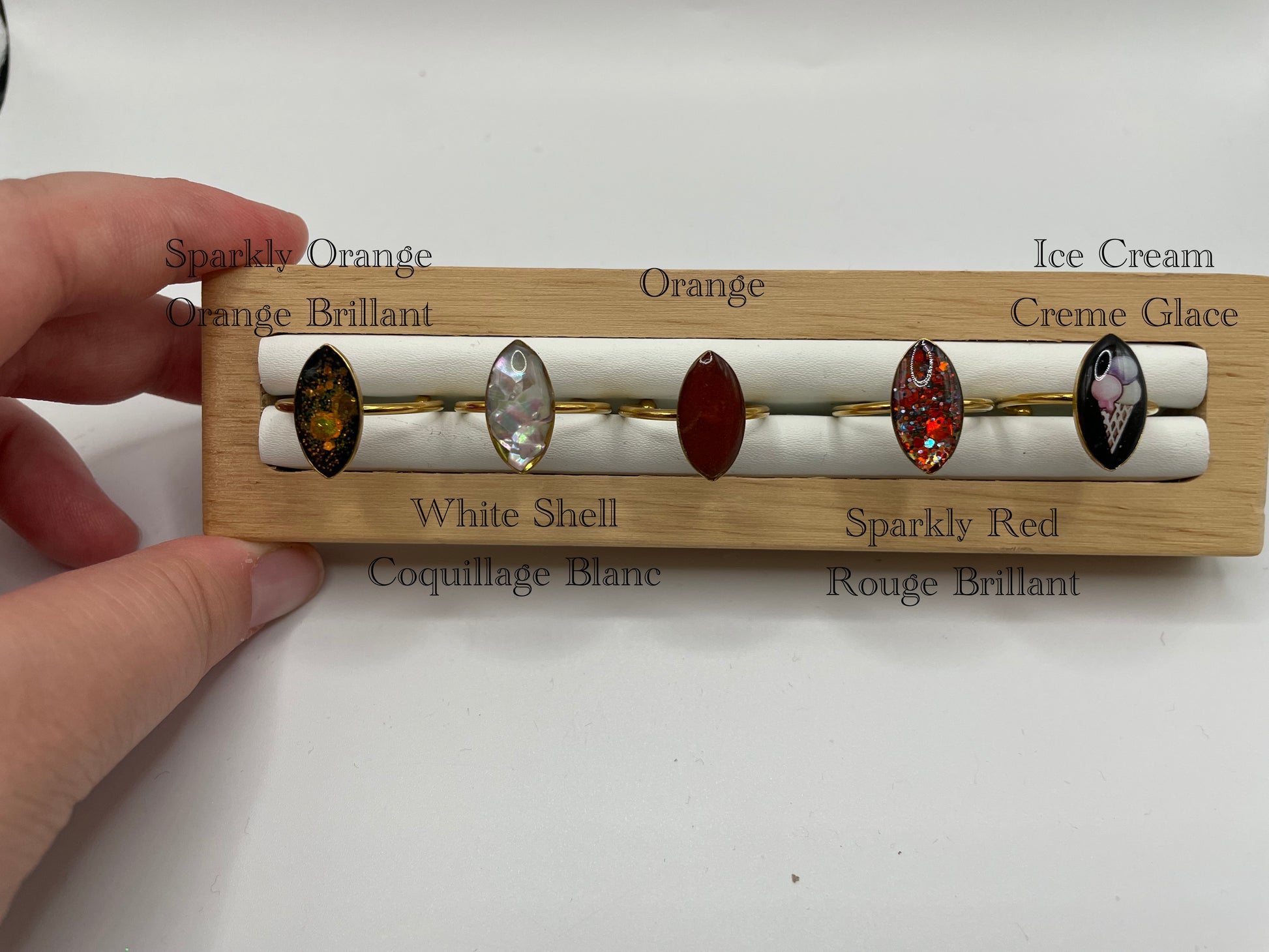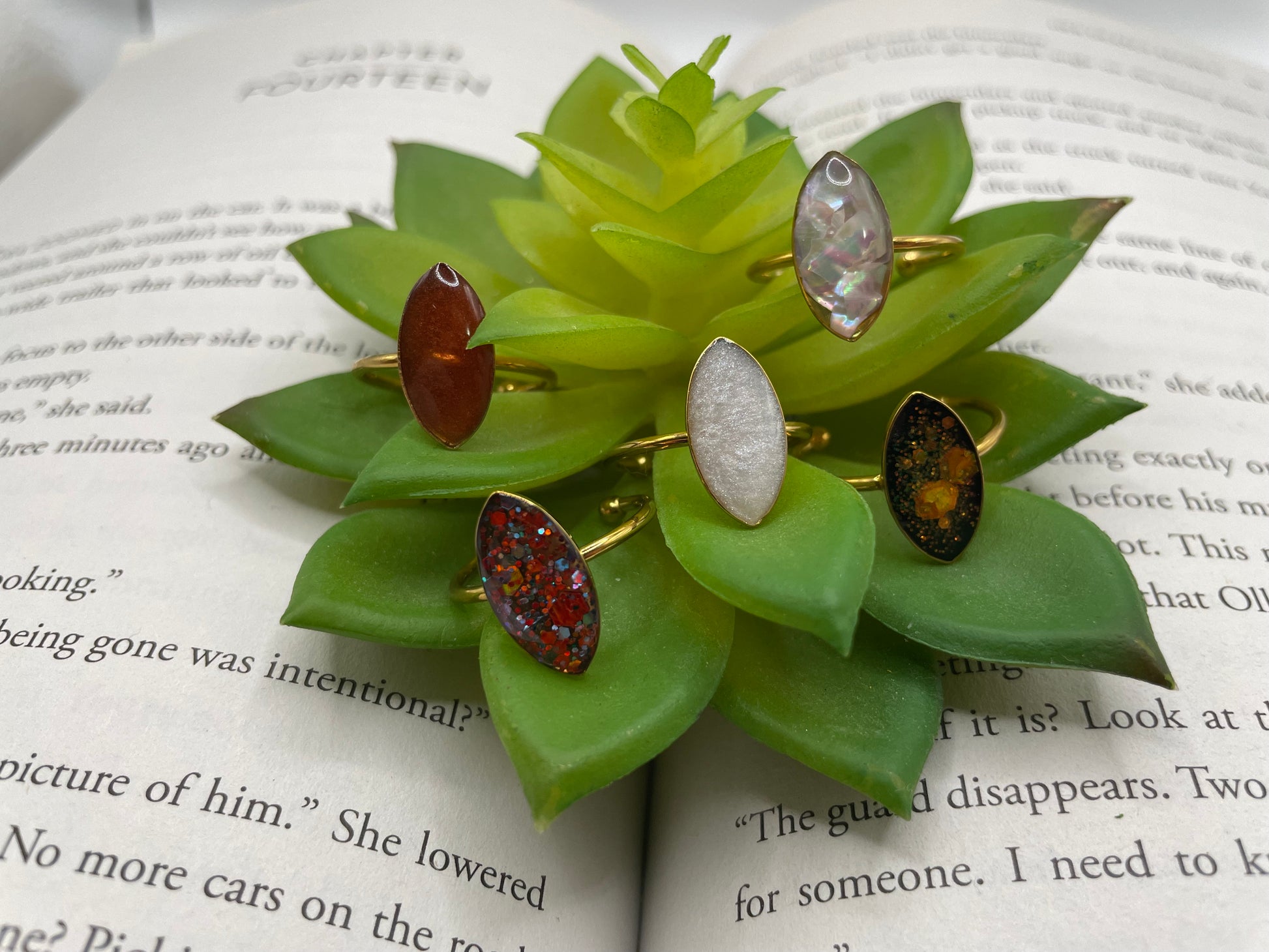 Elegant and refined, these adjustable oval rings combine stainless steel with artisanal details made from resin, mica powder, stickers, or dried flowers. Each ring features a unique glossy finish, capturing light beautifully. Perfect for everyday wear or as a delicate accent for special occasions.