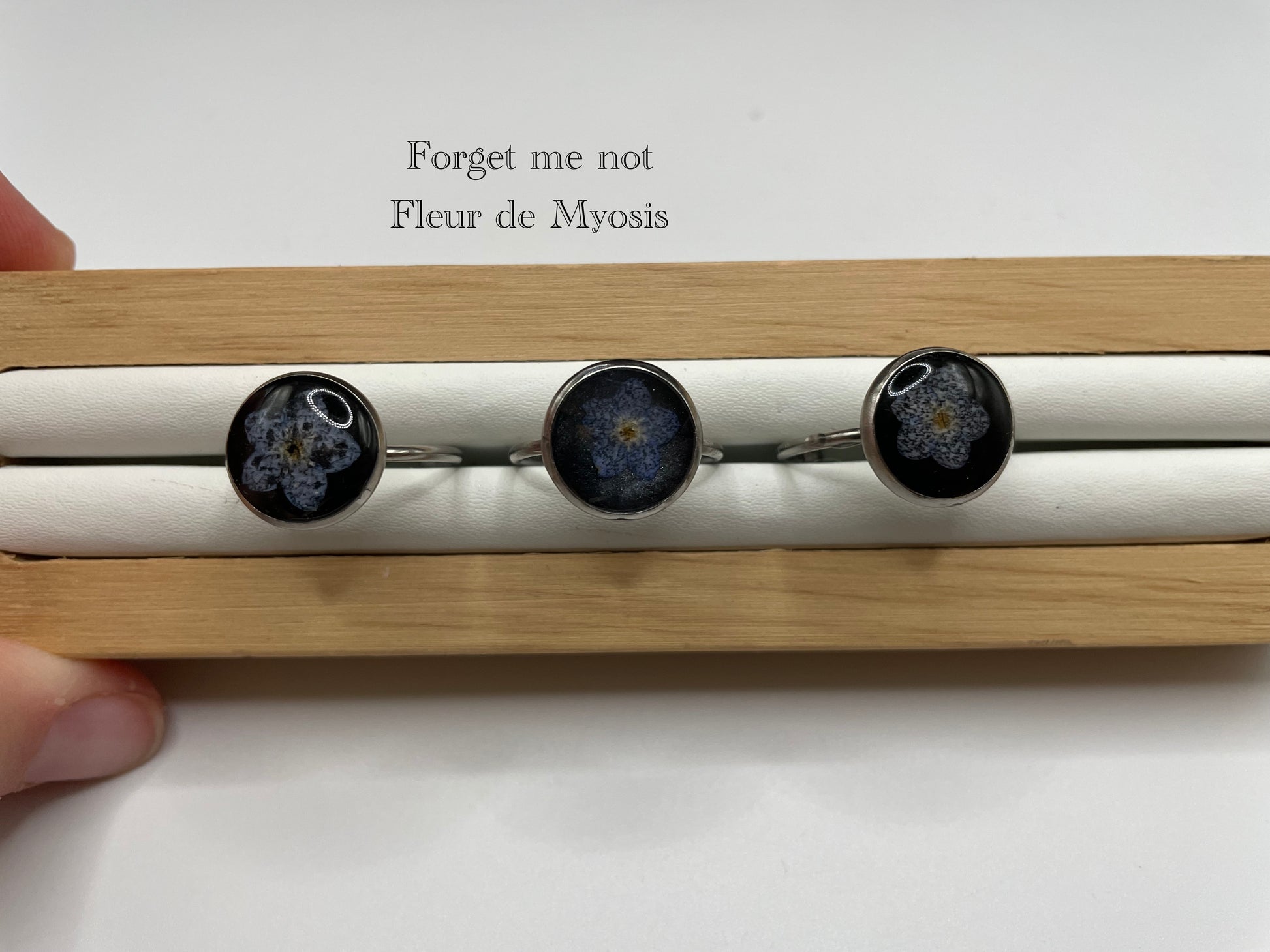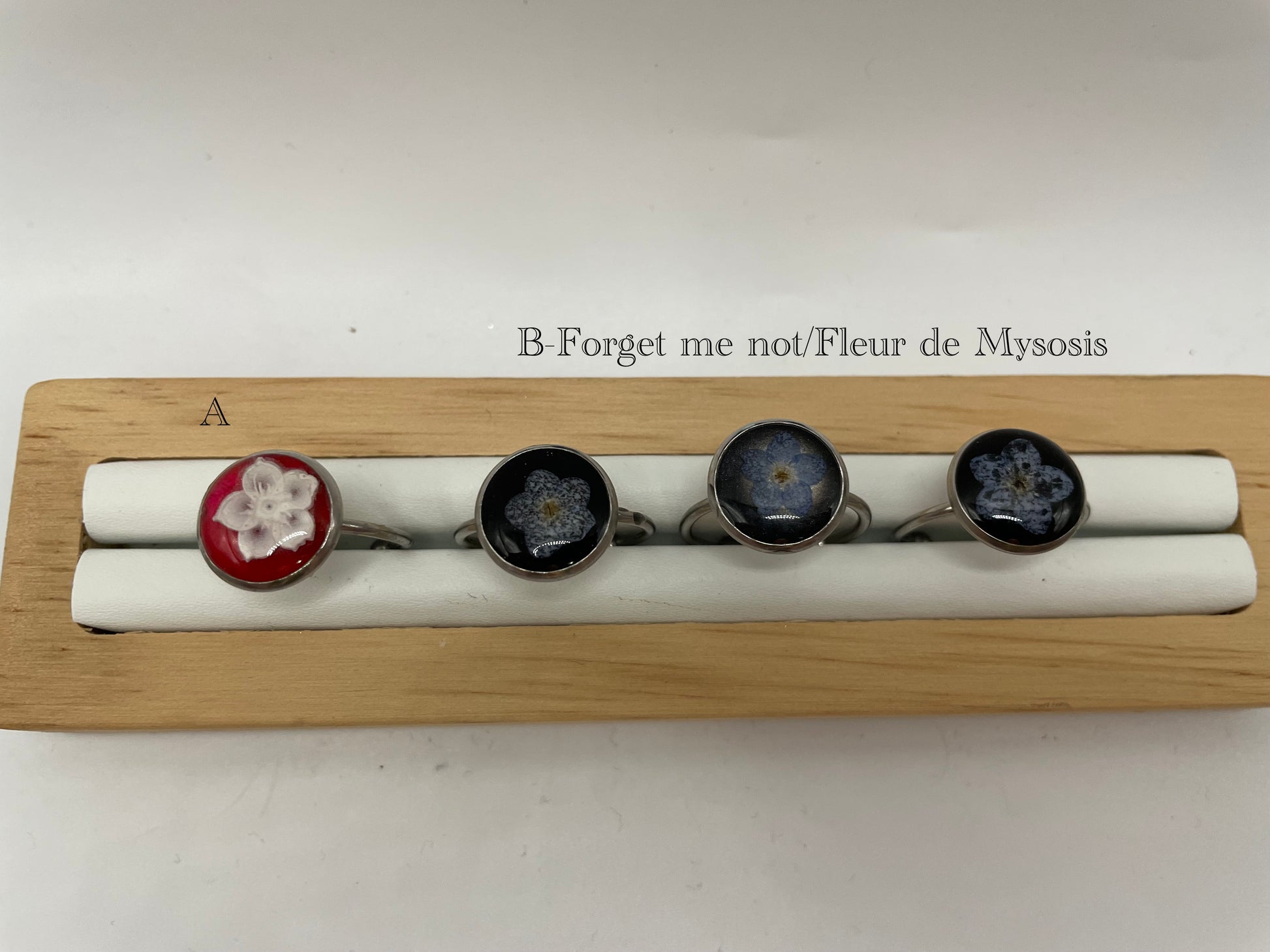 Available in two charming options — A: White flower on red background and B: Forget-me-not flower on black background — these rings bring a touch of nature-inspired grace to your everyday style.