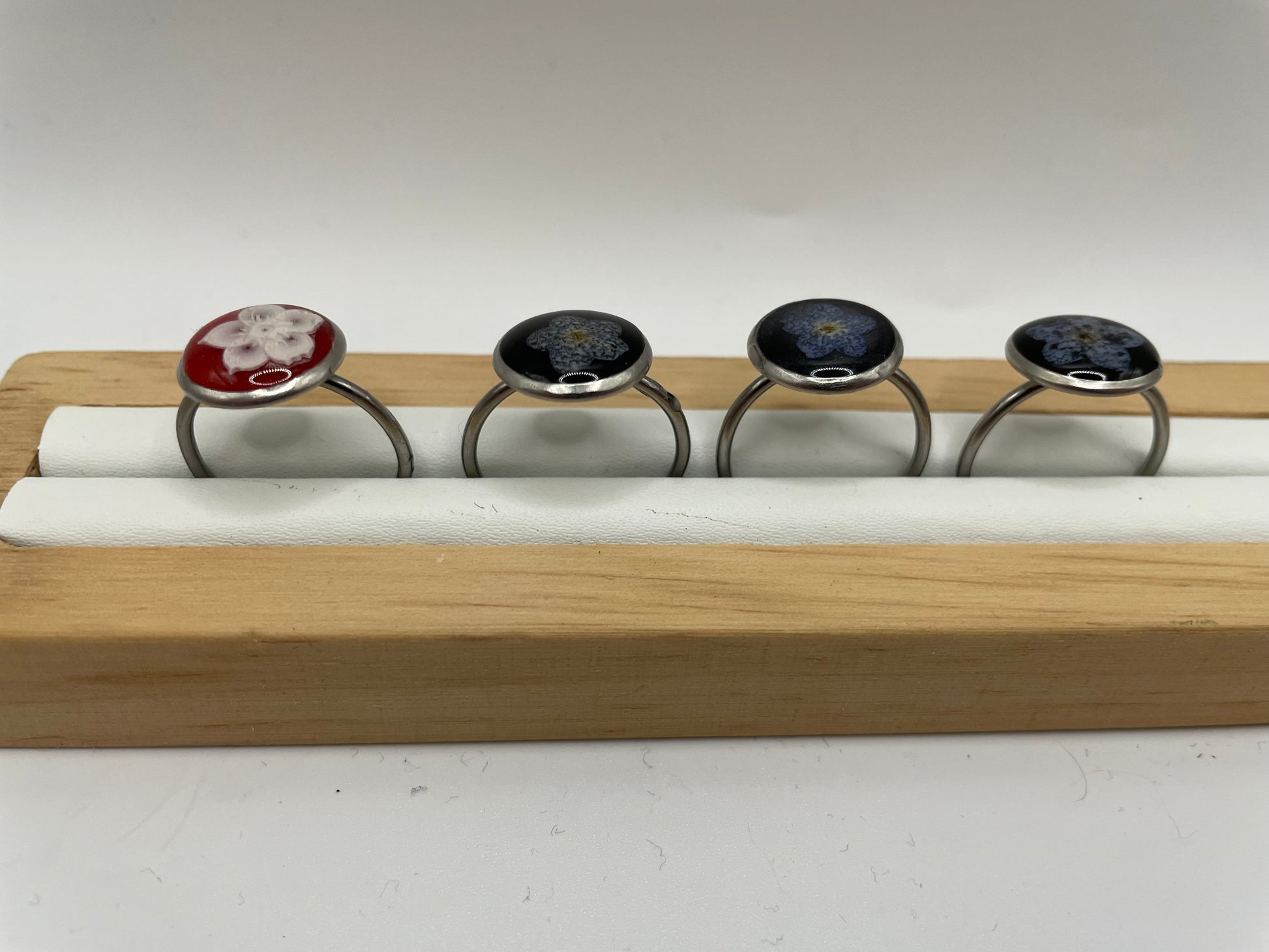 Elegant and timeless, these stainless steel adjustable rings feature flowers preserved in clear resin, capturing the beauty of nature in every detail. Each piece is unique, showcasing the delicate petals and natural tones that make it truly one of a kind.