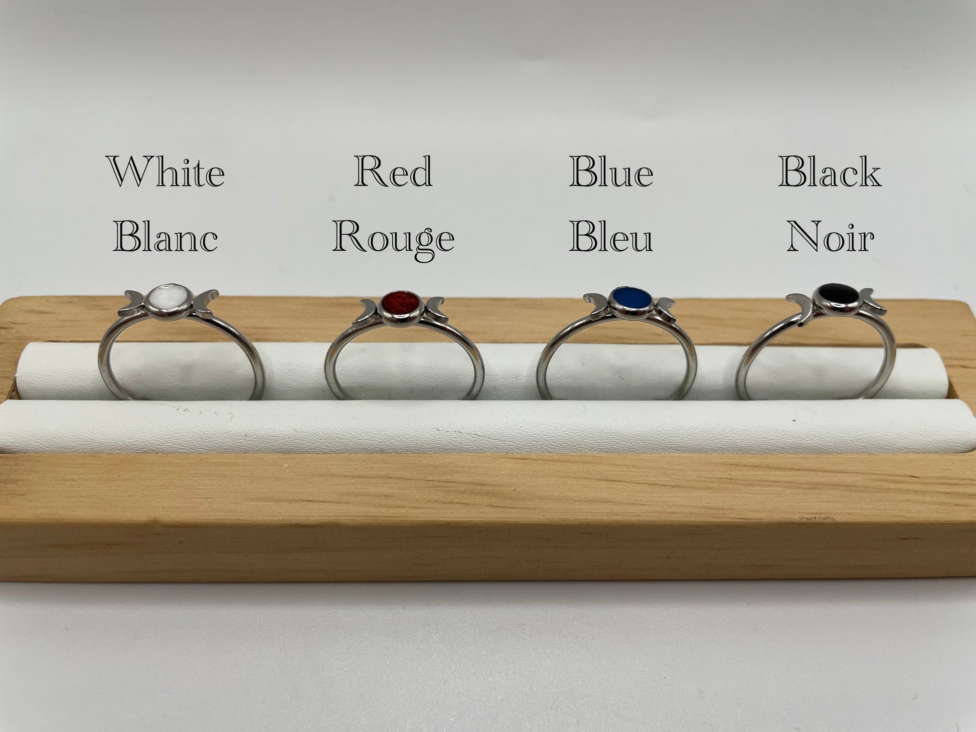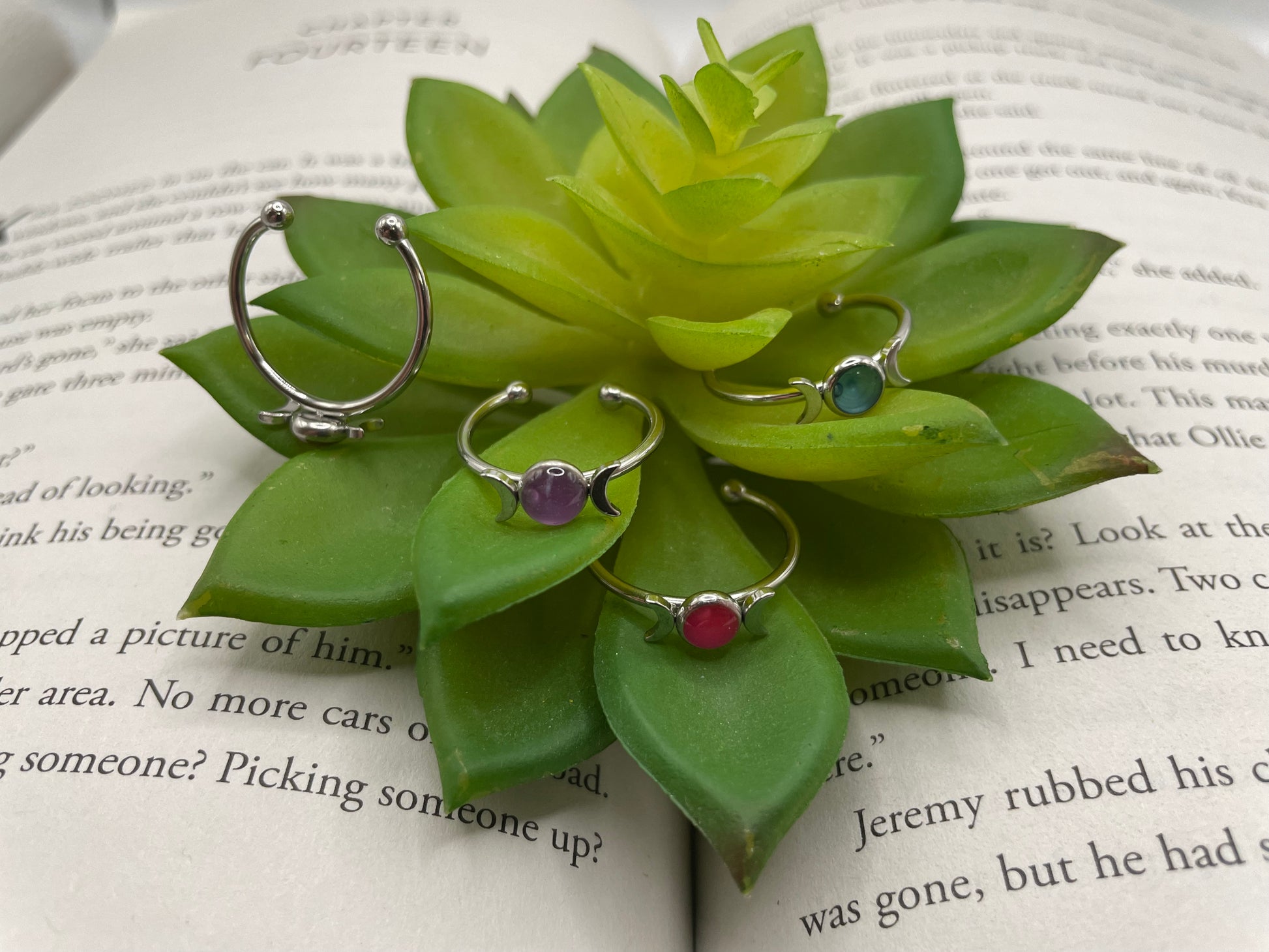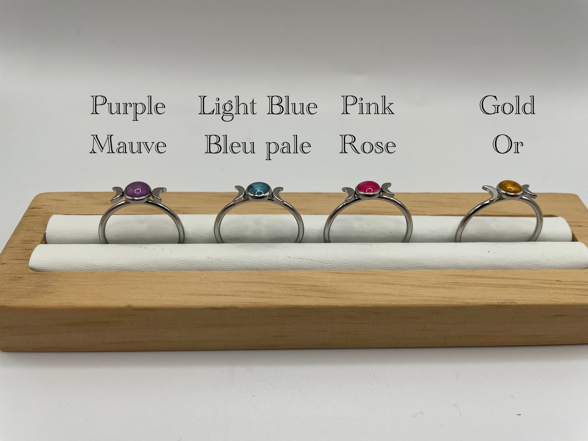 Delicate and modern, this stainless steel adjustable ring features a central round base framed by two crescent moon shapes. Available in eight beautiful colors, it’s a versatile piece that adds a subtle celestial touch to any outfit. Lightweight and comfortable, it’s perfect for everyday wear or as part of a layered jewelry look.