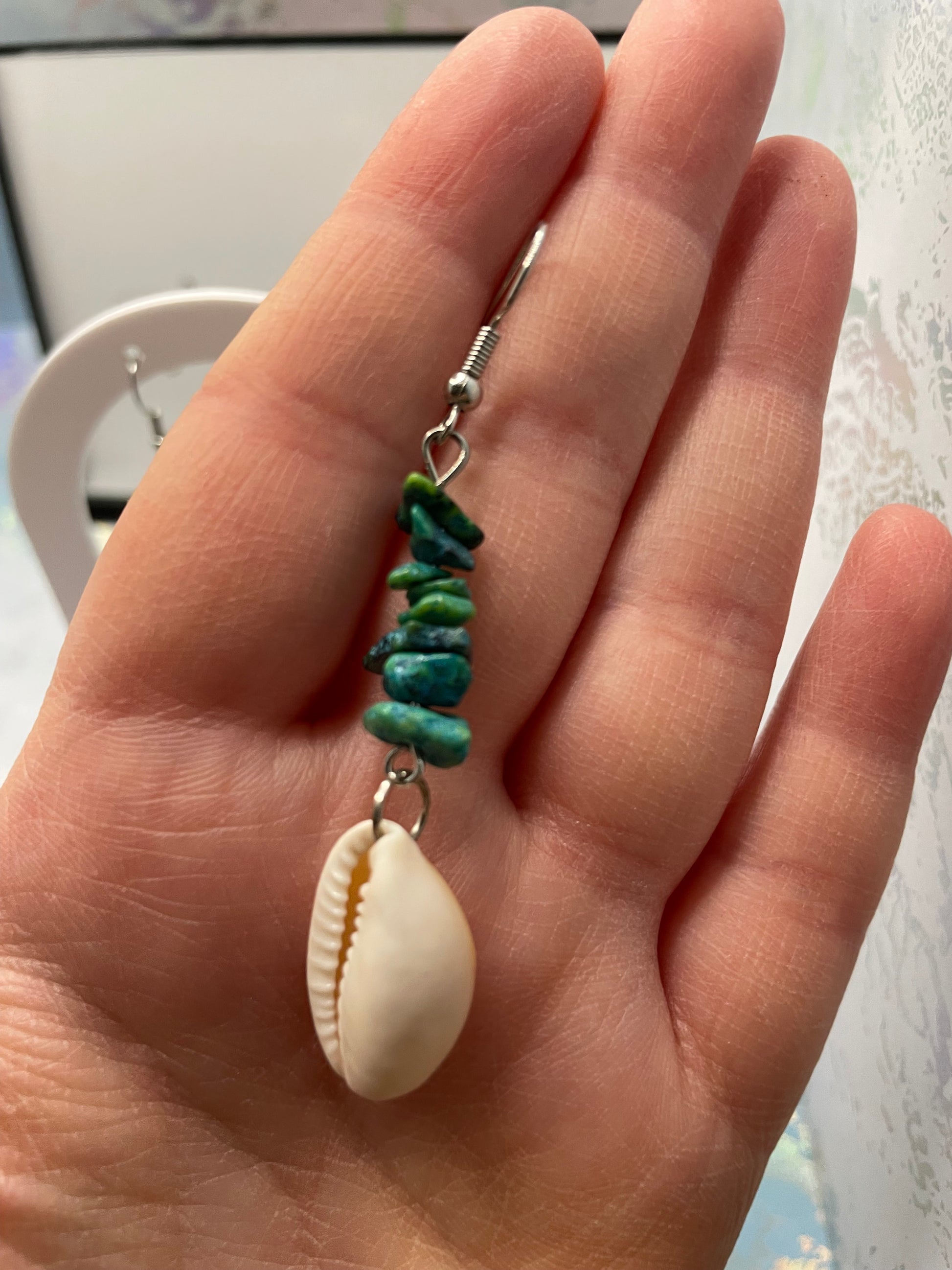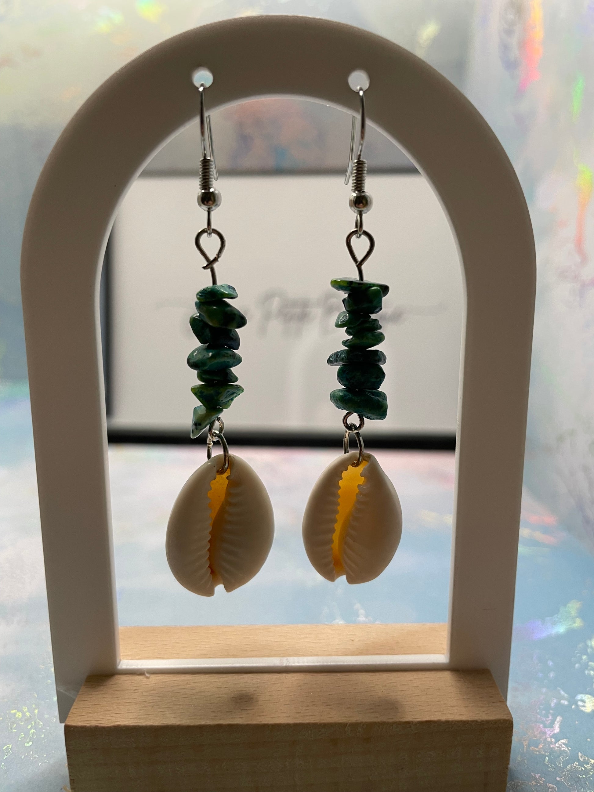 Inspired by the calm and beauty of the ocean, these handcrafted Aloha Earrings feature natural white shells paired with striking teal gemstone chips, perfect for a beachy yet elegant look. The dangling design offers an effortless flow, making them a great accessory for both casual and formal outfits.