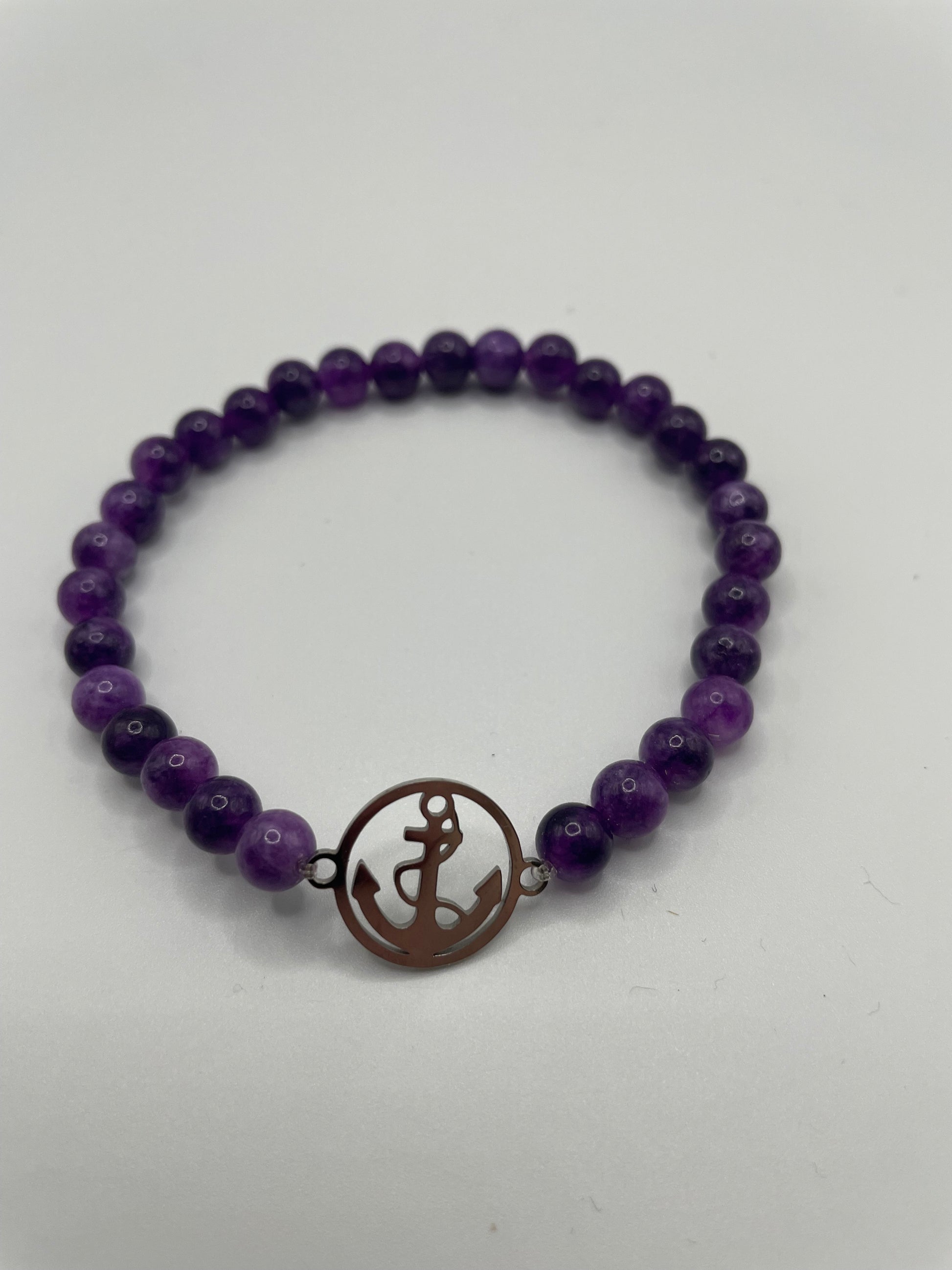 Amethyst Beaded Bracelet with Stainless Steel Anchor Charm