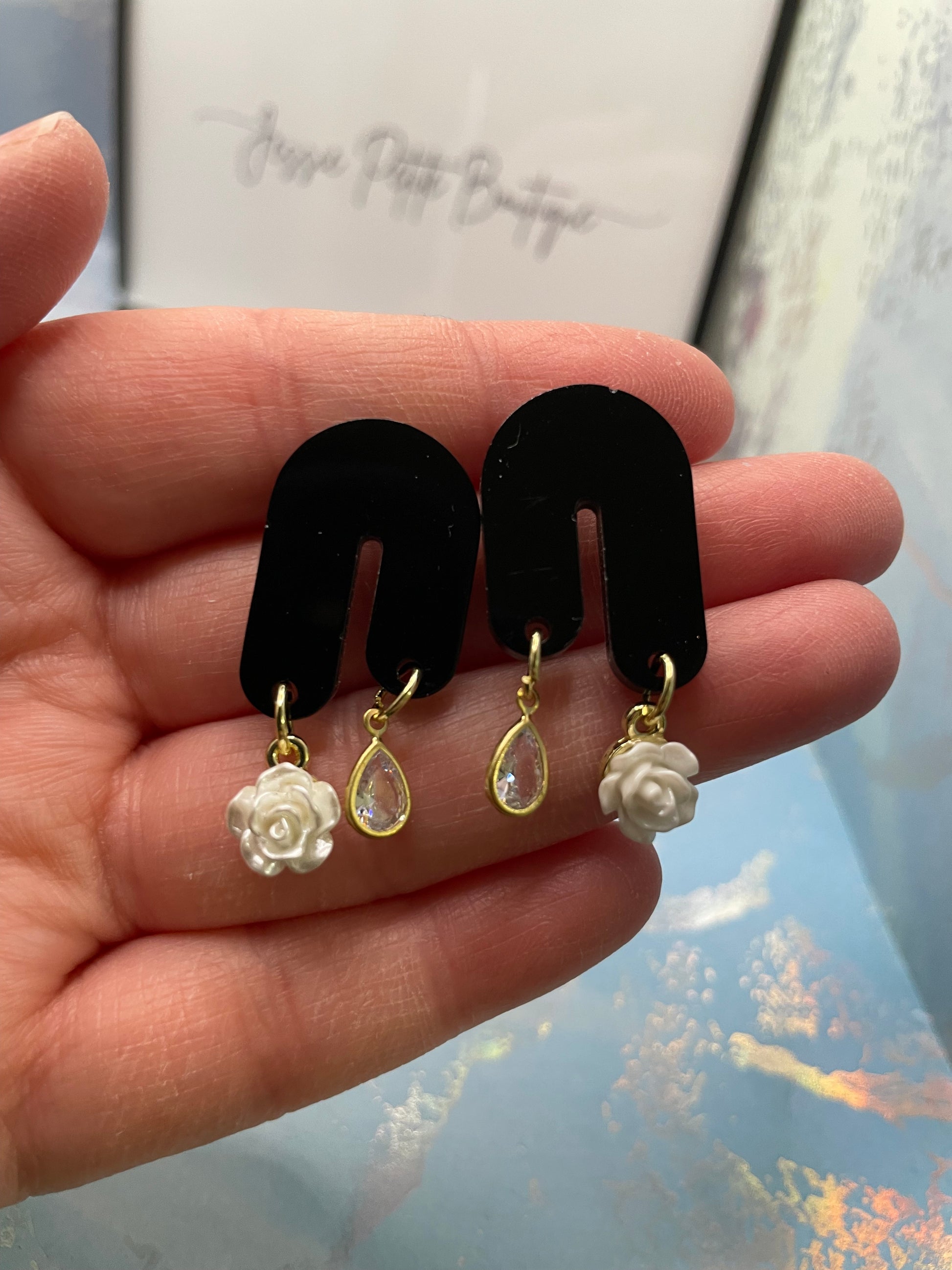 These delicate upside-down U-shaped earrings come in two vibrant options—black or orange. Each pair features a dangling zircon charm and a white rose, adding an elegant sparkle and feminine touch. Made with nickel-free materials, including resin and brass, these earrings are lightweight and comfortable for extended wear. The butterfly closure ensures they stay secure while enhancing any outfit with a pop of colour or a more classic style with a unique floral design and a zircon. Perfect for both day and evening wear!