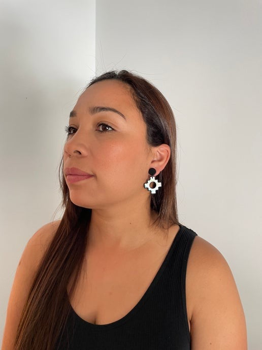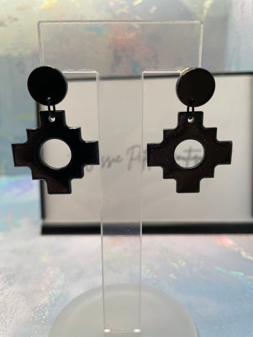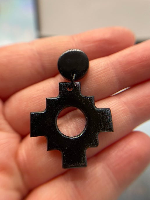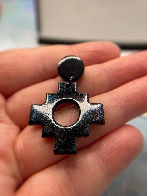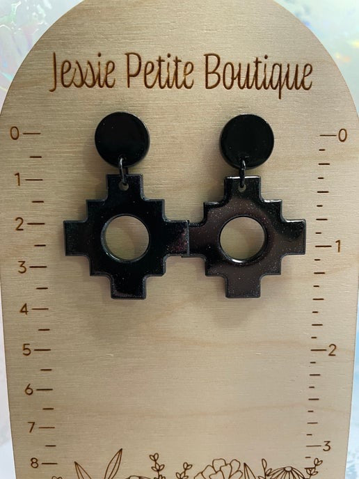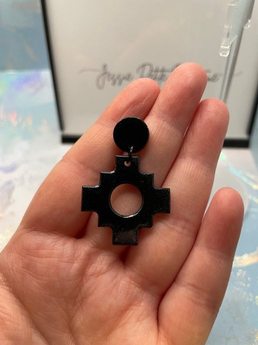 These Black Aztec-style cross earrings feature a bold geometric design, crafted from resin and mica powder. Paired with a sleek acetate acrylic round stud, these lightweight earrings are nickel-free, making them ideal for sensitive ears.