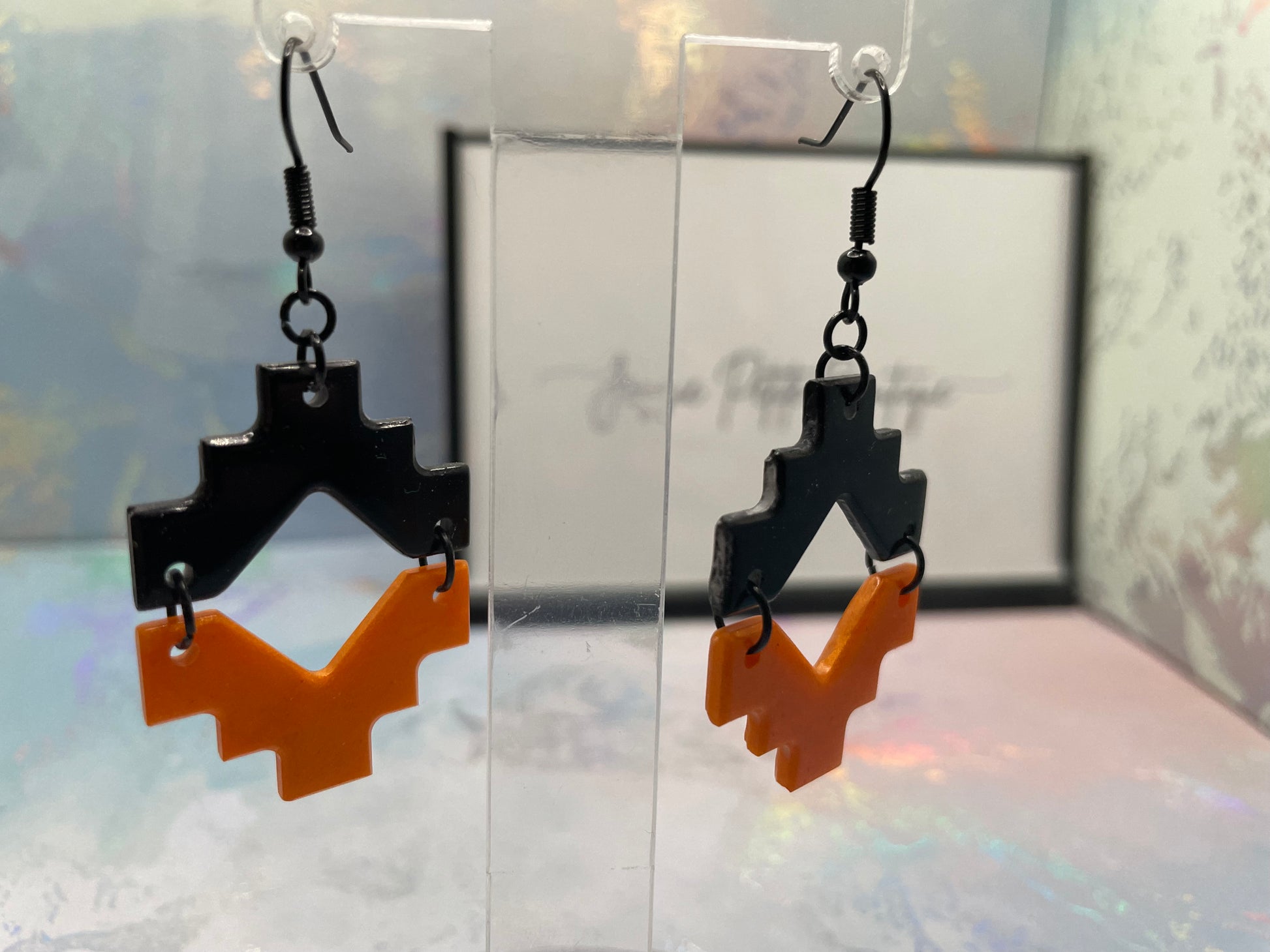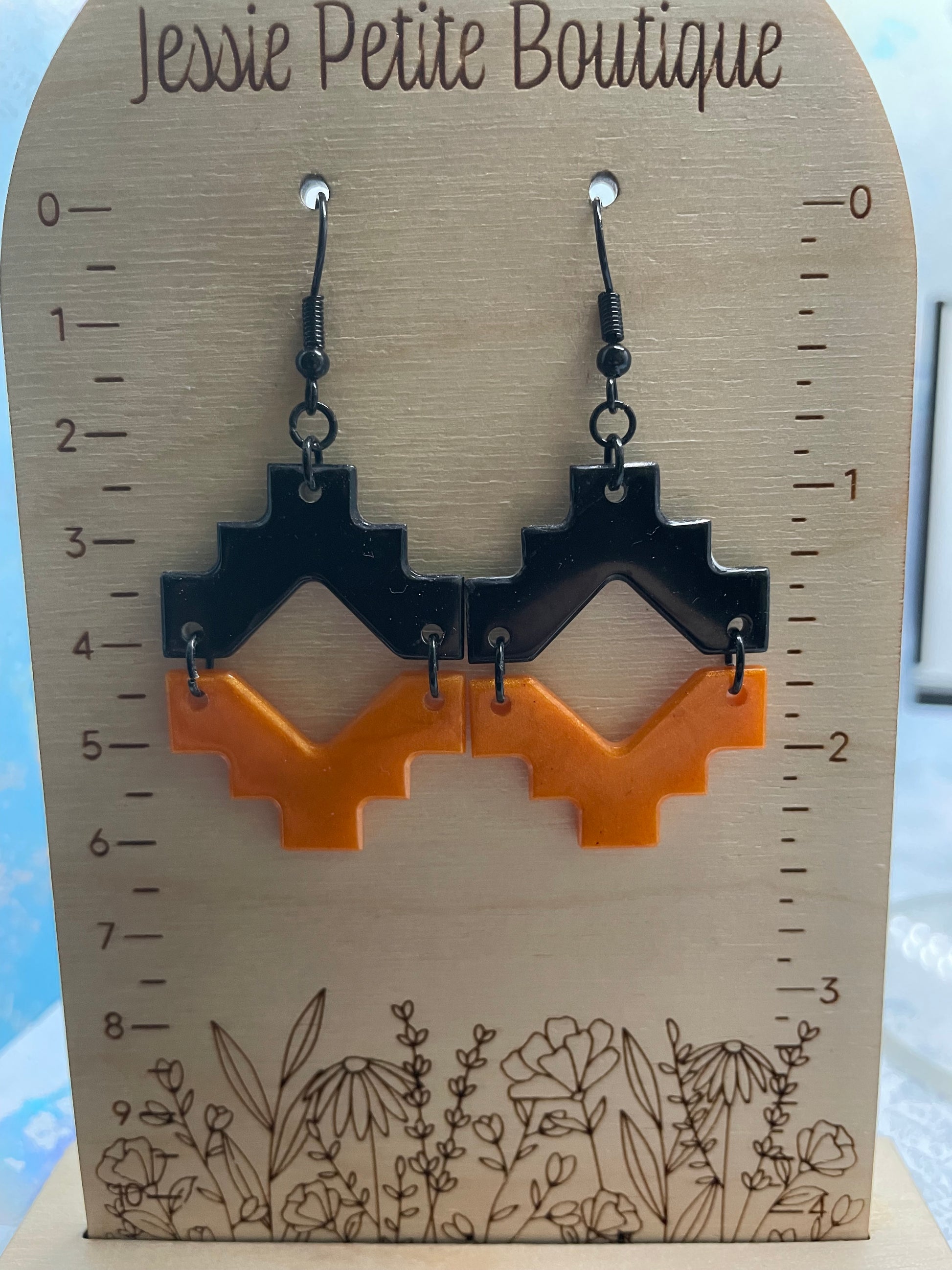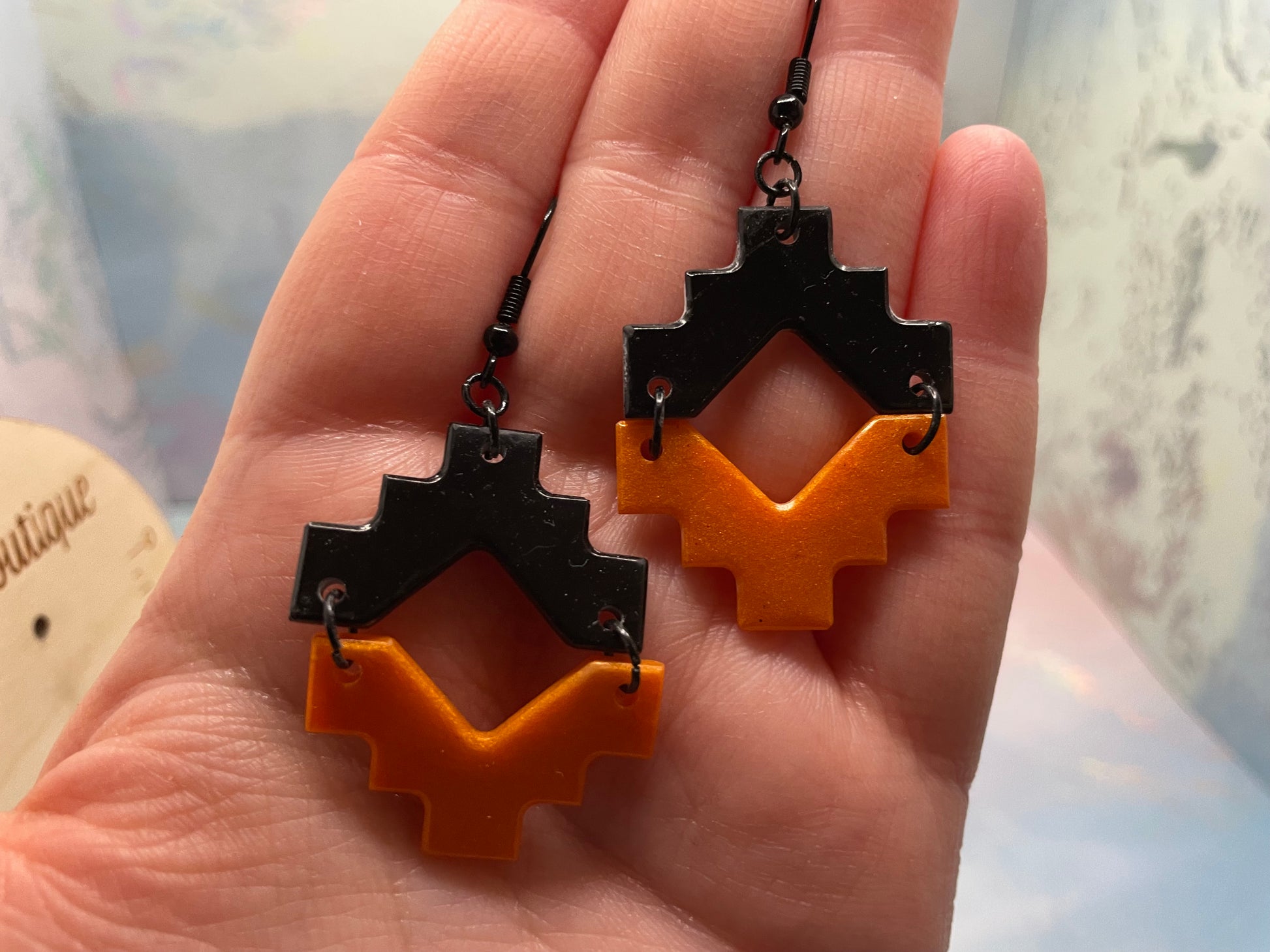 Inspired by Aztec geometric designs, these striking half- dangle earrings feature a bold black and orange colour combination, enhanced with mica powder shimmer for added depth. Crafted from lightweight resin, they provide effortless wear while making a statement. The black ear wire complements the design, ensuring a sleek and cohesive look.