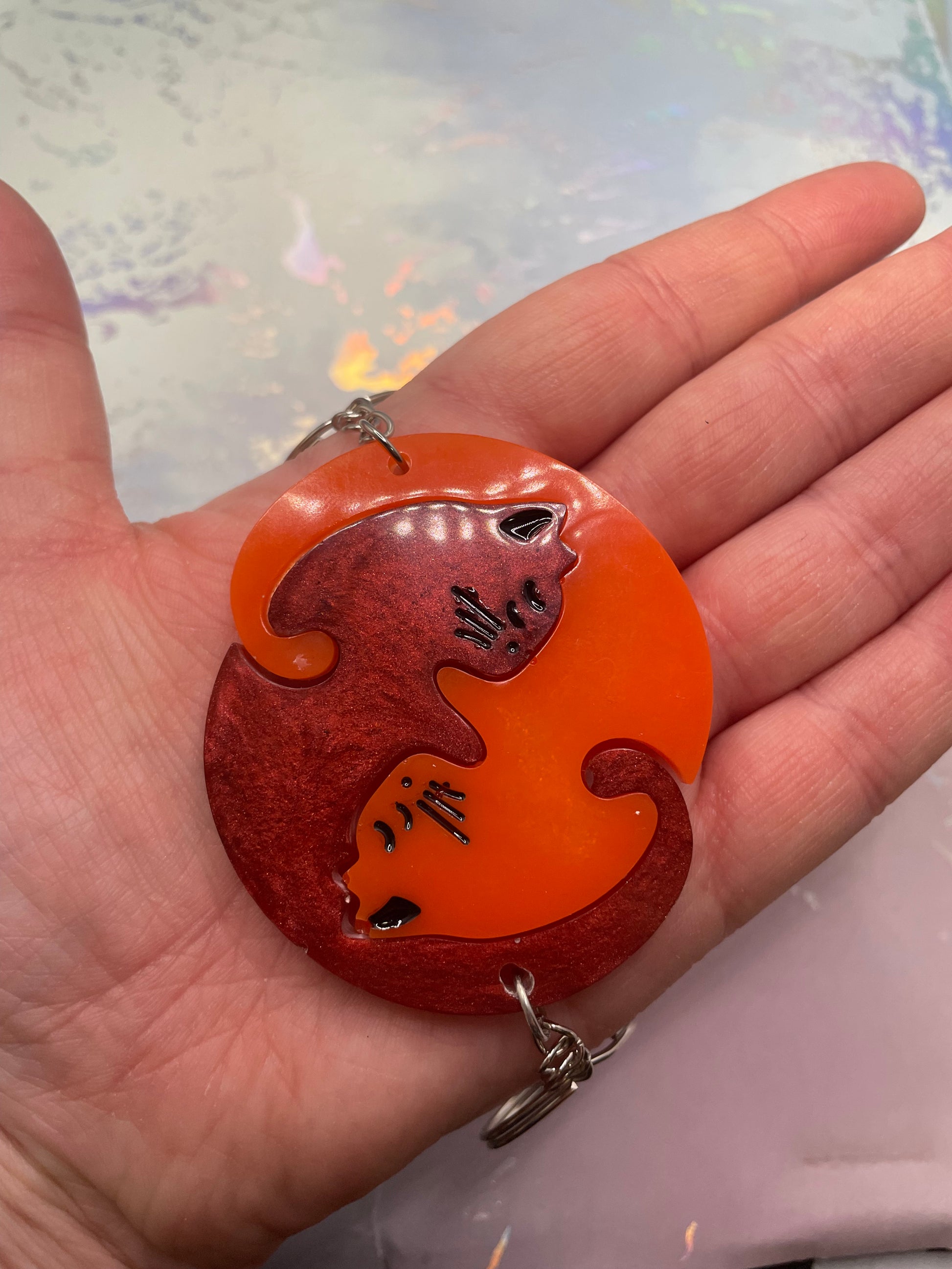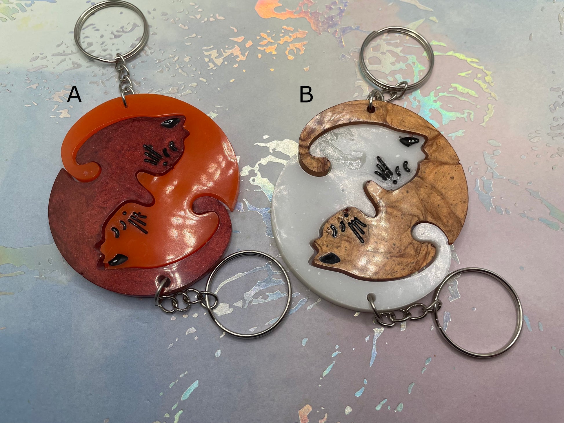 This striking matching keychain set features two stylized cats that come together in a circular, yin-yang–inspired design. Each cat is individually cast and carefully assembled to create a balanced, sculptural piece that feels both playful and refined. Crafted from resin and enhanced with mica powder, the surface reveals subtle depth, soft shimmer, and rich color variations that make every set truly one of a kind.