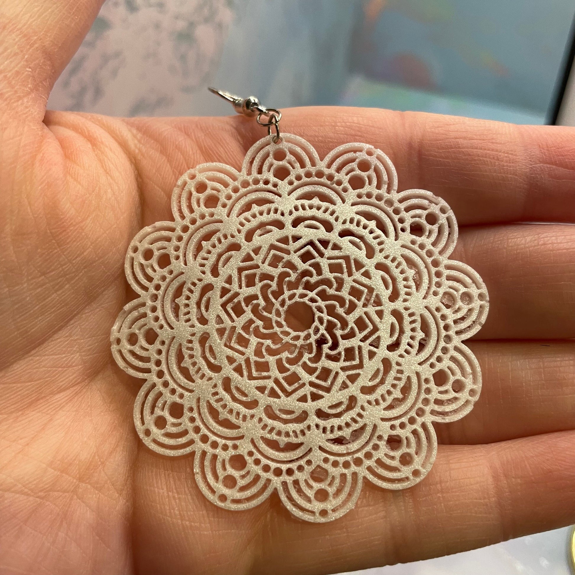 Each pair showcases a finely detailed mandala design made from smooth liquid clay, giving a soft lace-like texture that’s both modern and timeless.