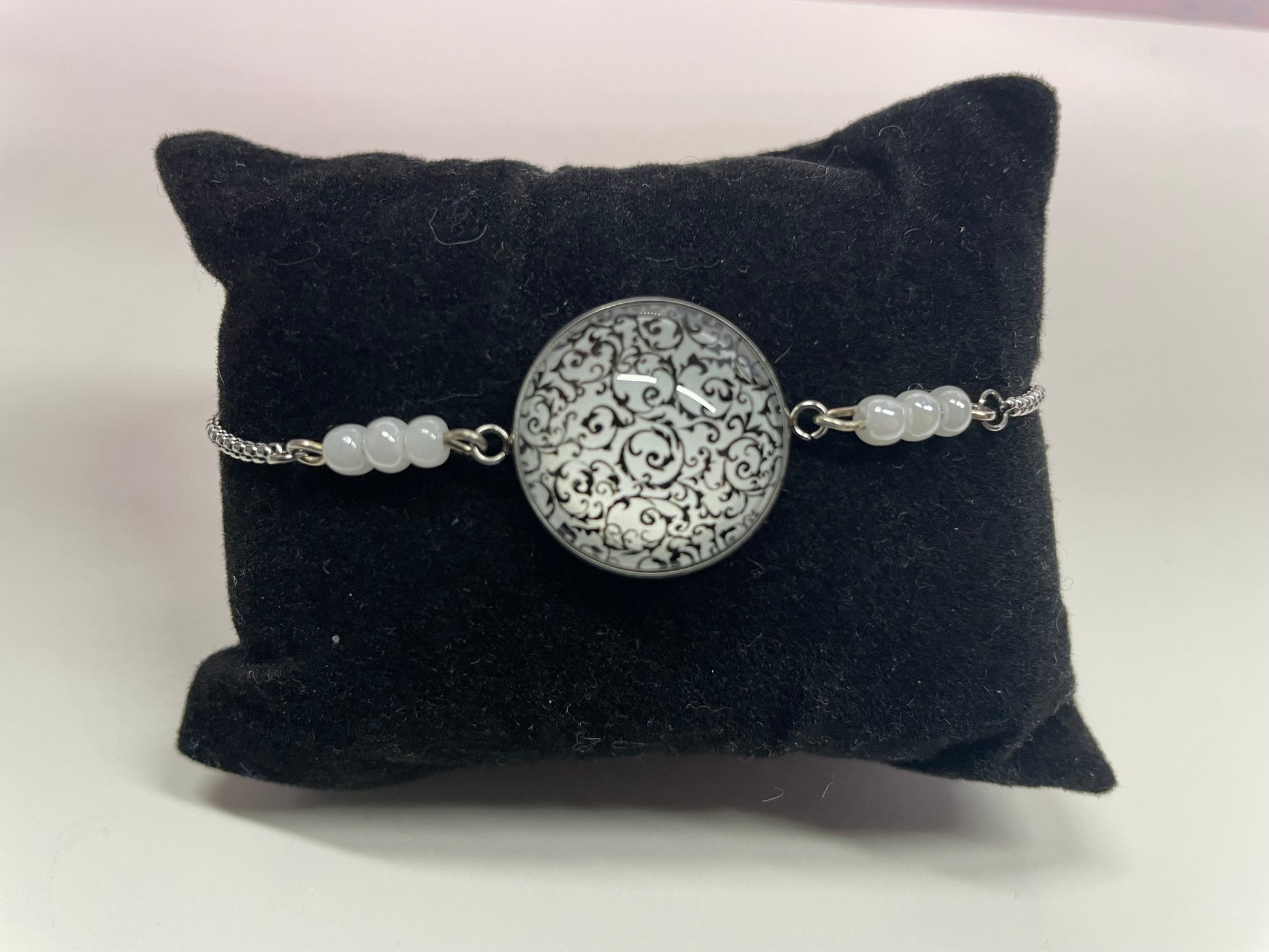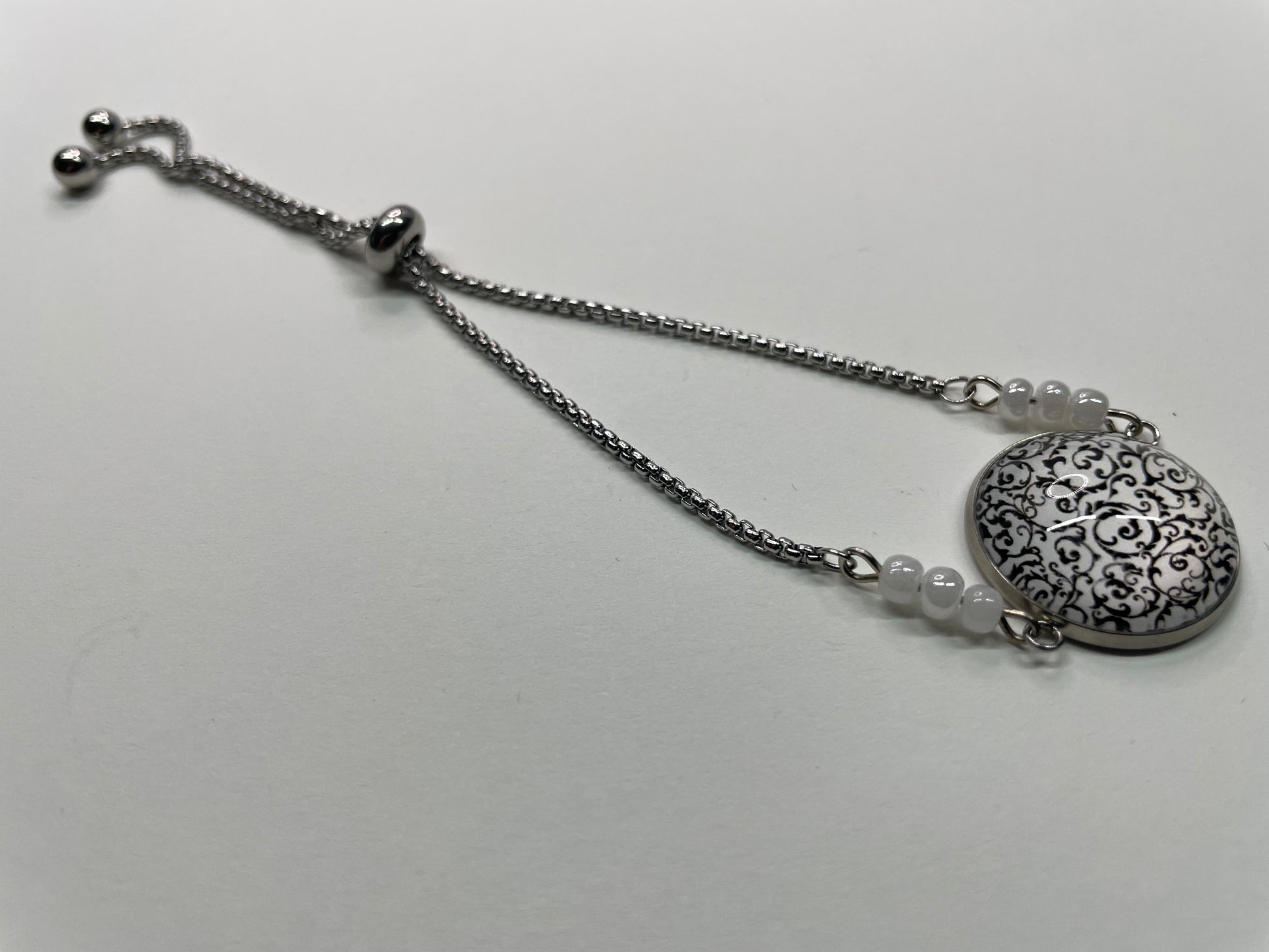 This elegant adjustable bracelet features a 20 mm round cabochon showcasing a delicate black scroll pattern on a soft white background. Framed with polished stainless steel, the central cabochon is beautifully accented by smooth 4 mm white beads on each side, adding balance and subtle texture to the design.